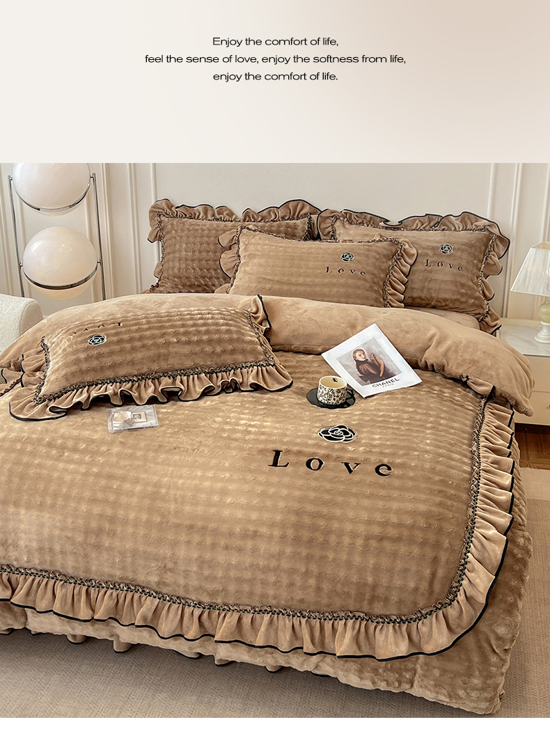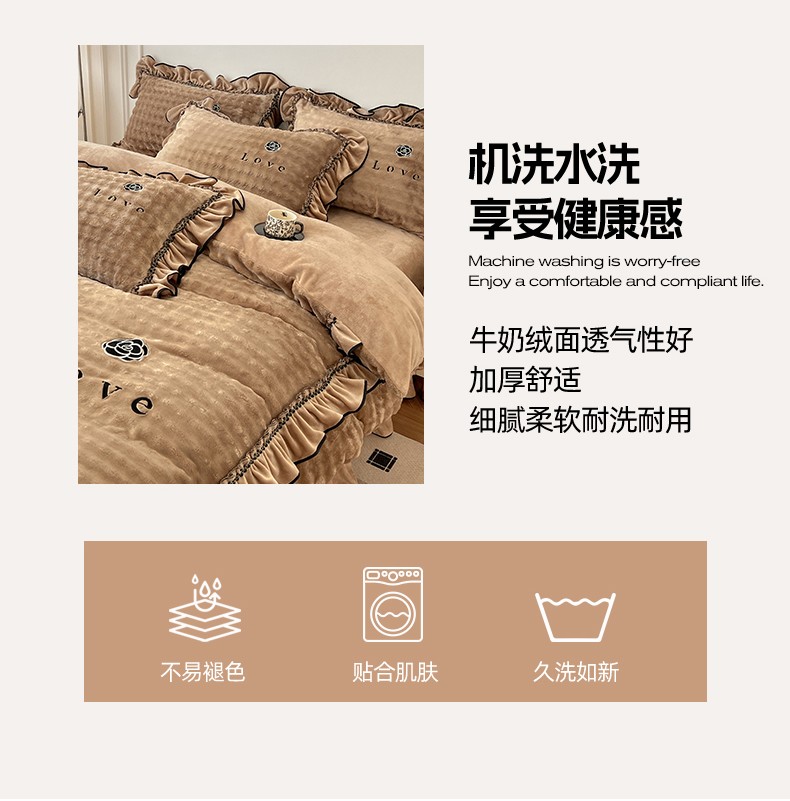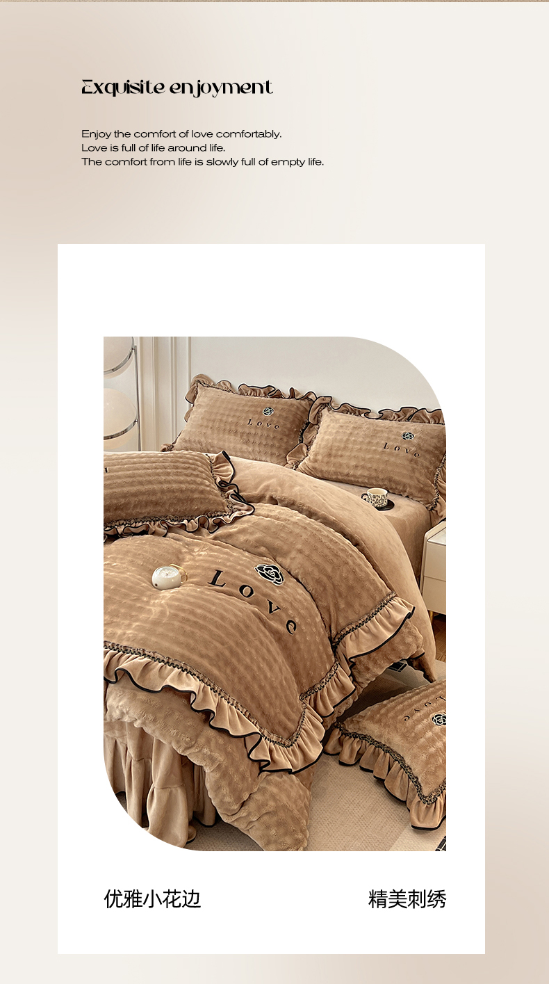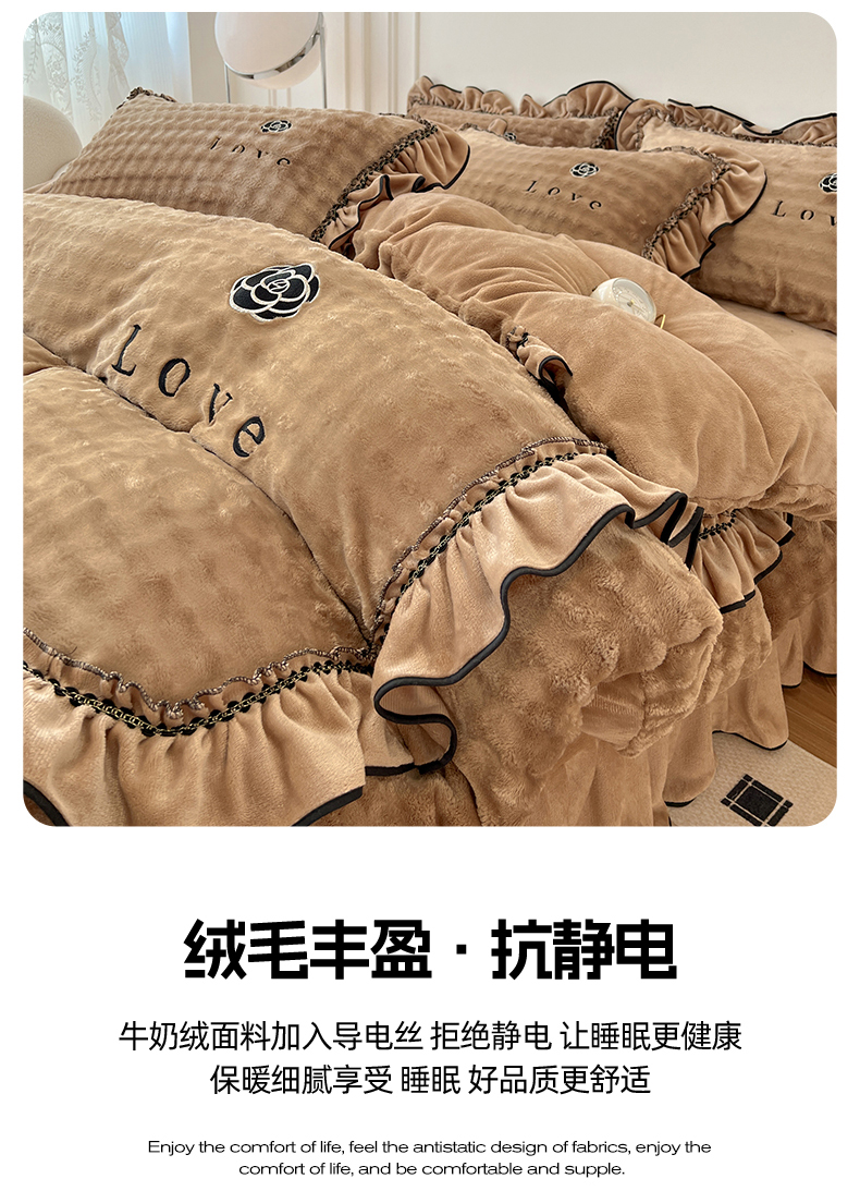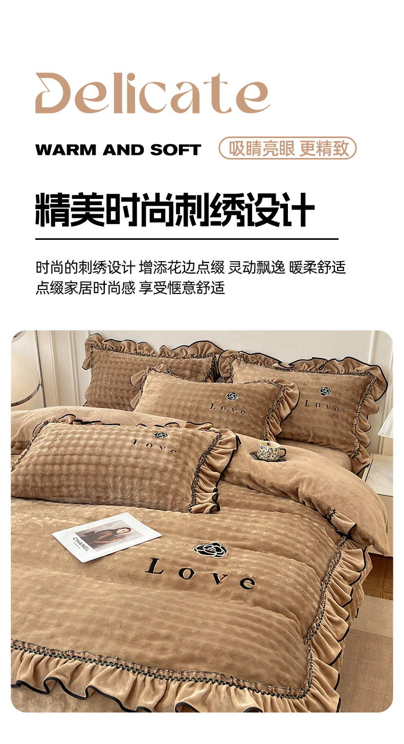 商品名称:言熙居家纺 2025新款牛奶绒绣花四件套 Love-卡其