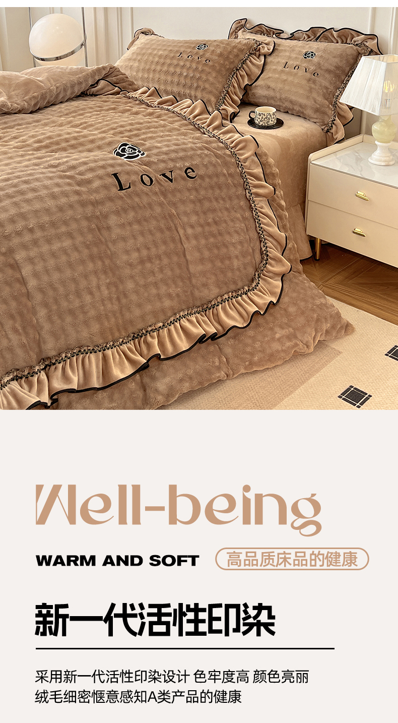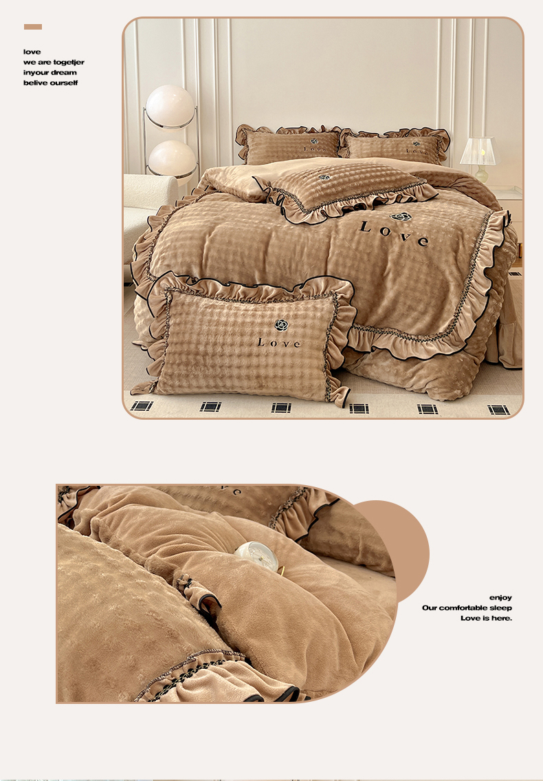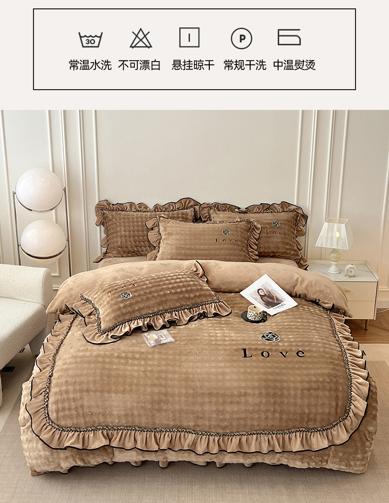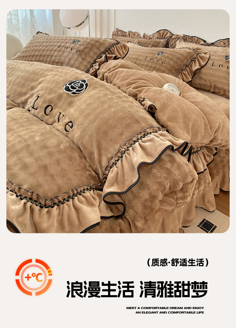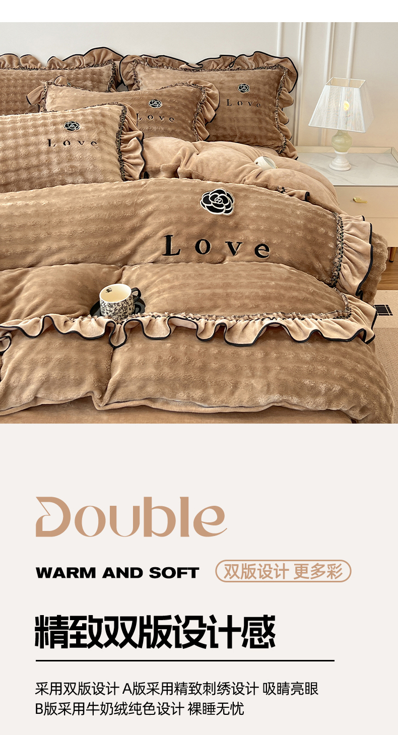 商品名称:言熙居家纺 2025新款牛奶绒绣花四件套 Love-卡其