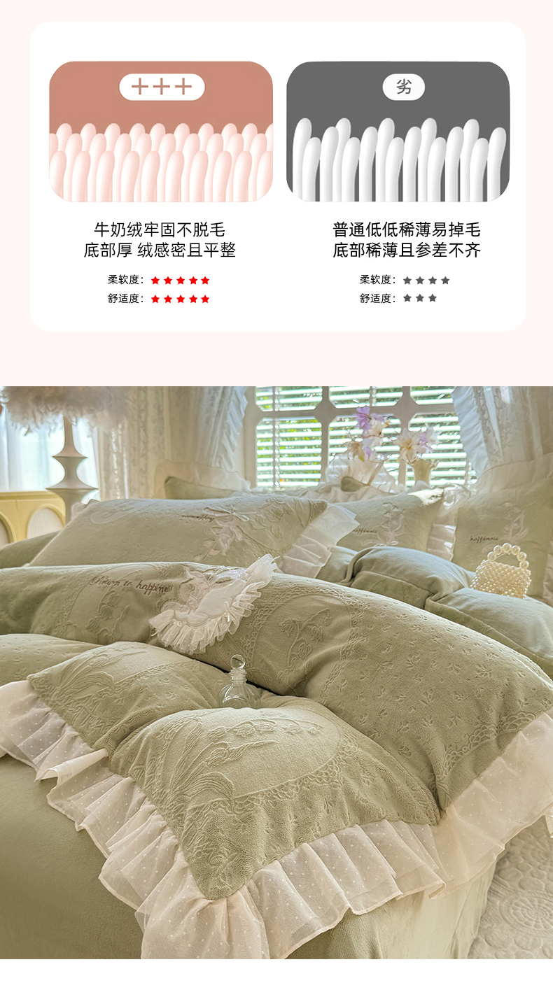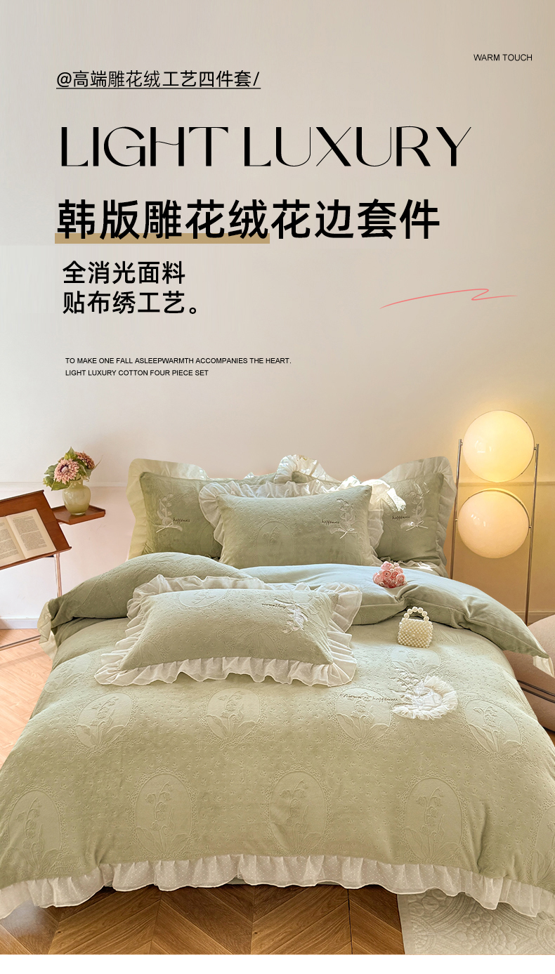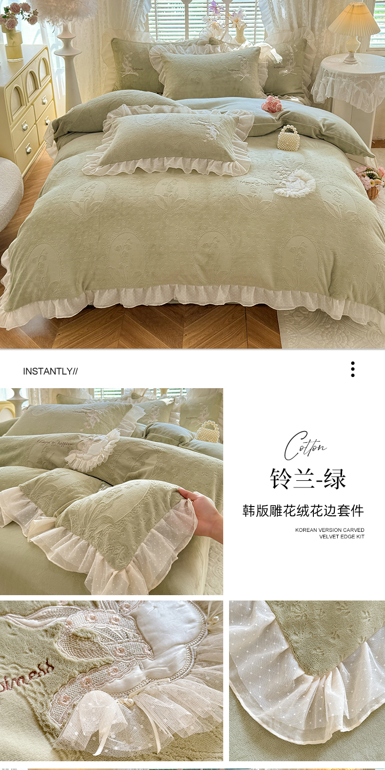 (总)艾唯希家纺 2025新款韩版全消光雕花绒花边四件套牛奶绒-铃兰花边系列,铃兰-绿,铃兰-米,铃兰-粉,铃兰-浅紫,铃兰-蓝