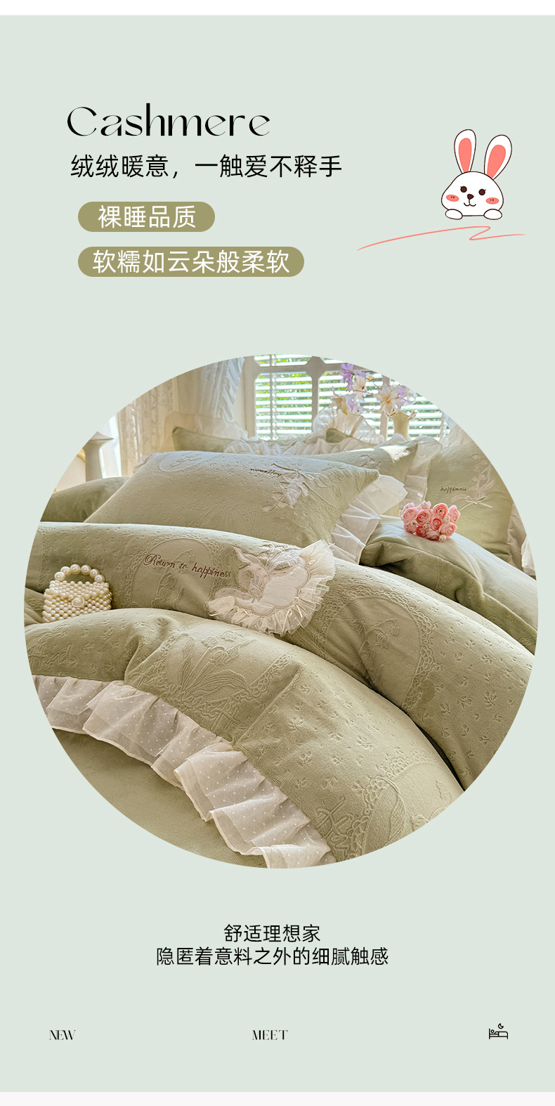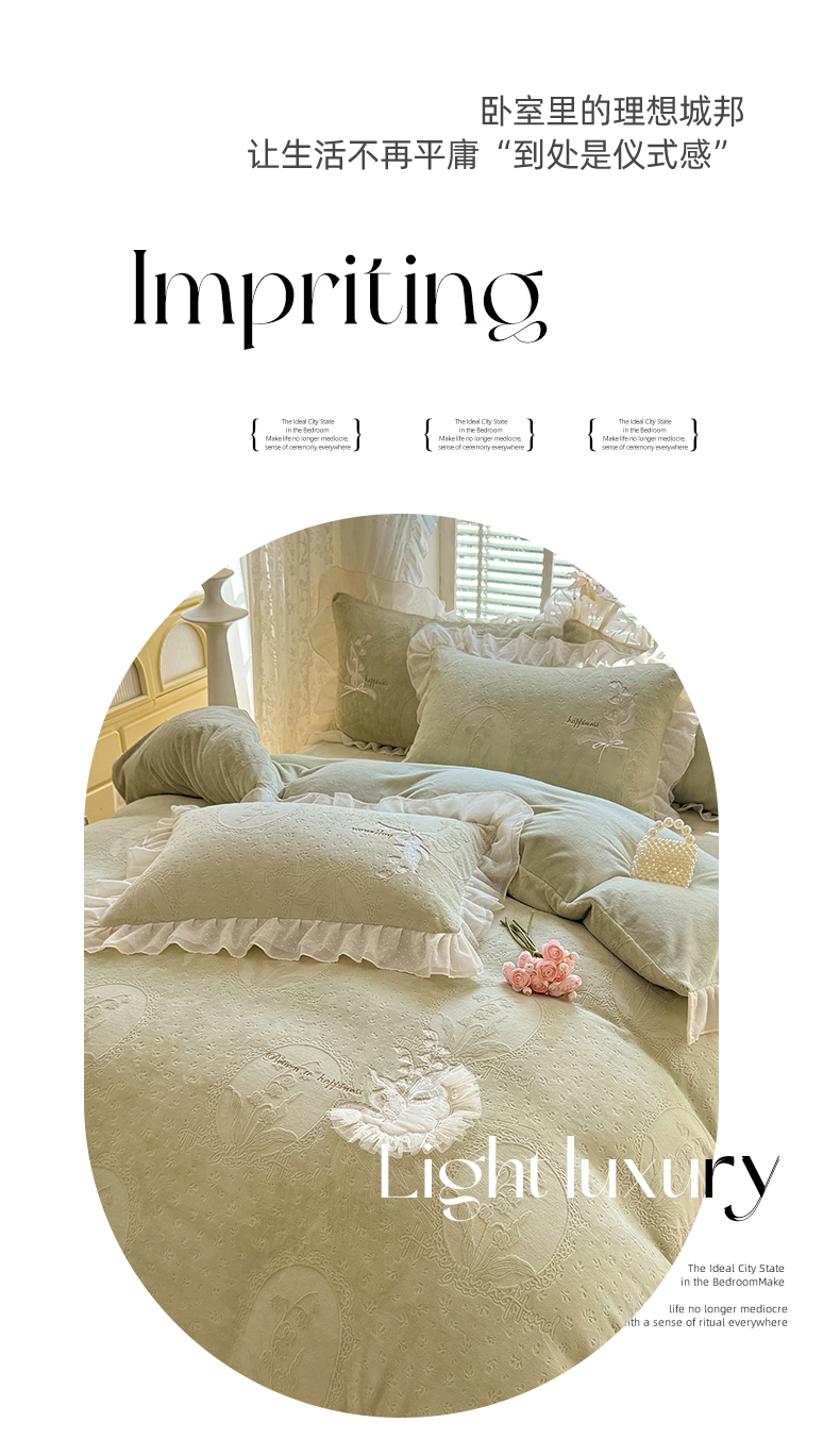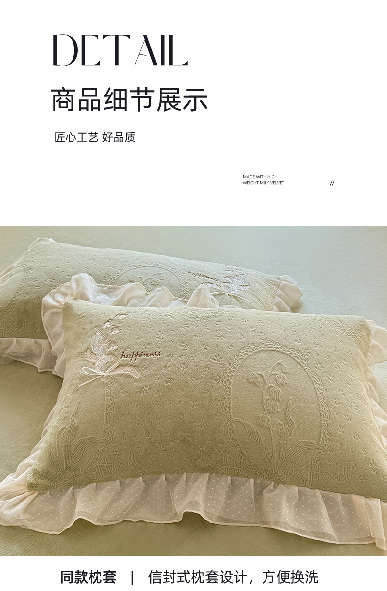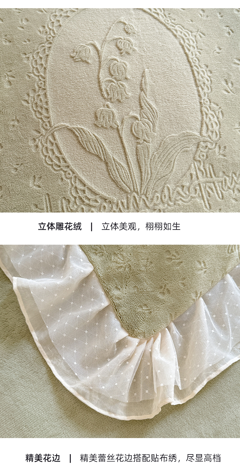 商品名称:(总)艾唯希家纺 2025新款韩版全消光雕花绒花边四件套牛奶绒-铃兰花边系列