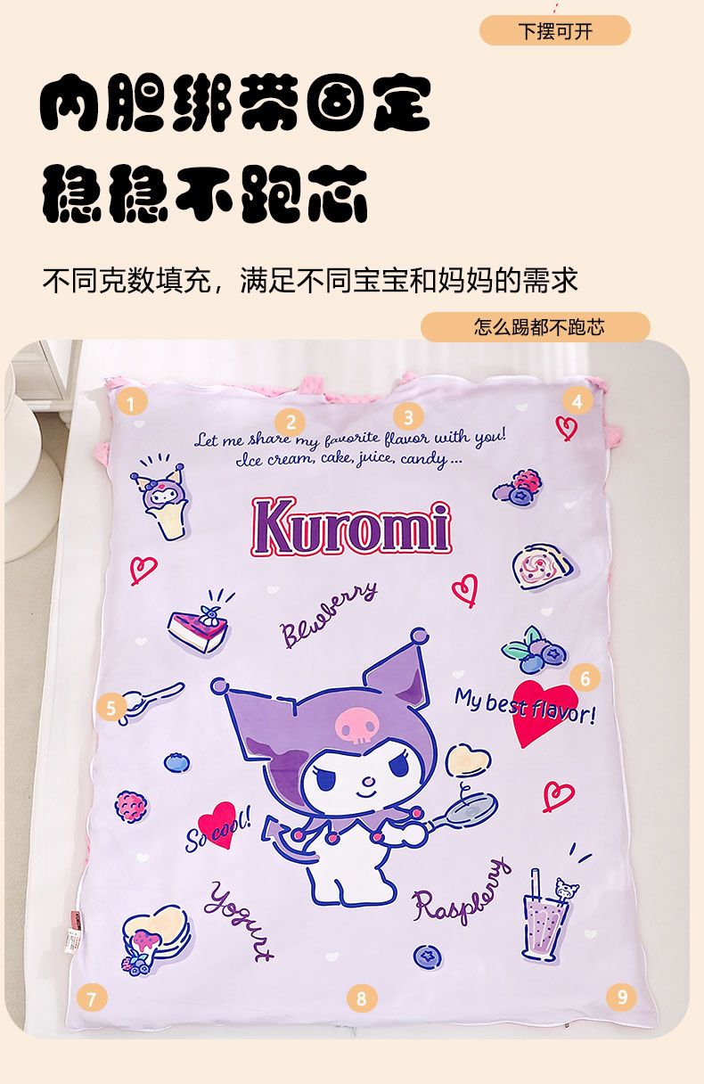 • 91家纺网 家纺一手货源 找家纺 八零年代 2025新款三丽鸥正版分体式可拆洗睡袋宝宝绒保暖儿童防踢被豆豆绒一体被 分体式可拆睡袋-炫彩库洛米
