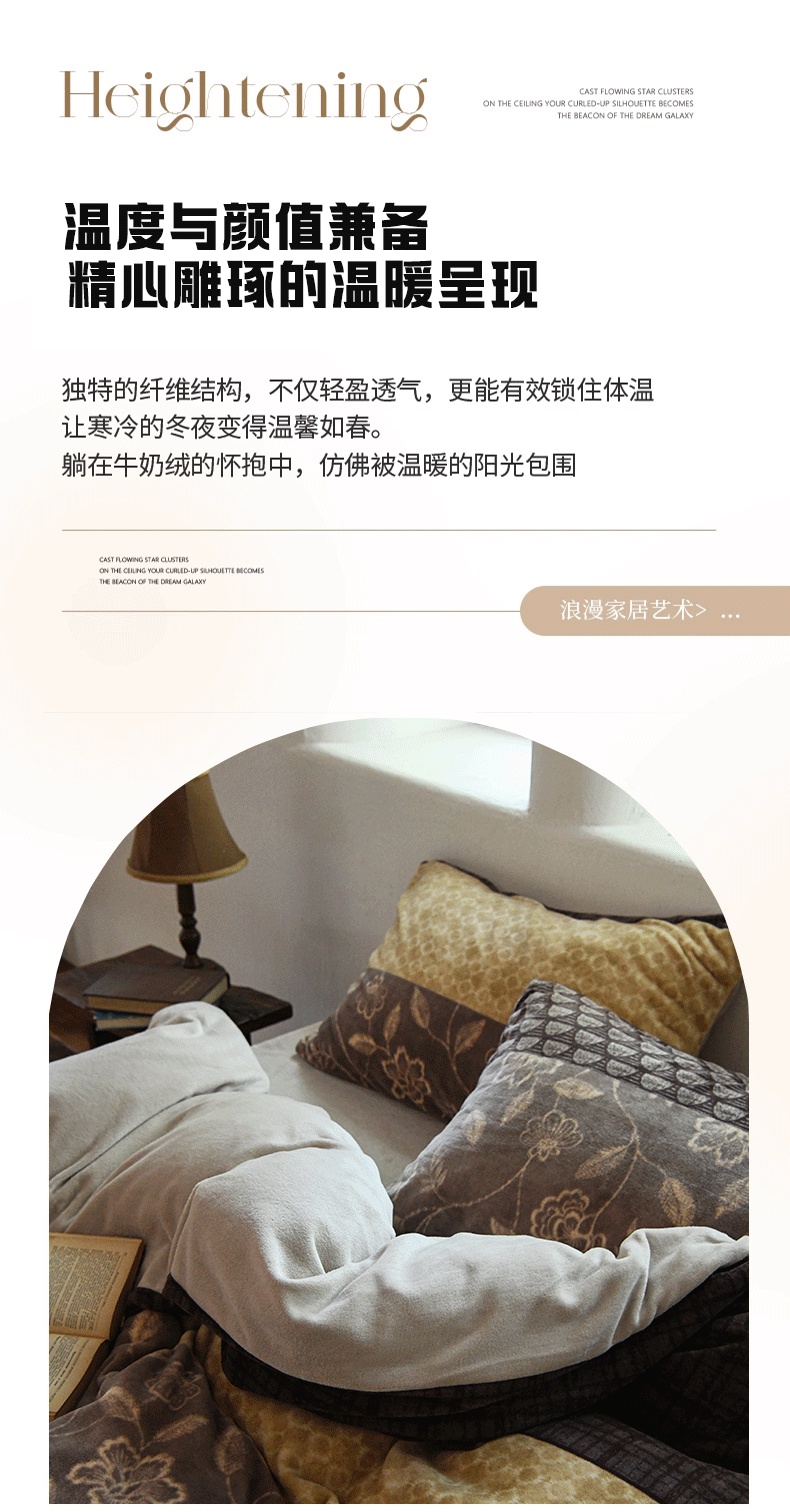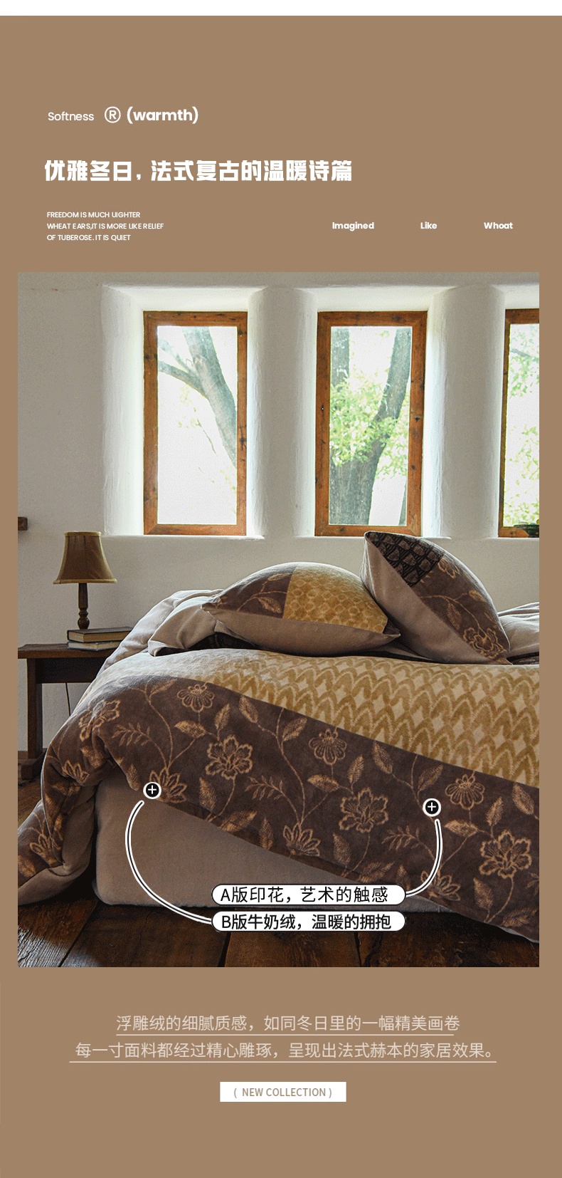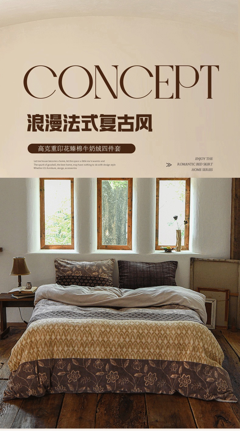 当前位置: 91家纺网 > 商品网购 > 床品套件 > 四件套 > 牛奶绒四件套 > 花漾家居 2025秋冬新品法式复古简约诧寂风牛奶绒四件套 雅之曼咖