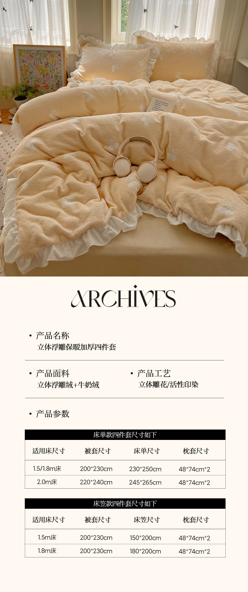 (总)三朵家纺 2024新款3D立体浮雕花边保暖加厚四件套,馥郁芳芬,花园小径粉,花园小径黄,绿野仙踪,暖暖花语