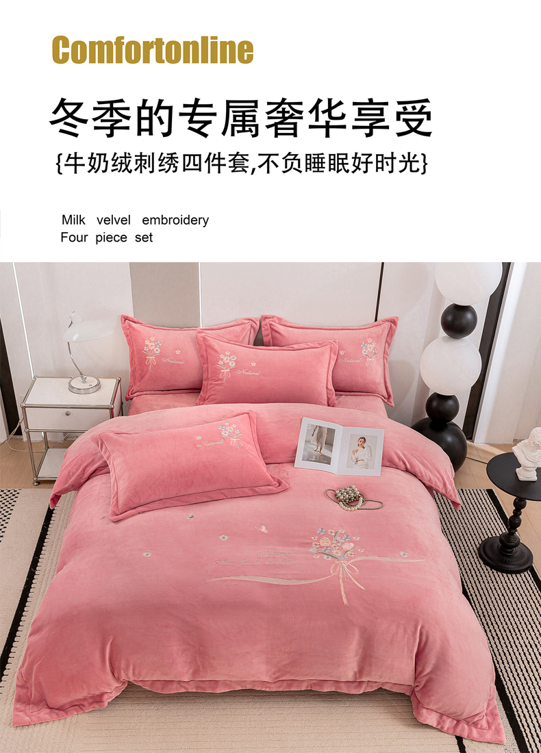 (总)绒博士 2025新款270克牛奶绒双拼角刺绣宽边款四件套--维也纳系列,维也纳-粉豆沙,维也纳-果绿,维也纳-浅咖,维也纳-浅蓝