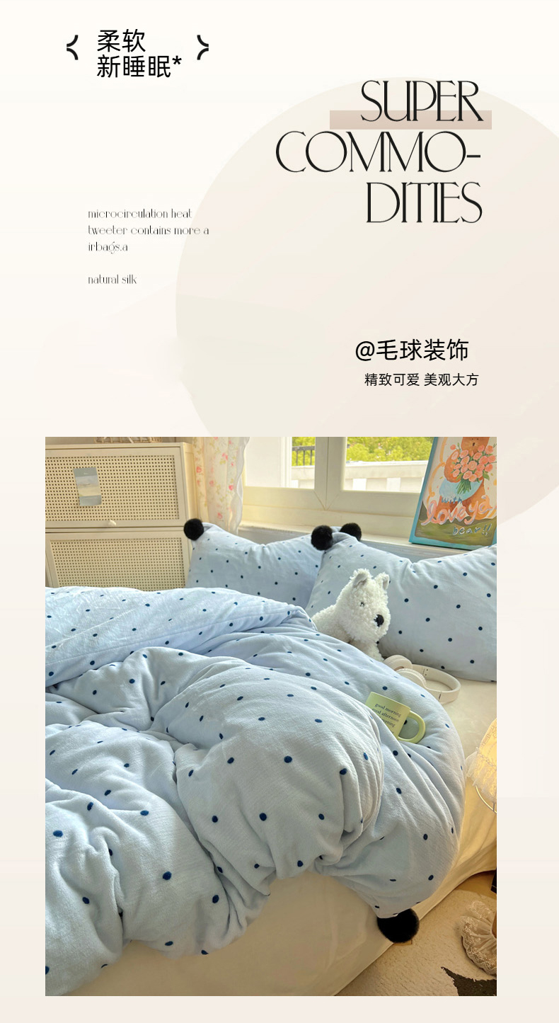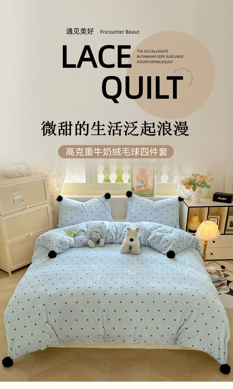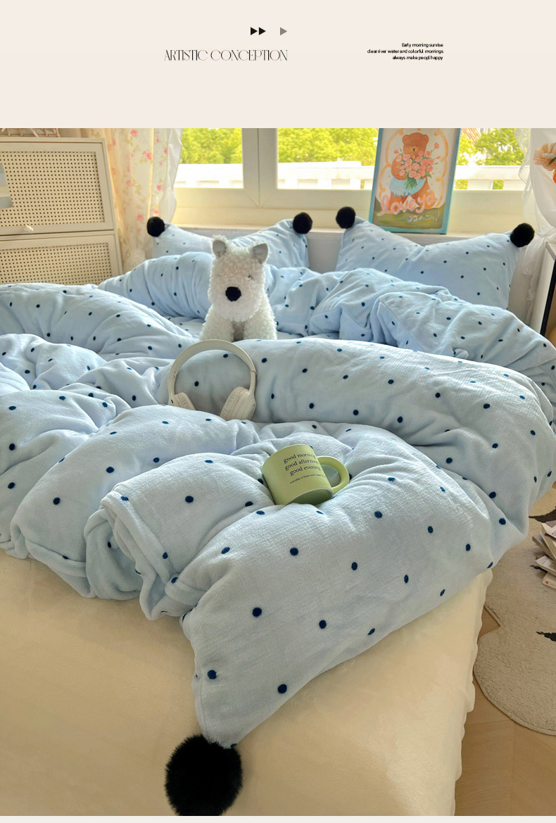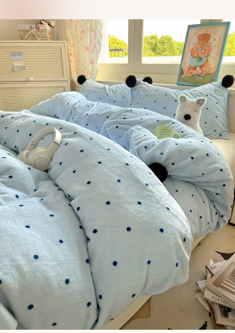 当前位置: 91家纺网 > 商品网购 > 床品套件 > 四件套 > 牛奶绒四件套 > 丽涵家纺 2025秋冬新品混搭波点牛奶绒四件套三件套-拍摄风格二 波点-蓝色