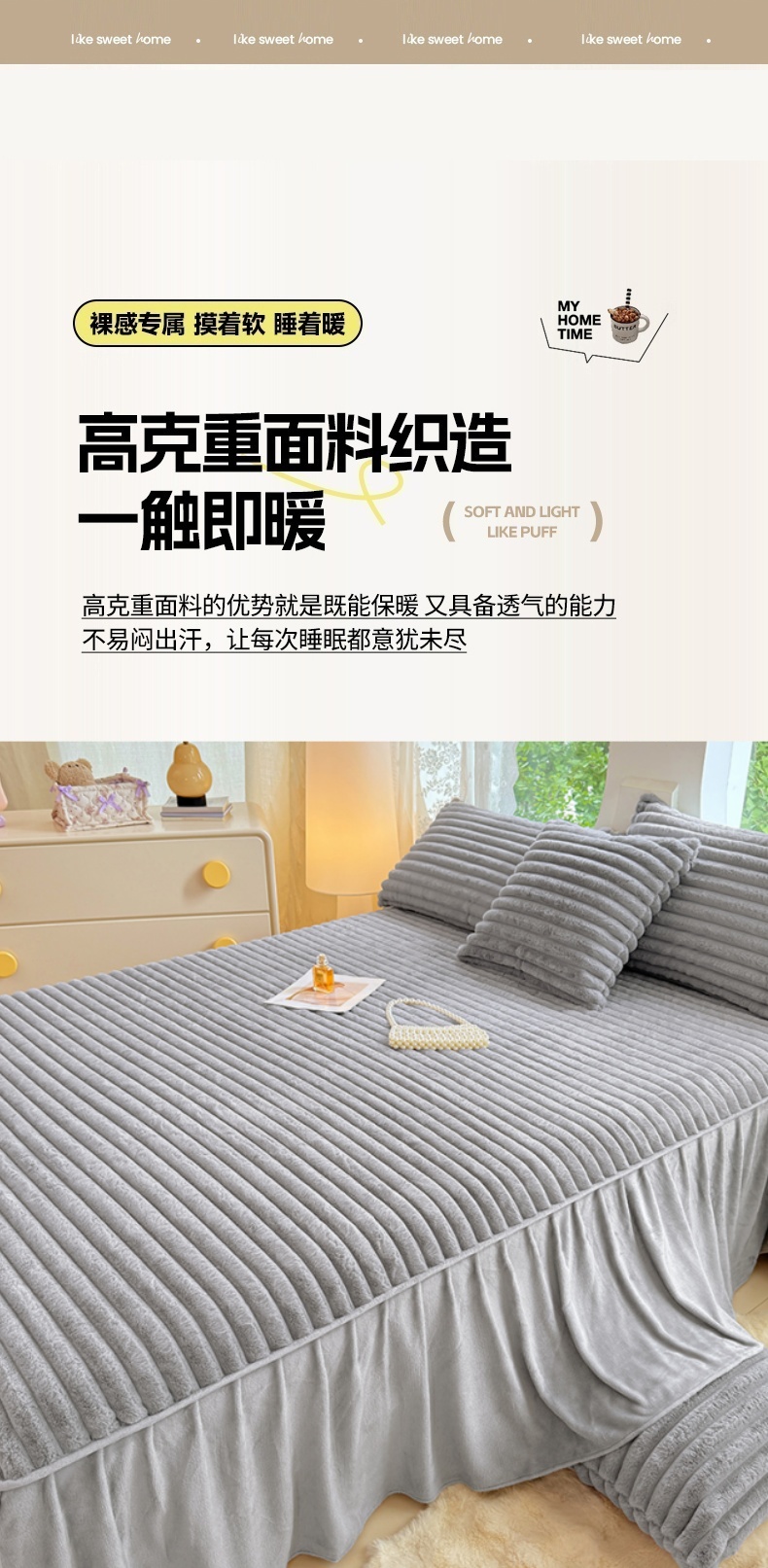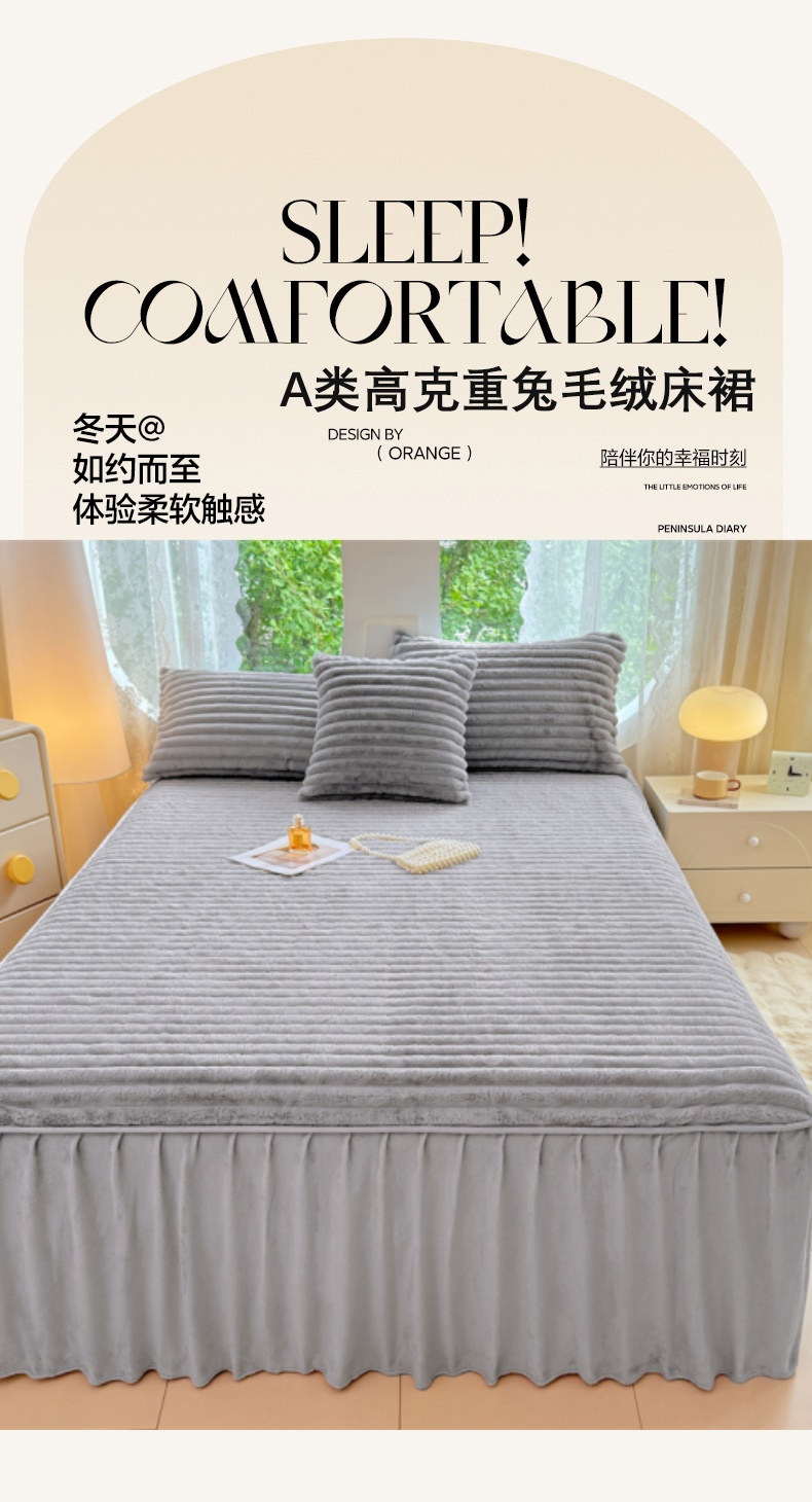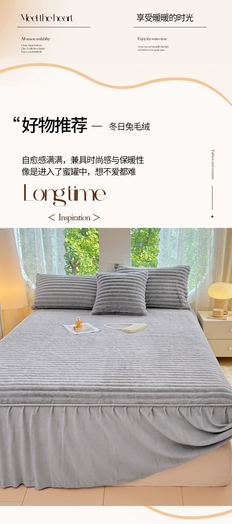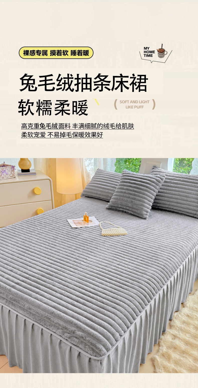 商品名称:梦舒羽 2025新款兔毛绒床裙法兰绒床垫保护罩牛奶绒床垫法莱绒床单罩-抽条 兔毛绒抽条-烟雨灰