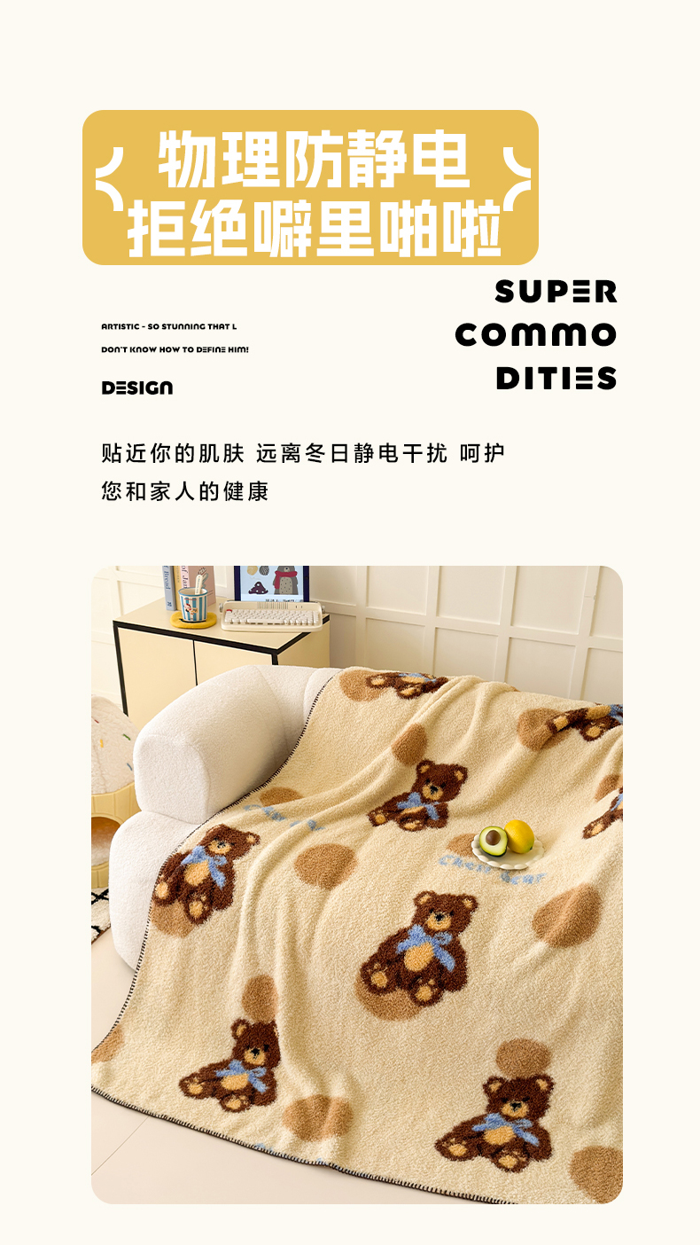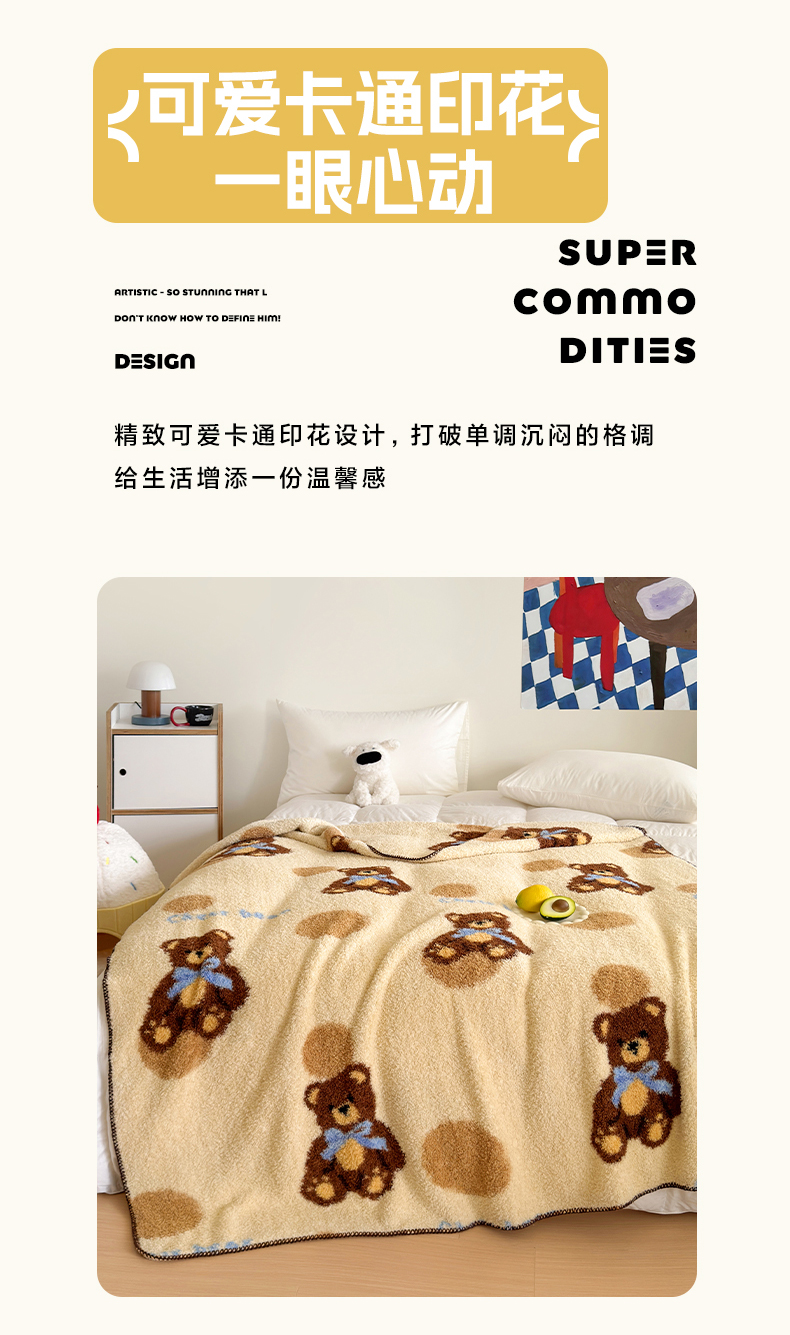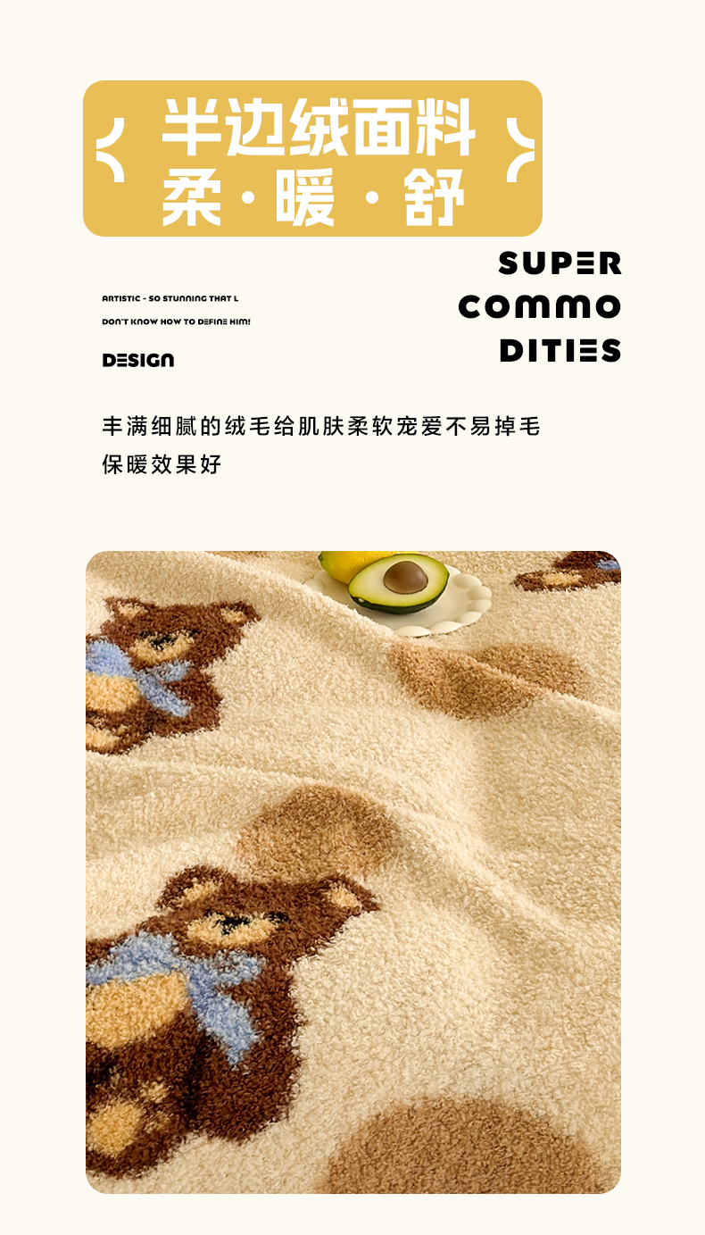 商品名称:舒隅家纺 2025新款A类卡通休闲半边绒三角针毛毯 小熊软糖