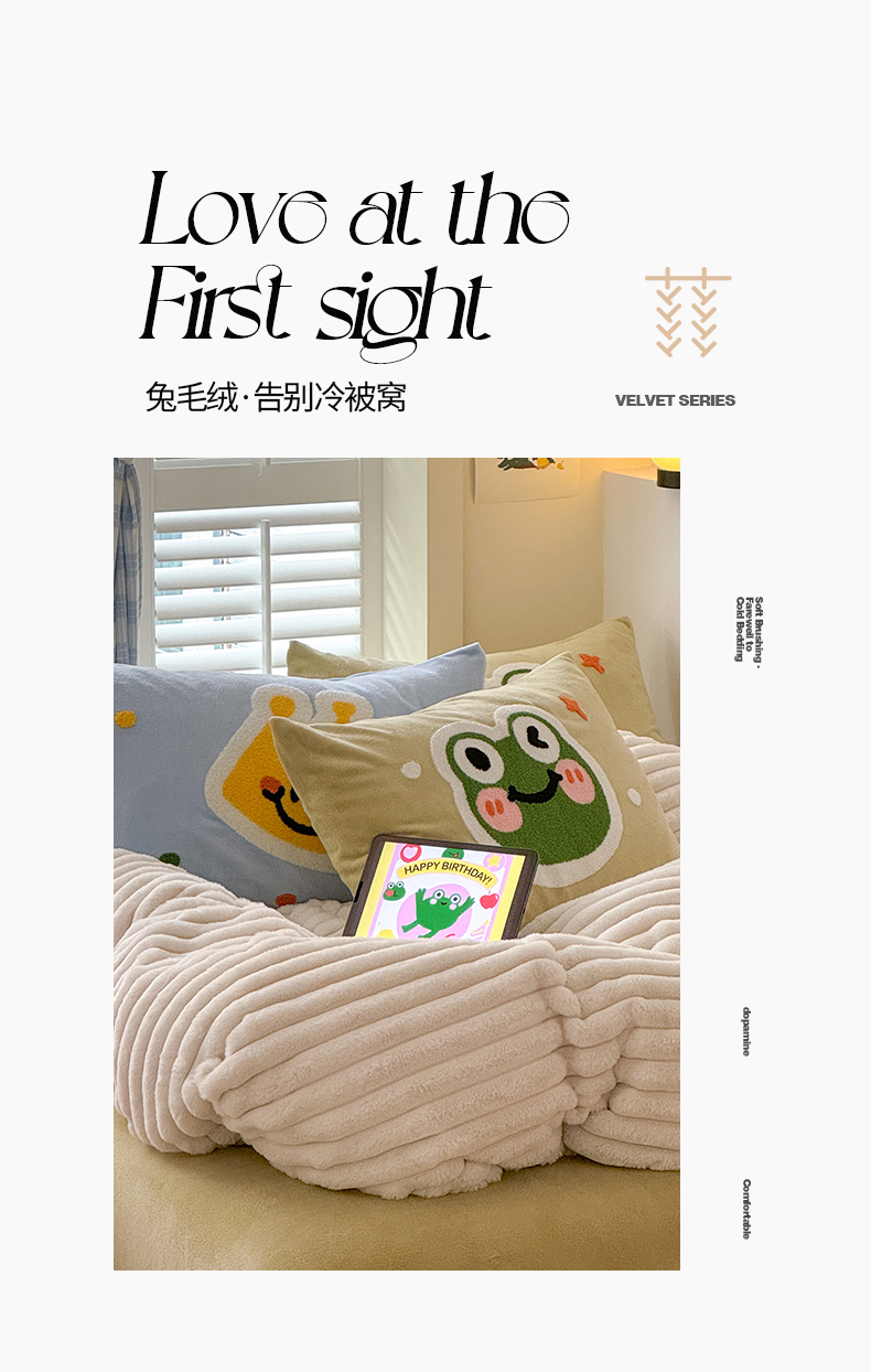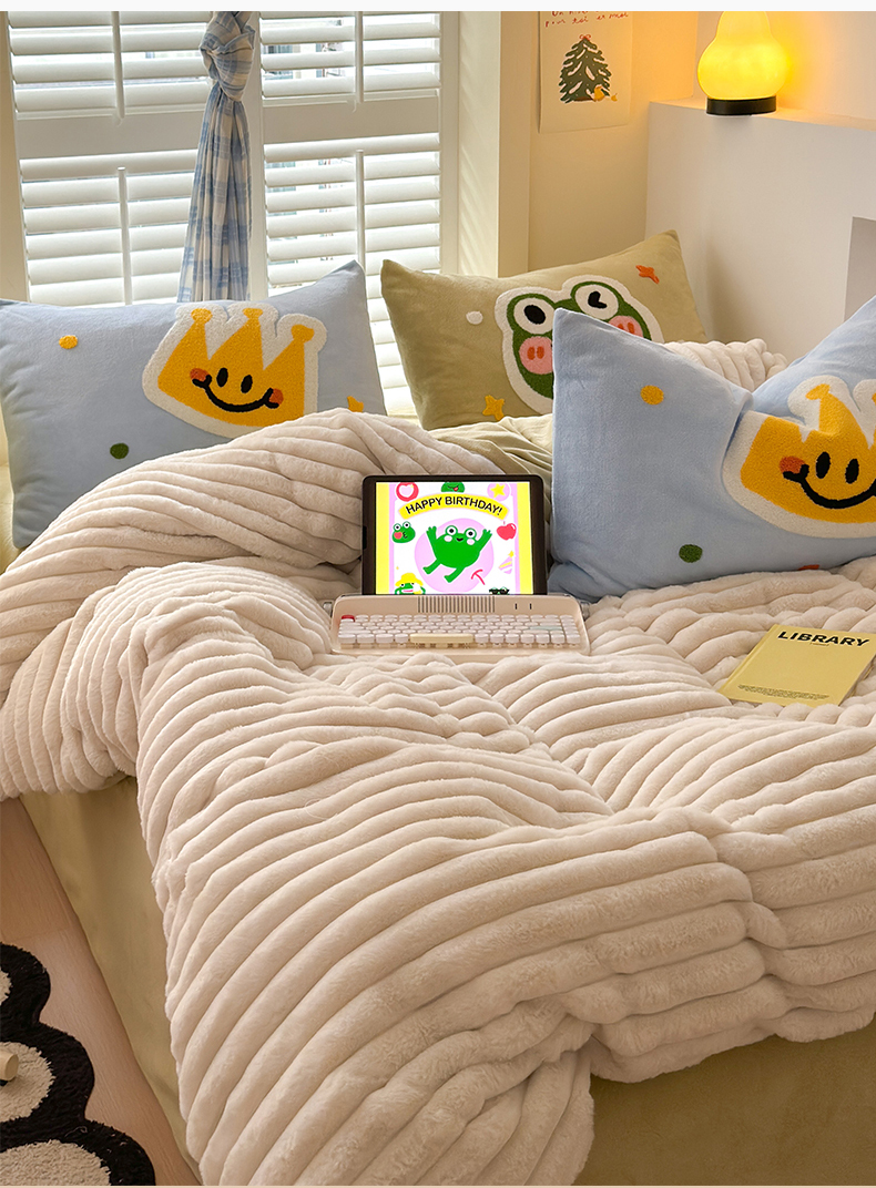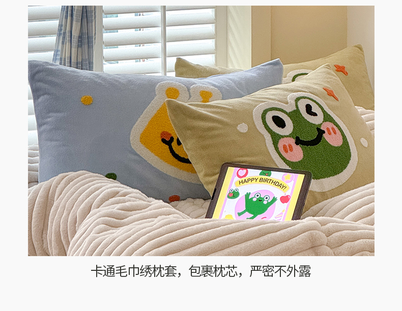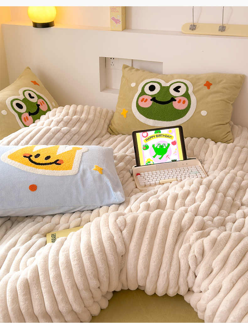 当前位置: 91家纺网 > 商品网购 > 床品套件 > 四件套 > 兔毛绒四件套 > 懒猫家纺 2025新款多巴胺毛巾绣兔毛绒抽条四件套系列 青蛙王子