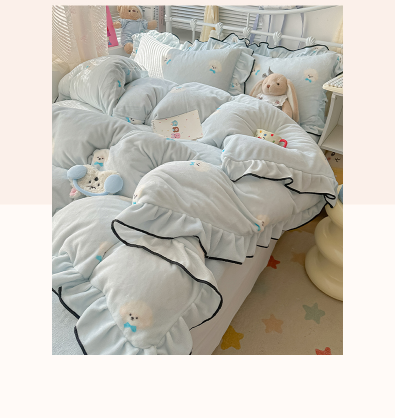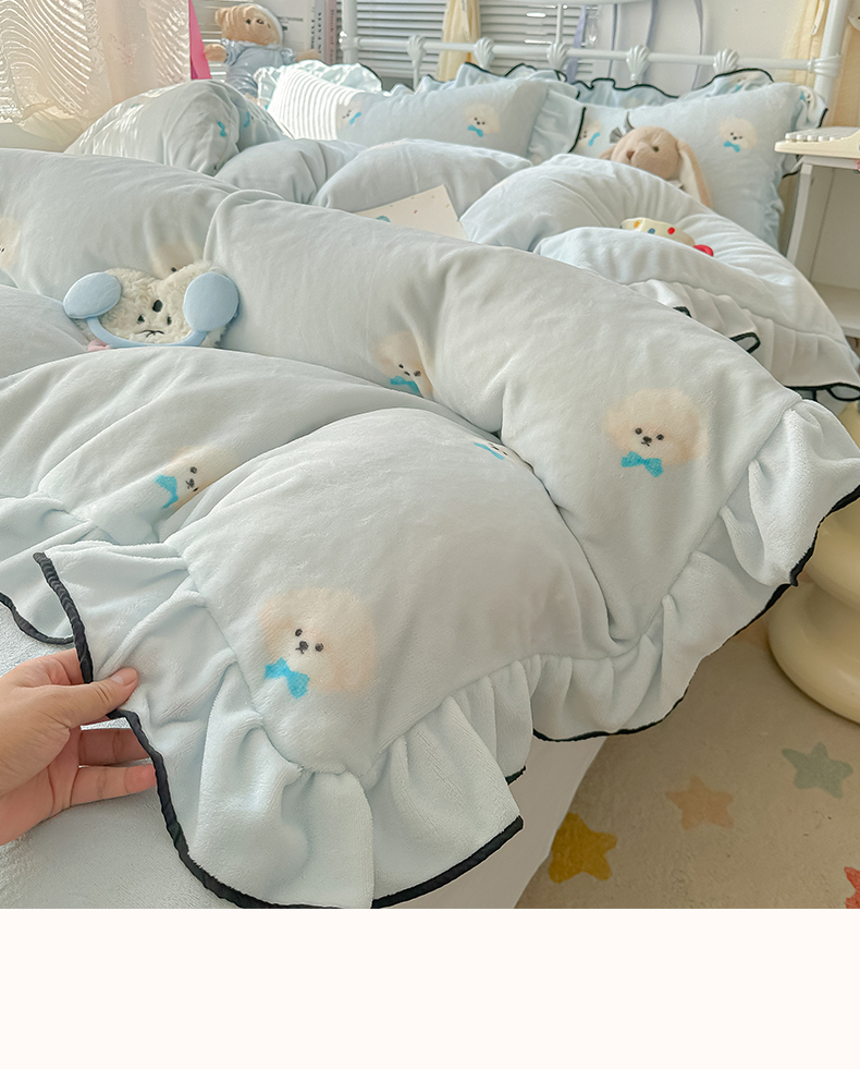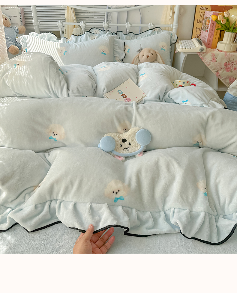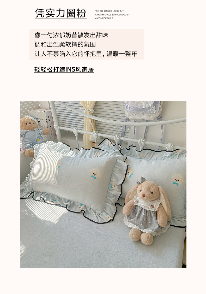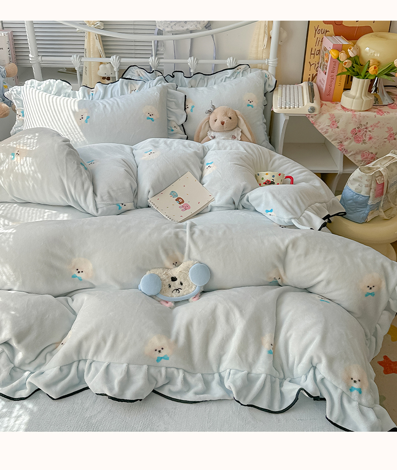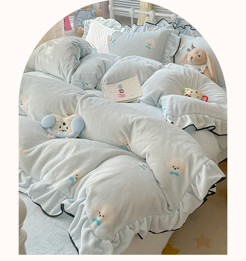 当前位置: 91家纺网 > 商品网购 > 床品套件 > 四件套 > 牛奶绒四件套 > 韩都家居 2025新款亲肤舒适韩版温暖牛奶绒四件套-花边款 蝴蝶结小狗-兰