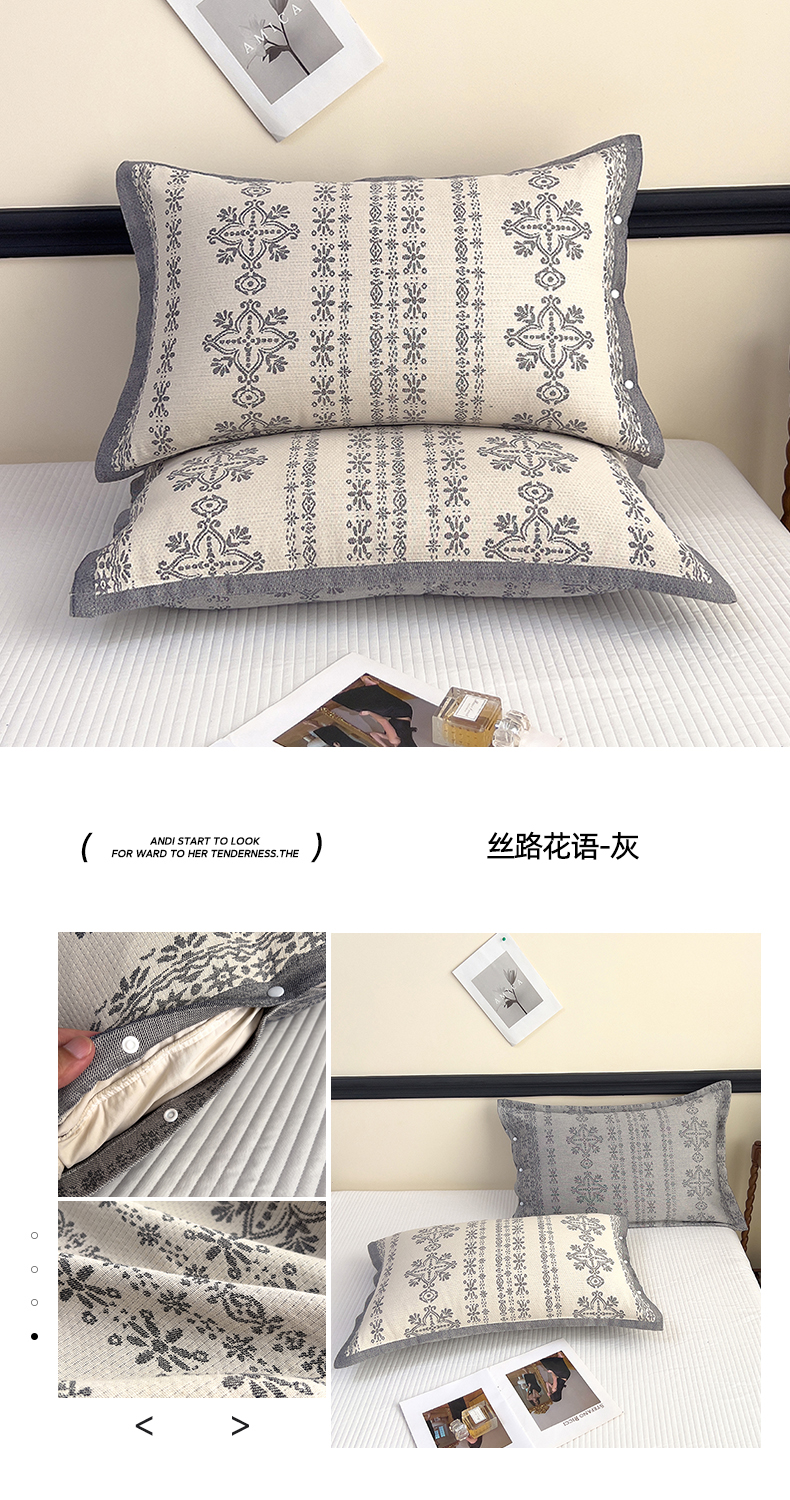 商品名称:悦然毛巾被 2025新款四层纱全棉纱布枕套 丝路花语-灰