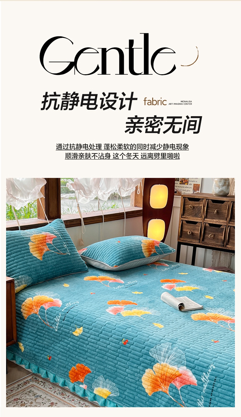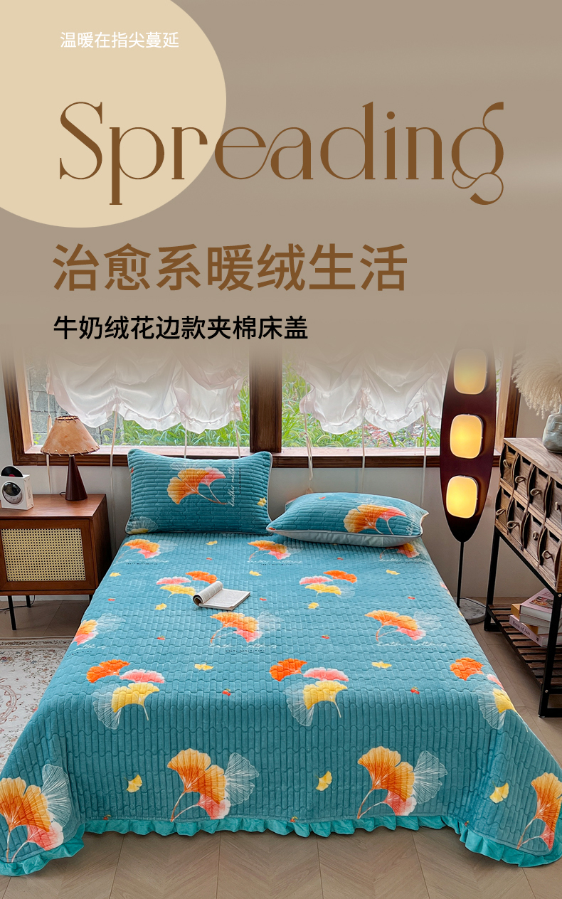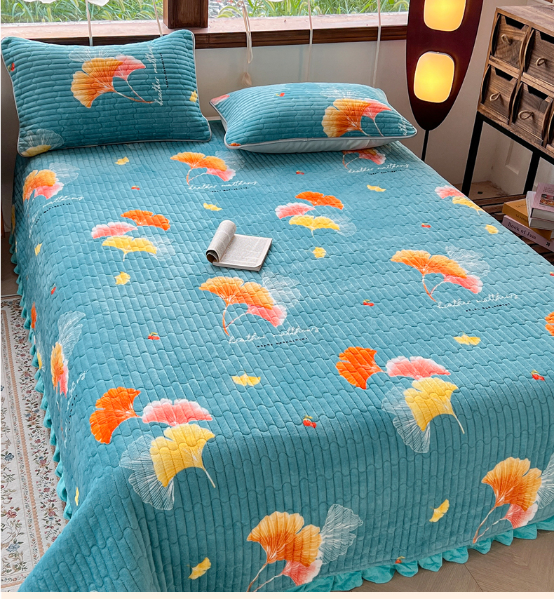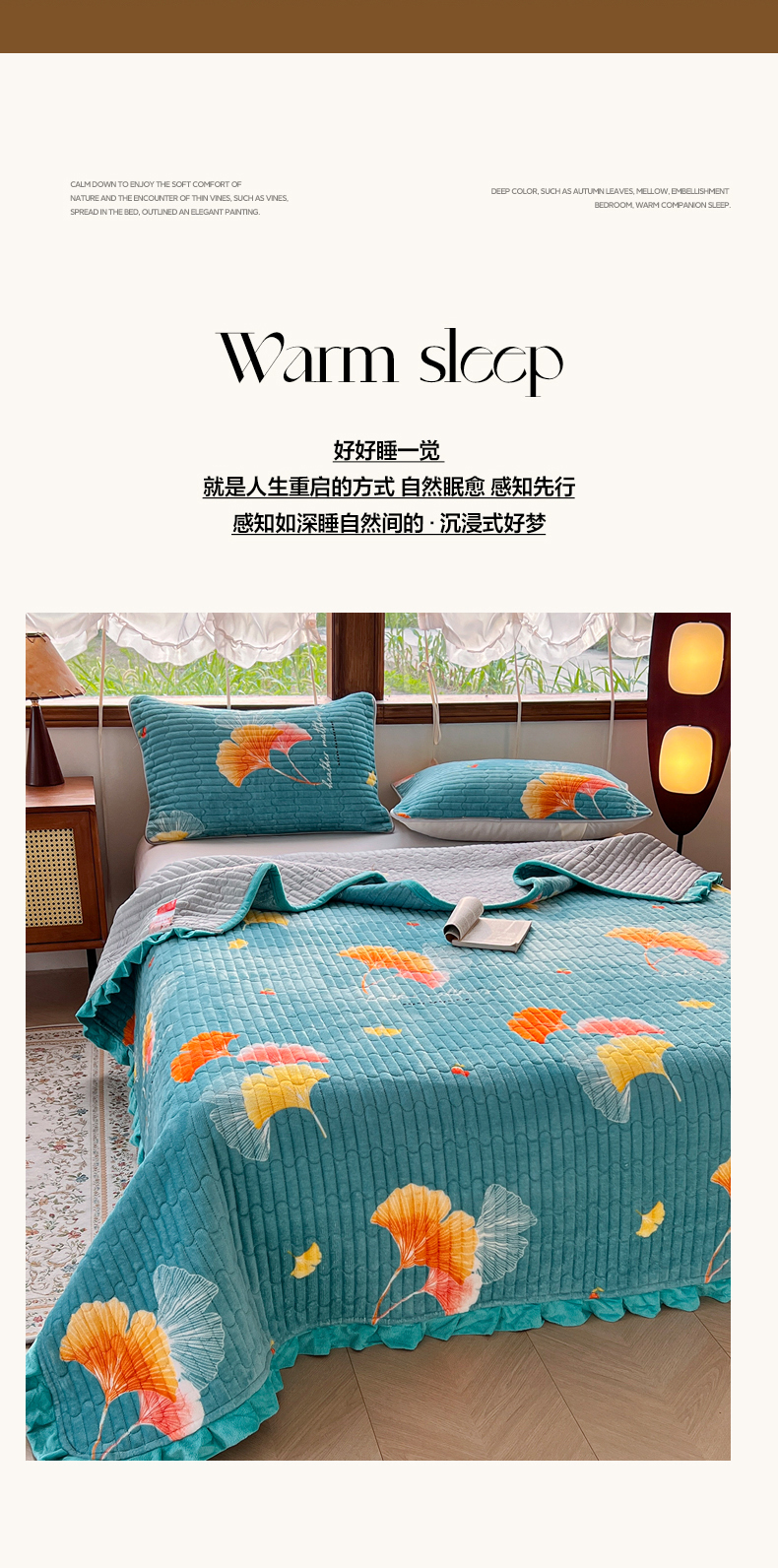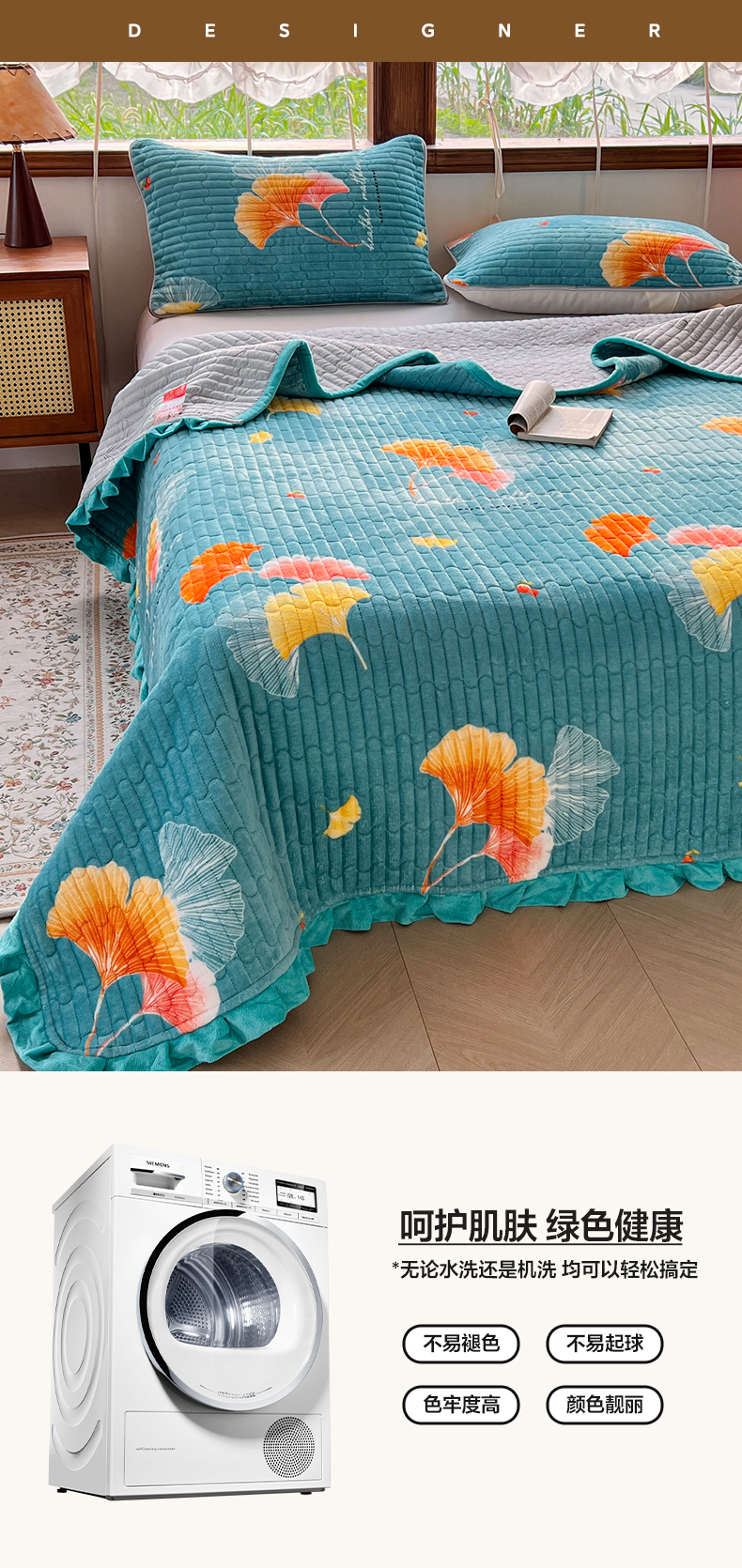 商品名称:默忆 2025新款牛奶绒夹棉花边韩版印花床盖三件套加厚保暖多功能单床盖 银杏叶-蓝
