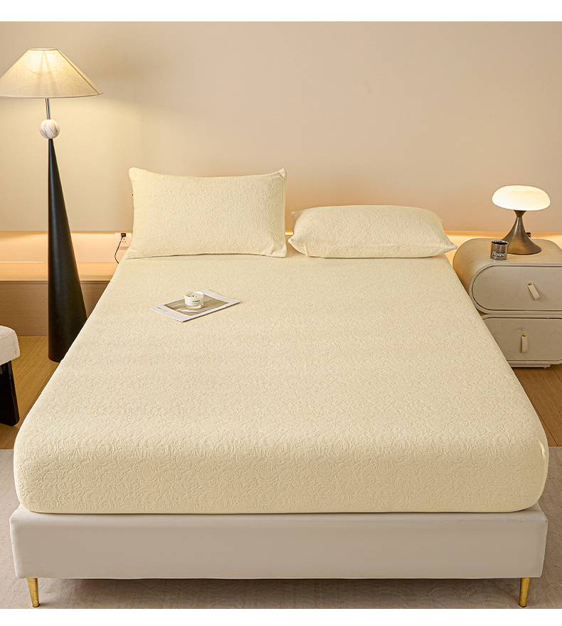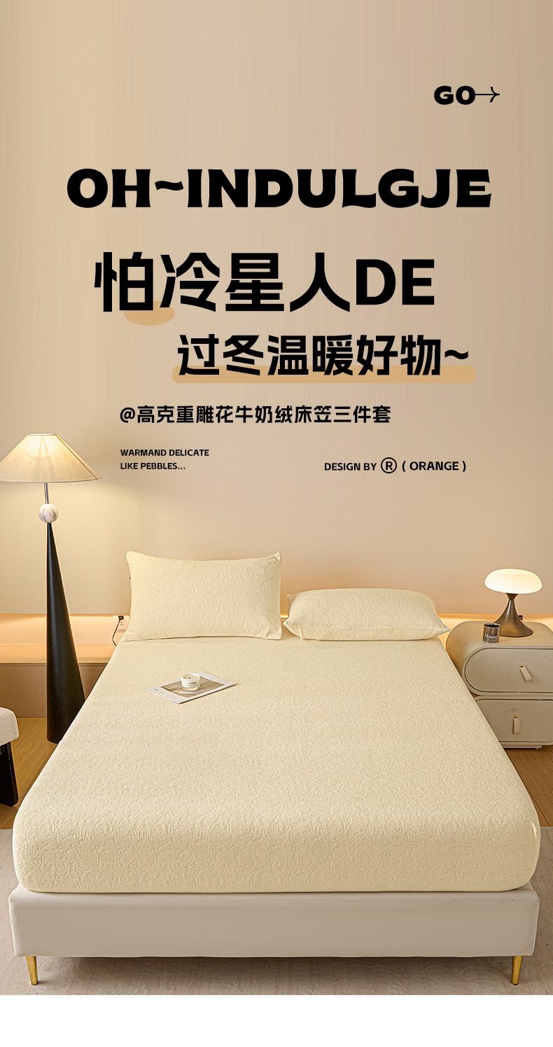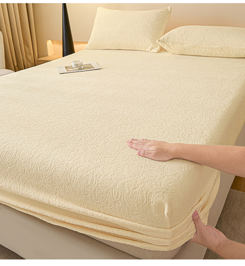 商品名称:佳汐蓝家纺 2025新款秋冬高克重牛奶绒雕花床笠三件套 那片花海(奶油黄)