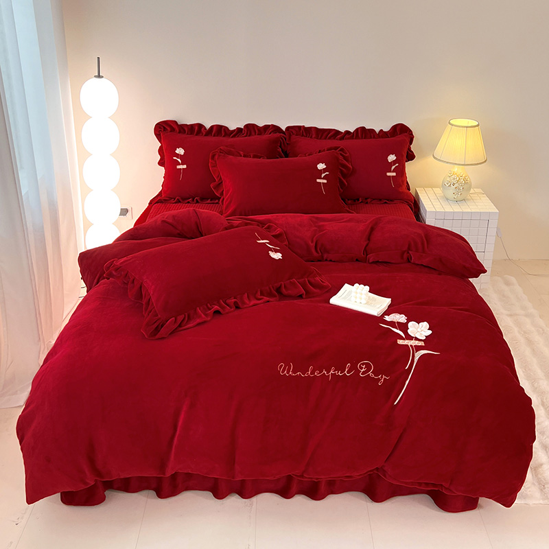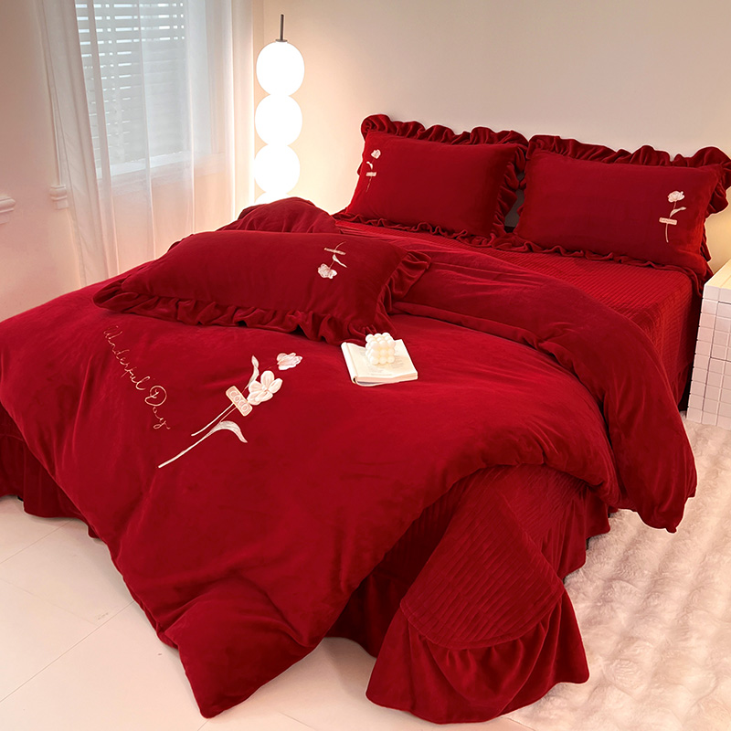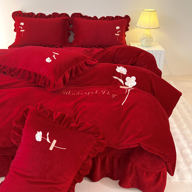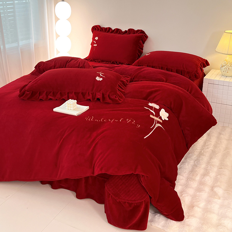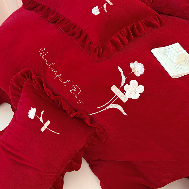 商品名称:梦莱斯 2025新款全消光床盖款牛奶绒刺绣四件套-山茶花 山茶花-大红