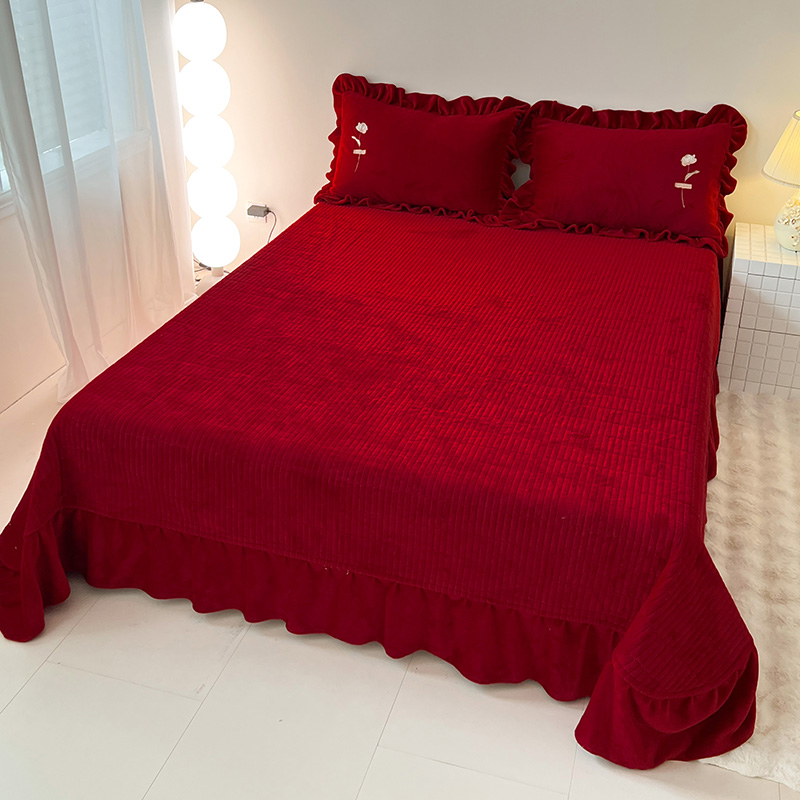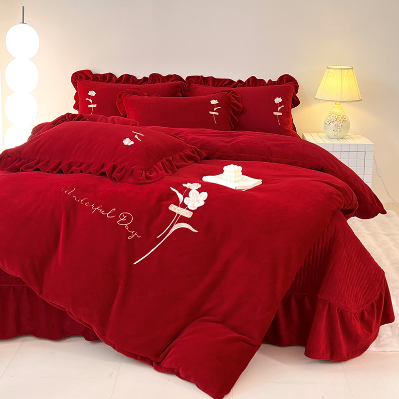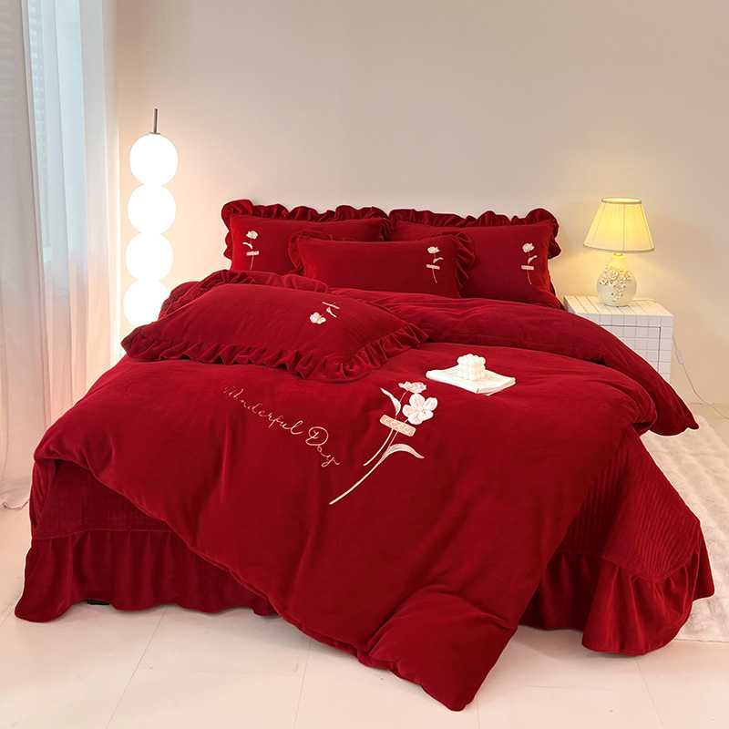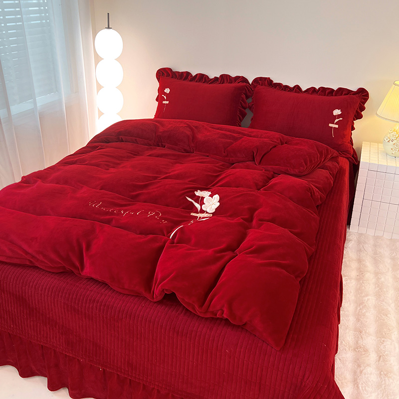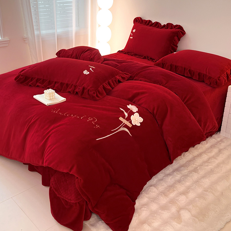 商品名称:梦莱斯 2025新款全消光床盖款牛奶绒刺绣四件套-山茶花 山茶花-大红