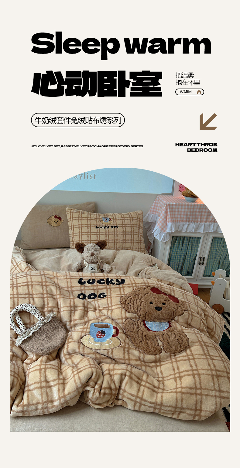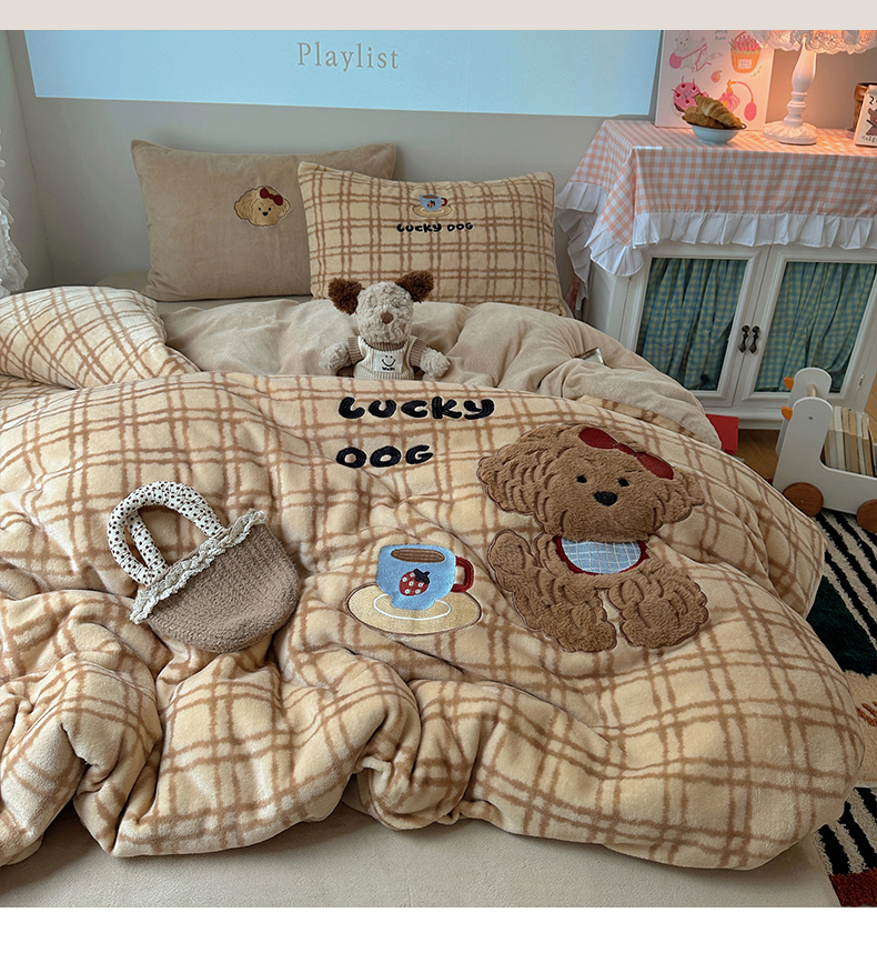 (总)暖生活 2025新款高克重细颗粒羊羔绒四件套,调皮小狗,灰色小象,毛绒小狗,甜点玩偶,小咪排队,幸福小窝