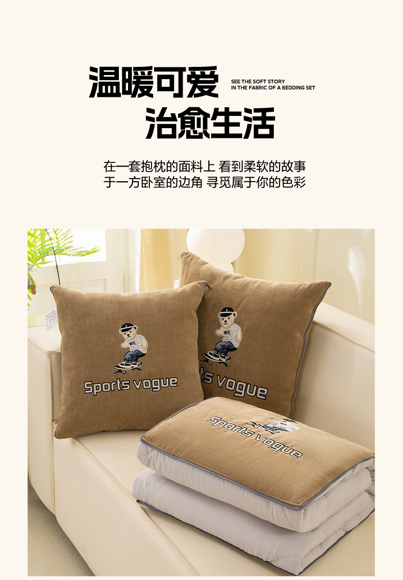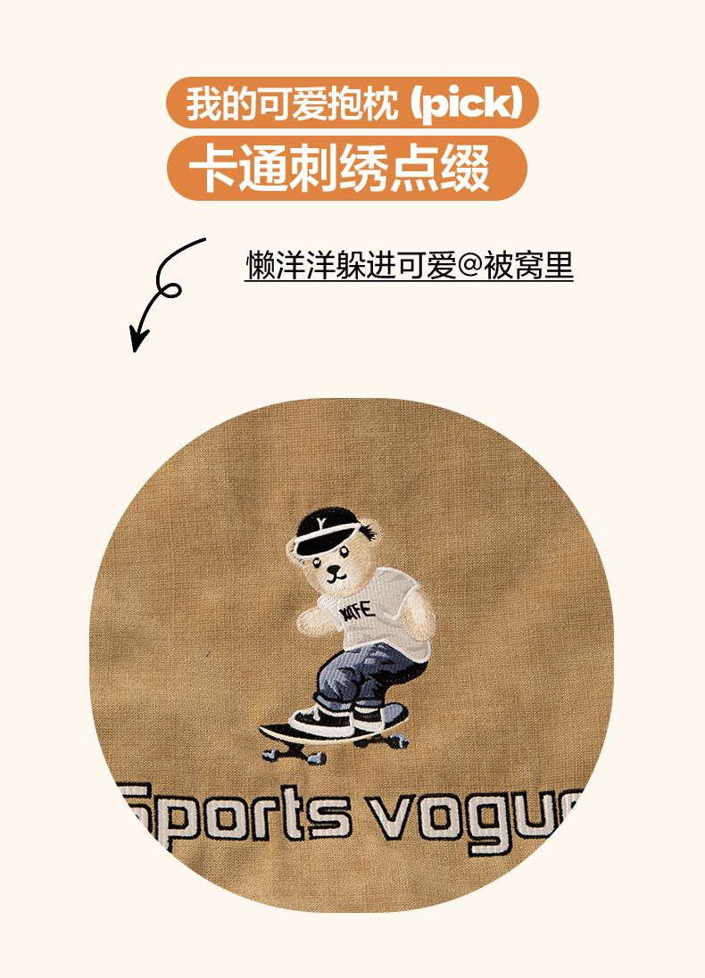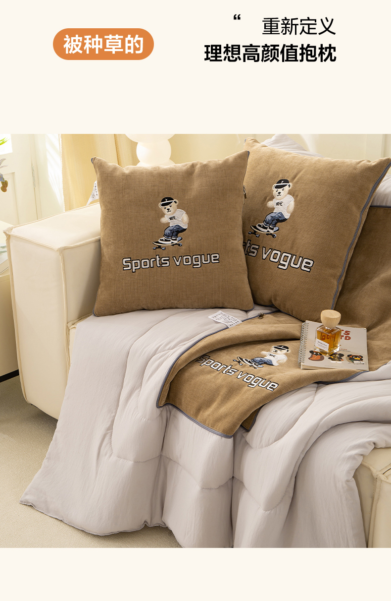 商品名称:多今家纺 2025新款水洗棉雪尼尔刺绣抱枕被子-滑板熊系列 滑板熊-后土黄