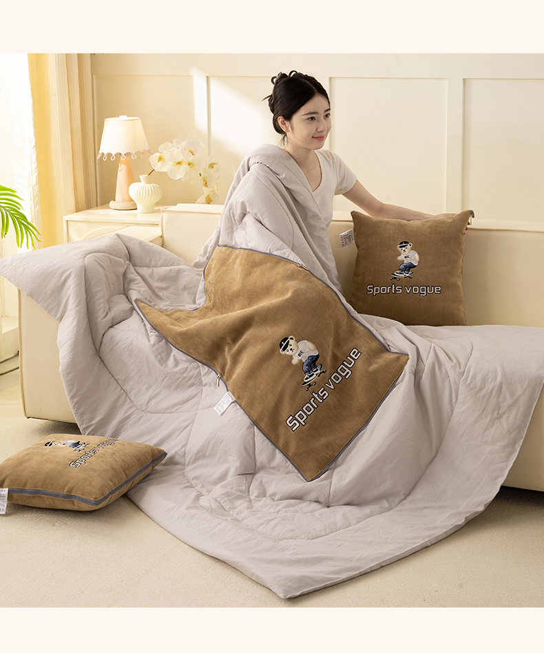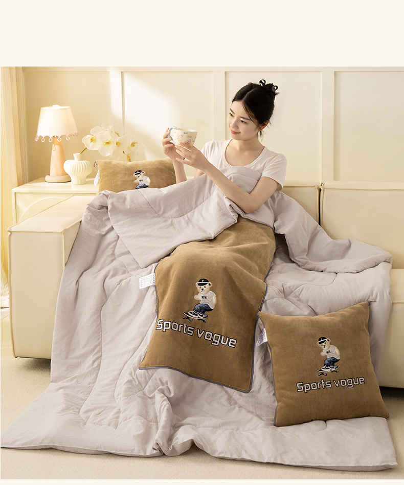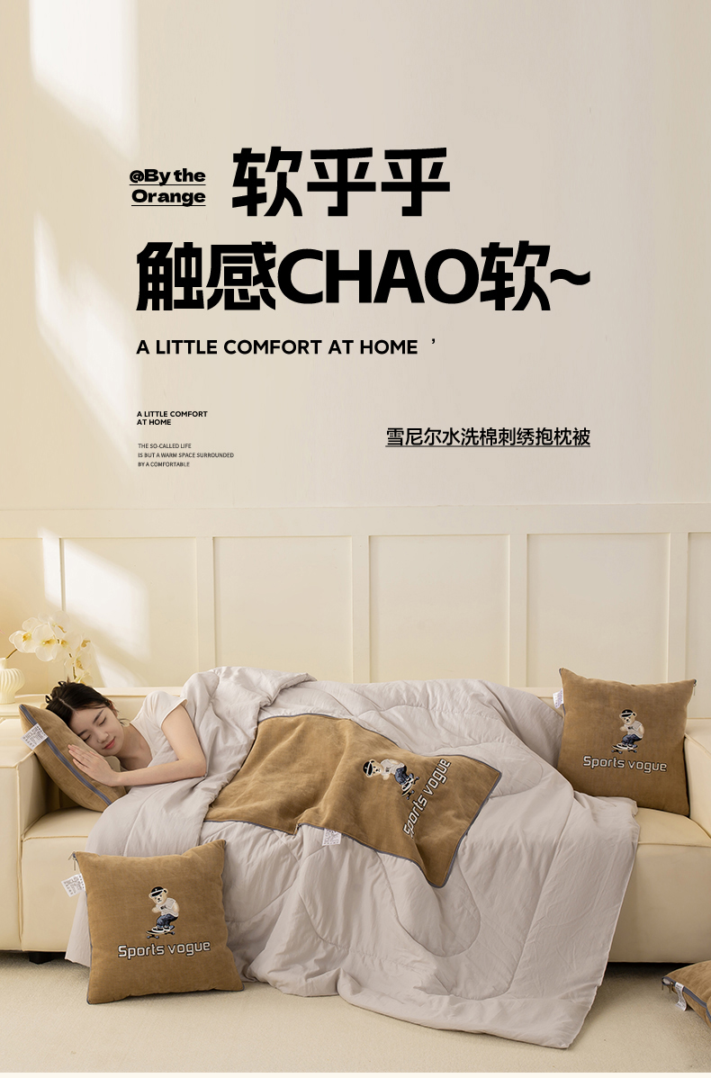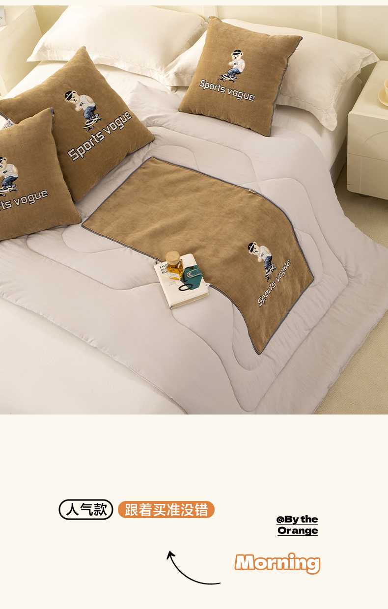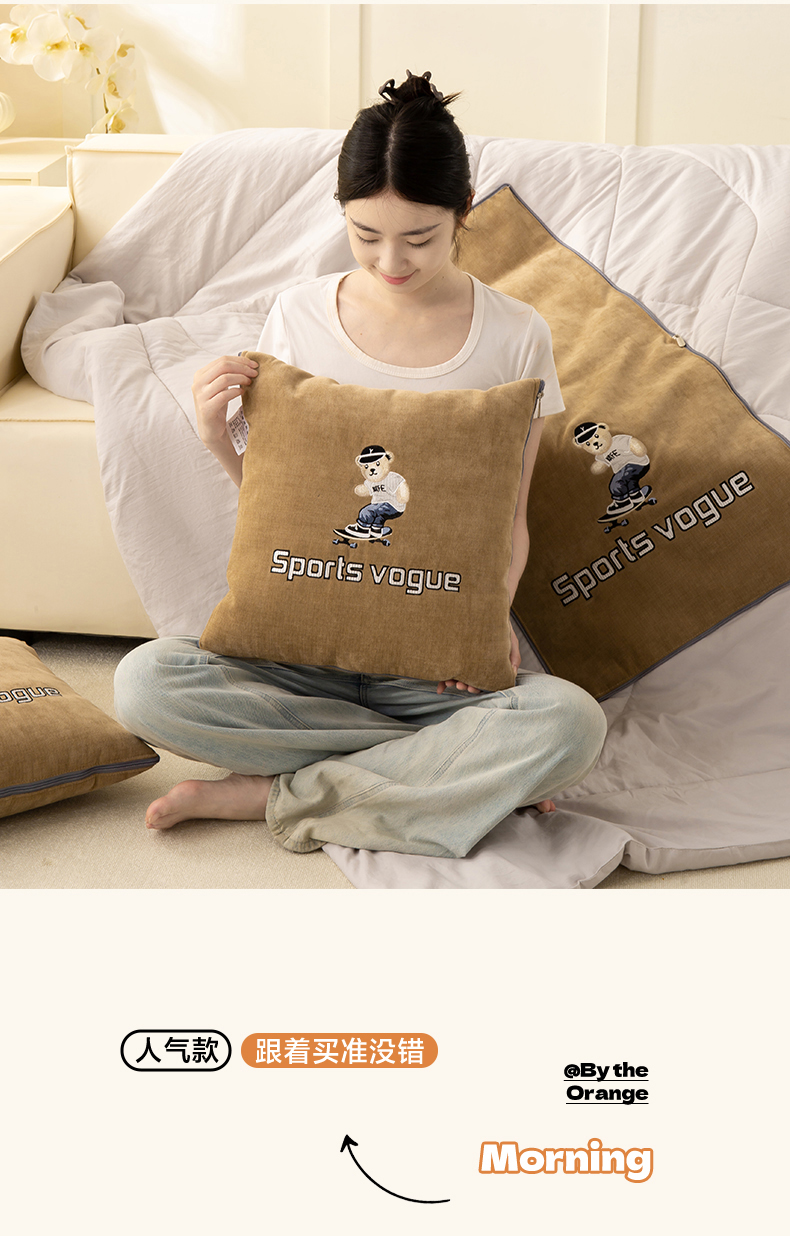多今家纺 2025新款水洗棉雪尼尔刺绣抱枕被子-滑板熊系列 滑板熊-后土黄
