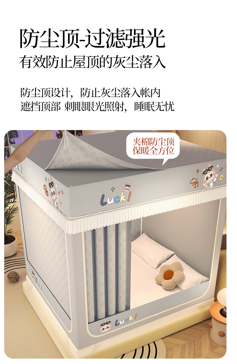 当前位置: 91家纺网 > 商品网购 > 床上用品 > 蚊帐 > 坐床式蚊帐 > 艾晶美家纺有限公司 2025新款坐床加棉卡通保暖蚊帐 幸运满满