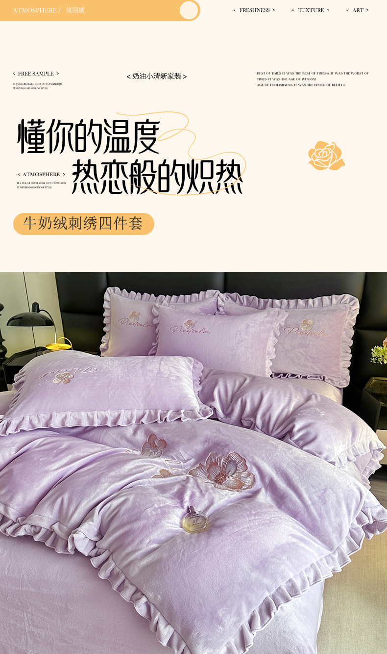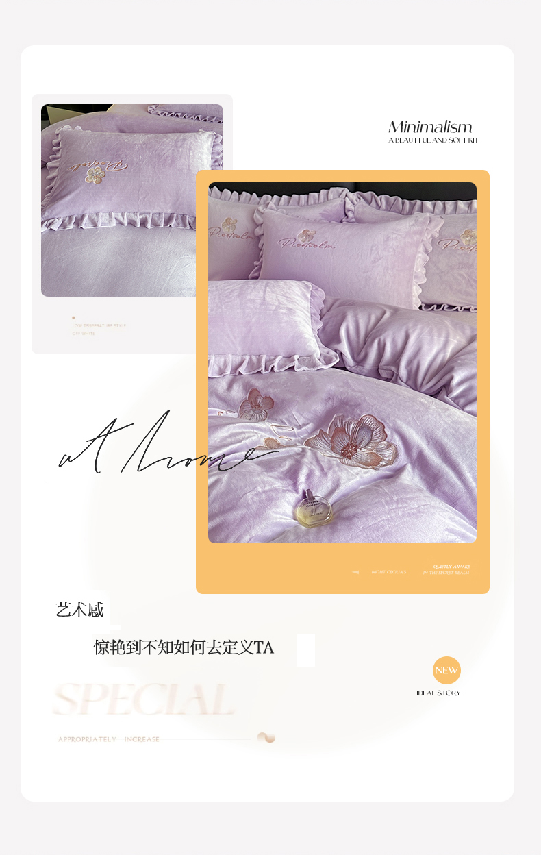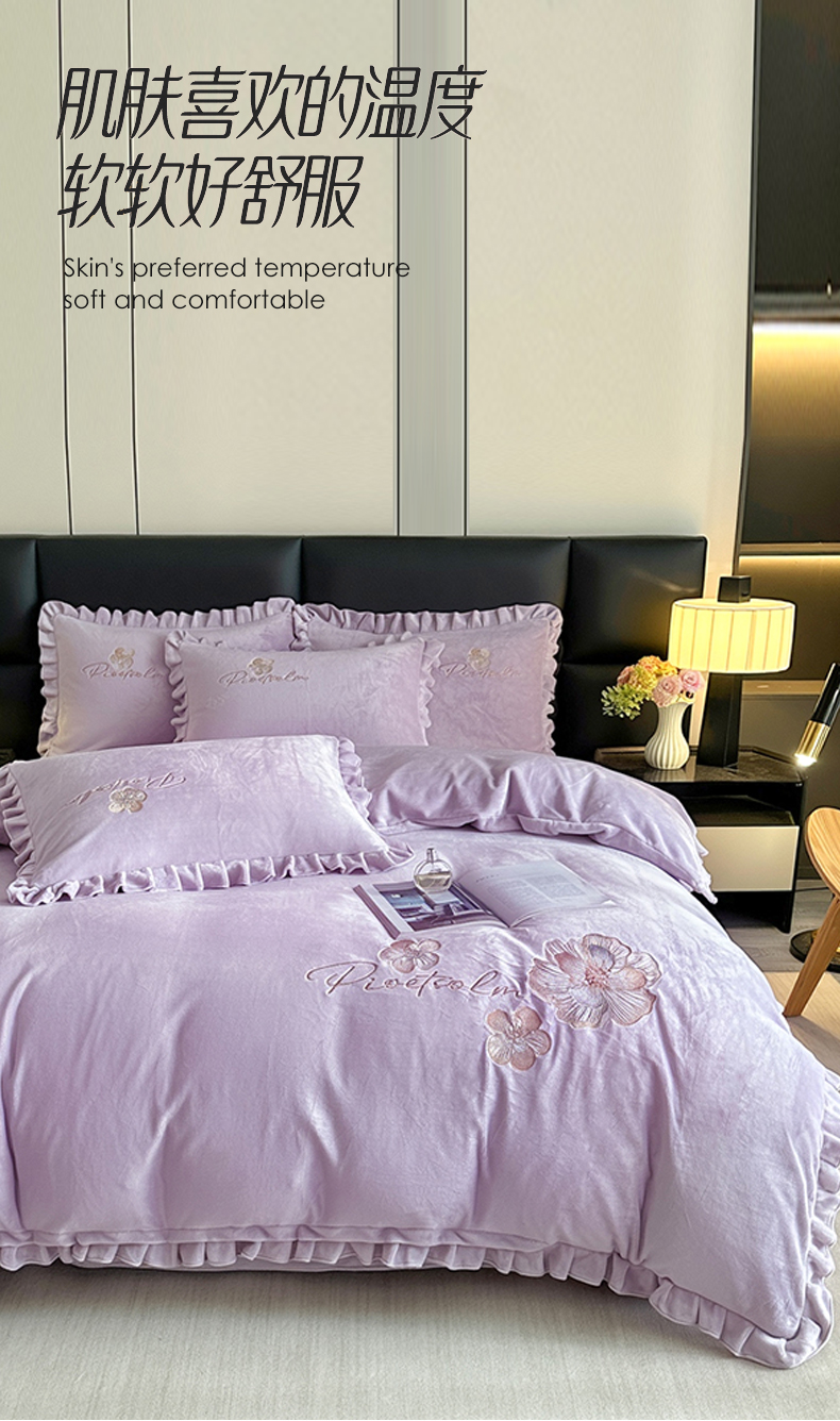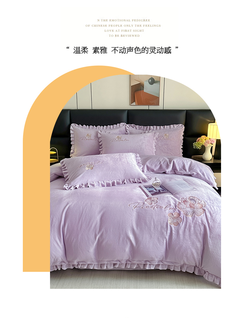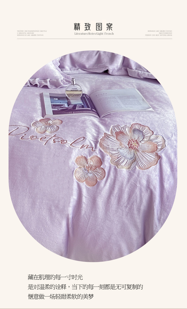 商品名称:董韵家纺 2025新款高克重 250克9-10斤牛奶绒 刺绣床单四件套系列 柔眠-云紫