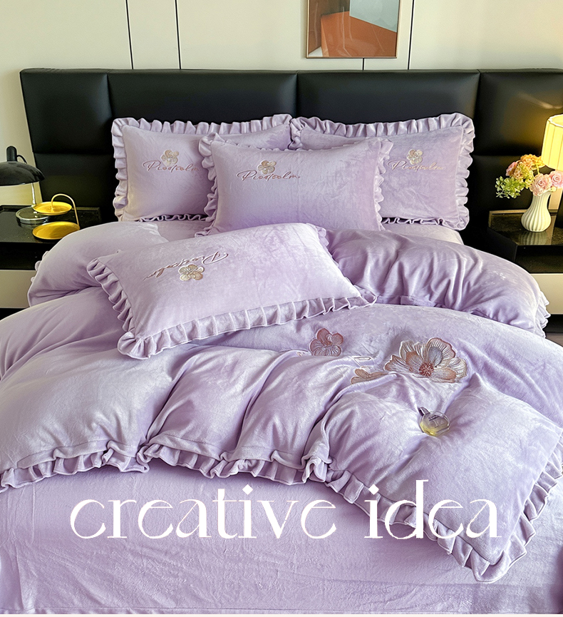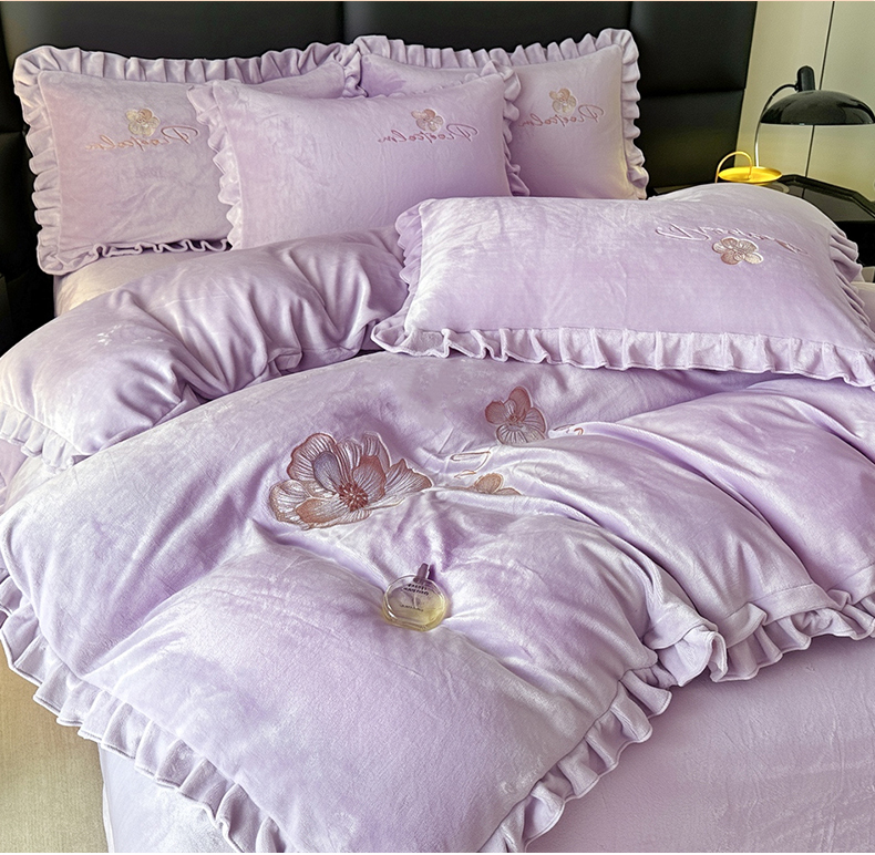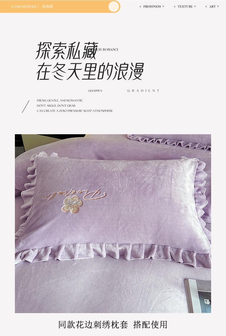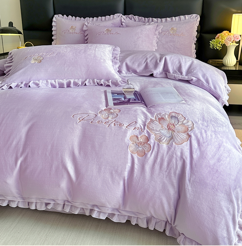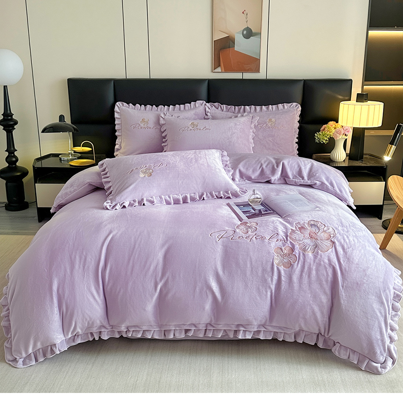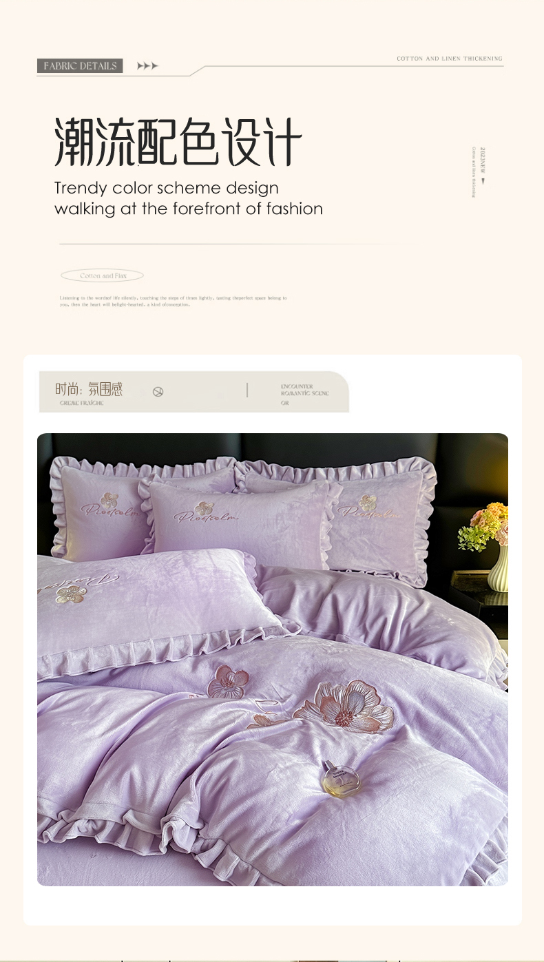 商品名称:董韵家纺 2025新款高克重 250克9-10斤牛奶绒 刺绣床单四件套系列 柔眠-云紫