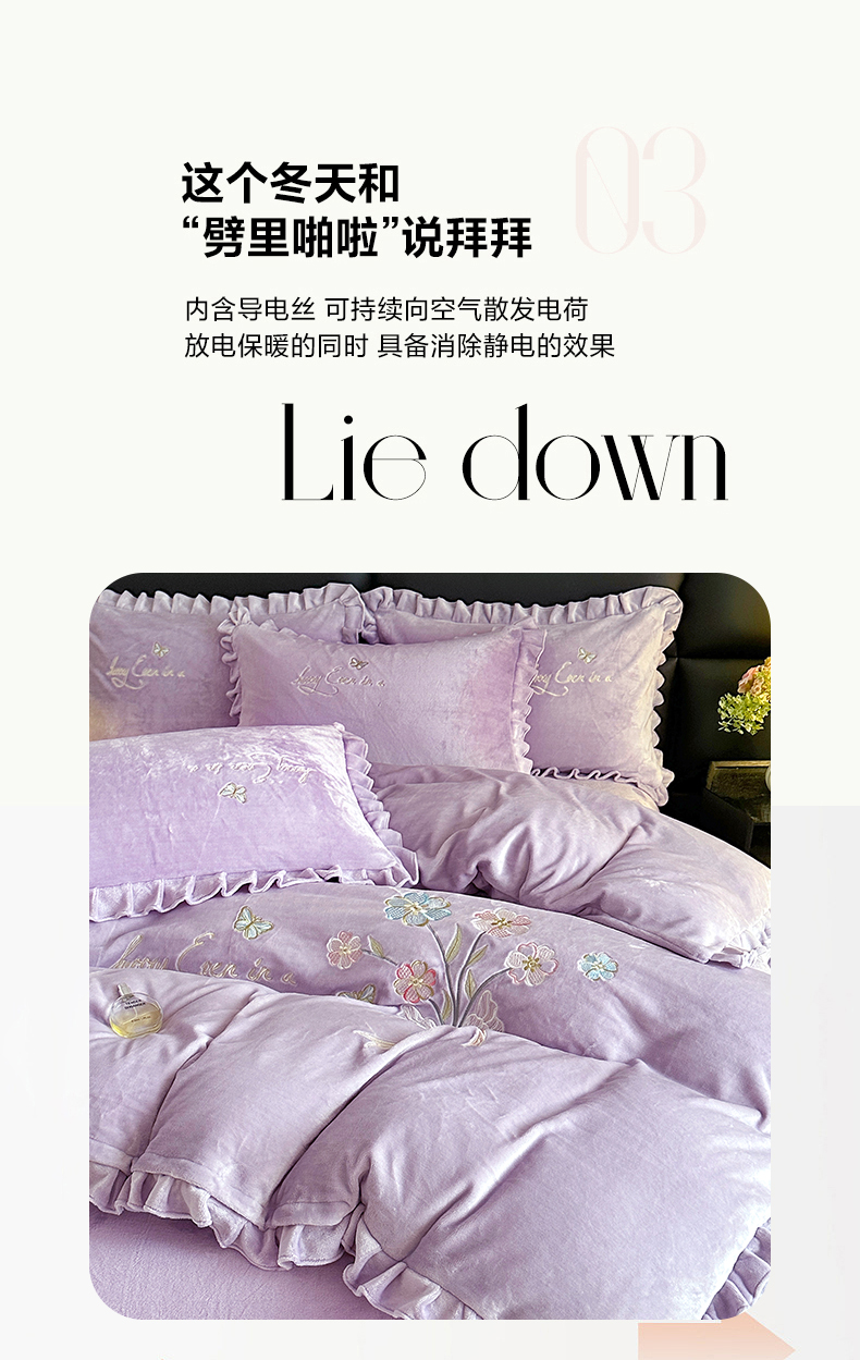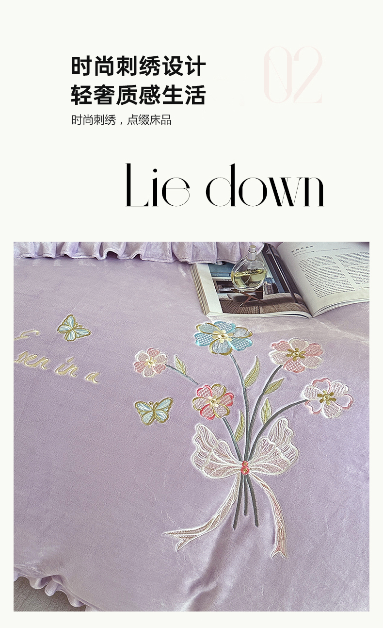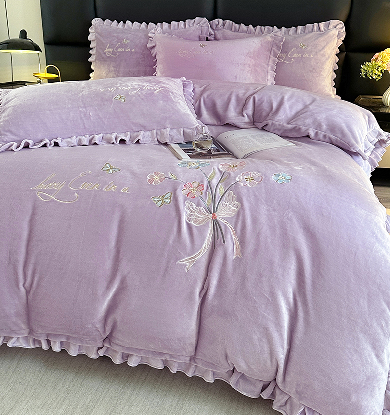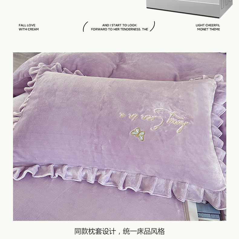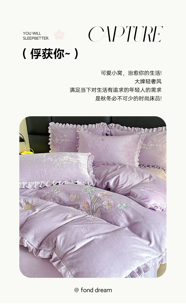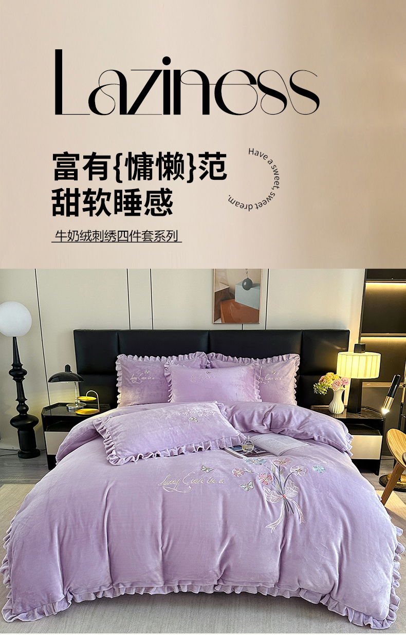商品名称:董韵家纺 2025新款高克重 250克9-10斤牛奶绒 刺绣床单四件套系列 柔雾-云紫