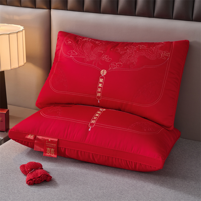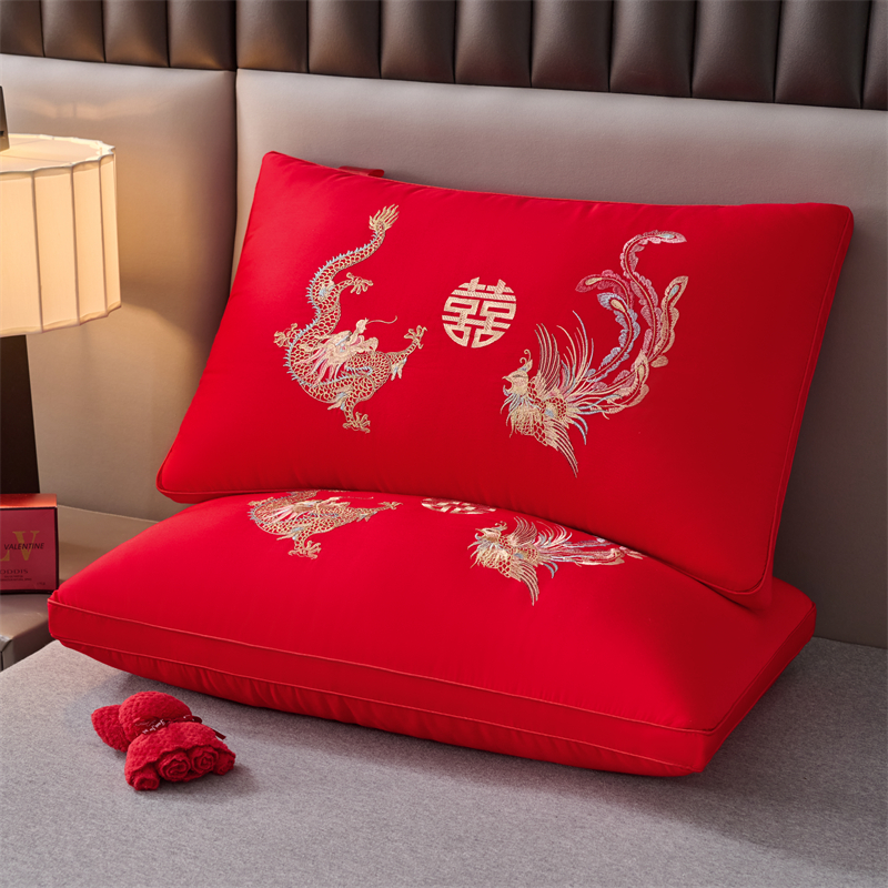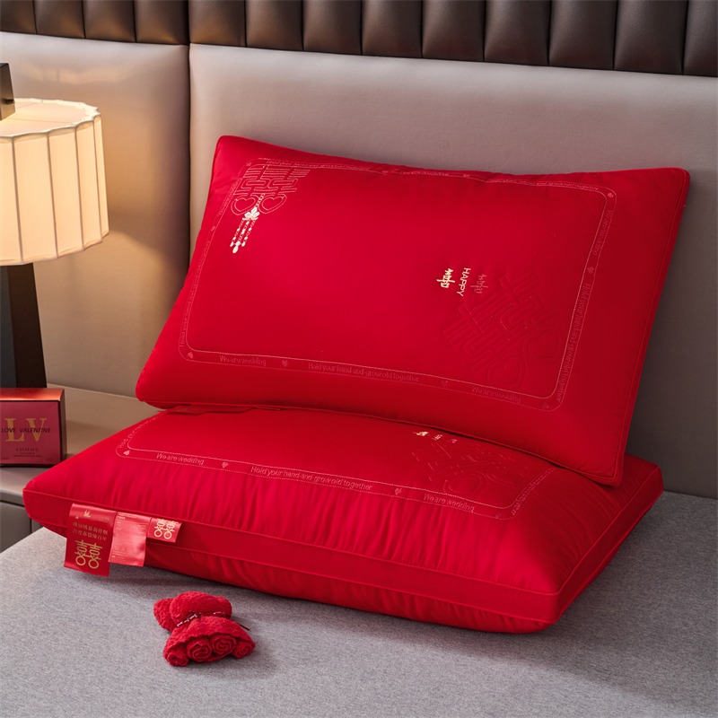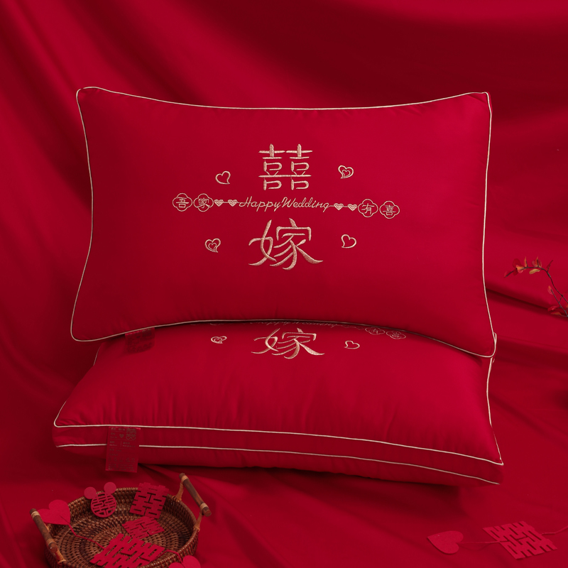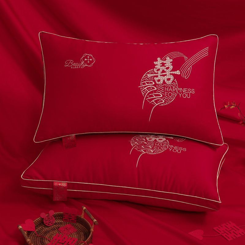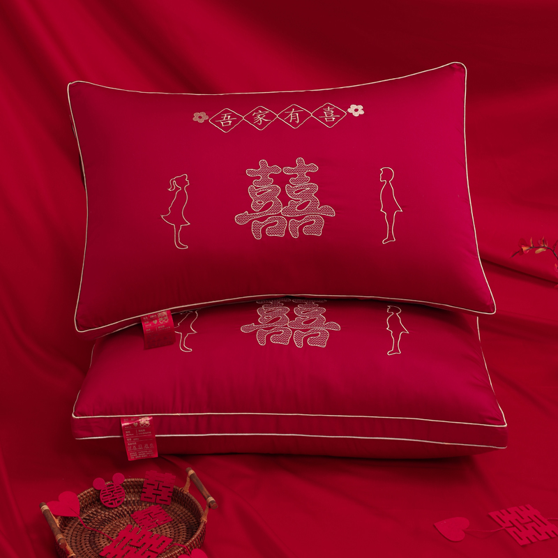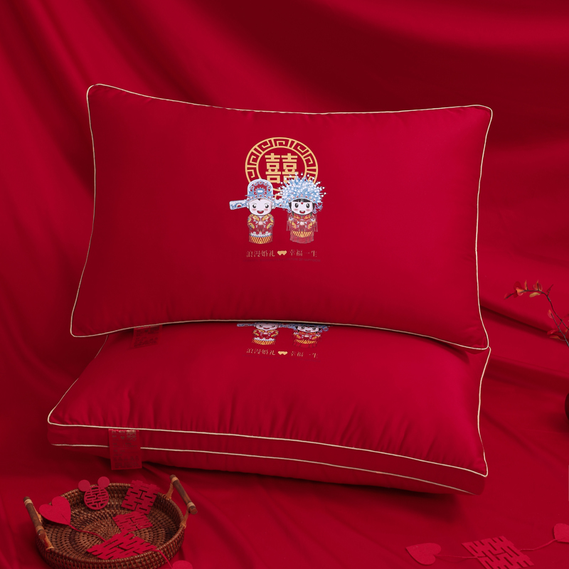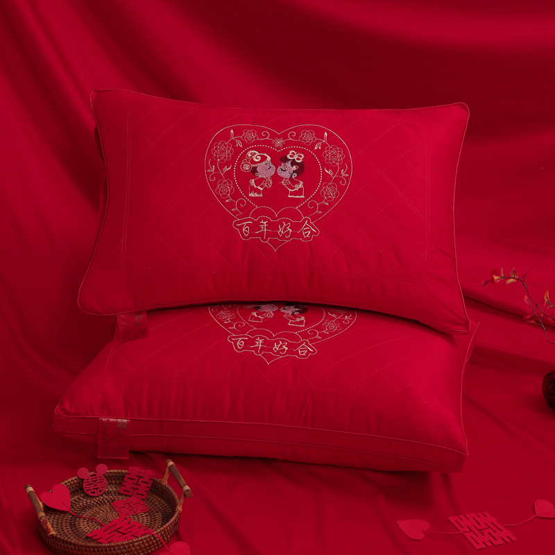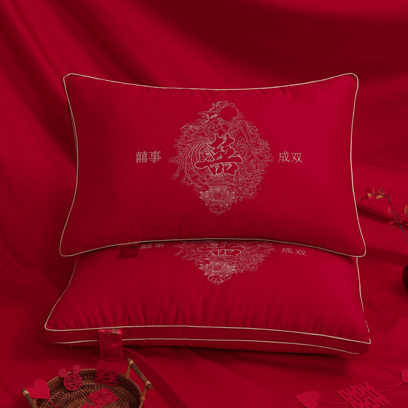 (总)仁宇枕业 2025新款精美刺绣全棉大红枕头喜事成双婚庆新娘新郎结婚枕头枕芯
