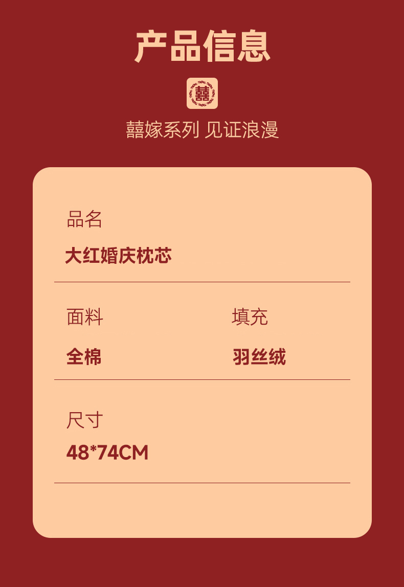 (总)仁宇枕业 2025新款新品 高端全棉刺绣婚庆枕头大红结婚专用枕芯,组合图仅供展示不可下单 48x74cm/只,大红新婚大喜系列-大双喜 48x74cm/只,大红新婚大喜系列-喜欢你 48x74cm/只,大红新婚大喜系列-喜上眉梢 48x74cm/只,大红新婚大喜系列-新版喜结连理 48x74cm/只,大红新婚大喜系列-新婚大喜 48x74cm/只,组合图仅供展示不可下单 48x74cm/对,大红新婚大喜系列-大双喜 48x74cm/对,大红新婚大喜系列-喜欢你 48x74cm/对,大红新婚大喜系列-喜上眉梢 48x74cm/对,大红新婚大喜系列-新版喜结连理 48x74cm/对,大红新婚大喜系列-新婚大喜 48x74cm/对
