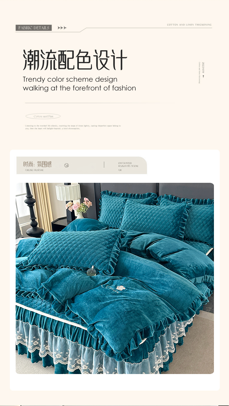 商品名称:董韵家纺 2025新款牛奶绒刺绣夹棉床裙四件套系列(控价) 丝语-靛青