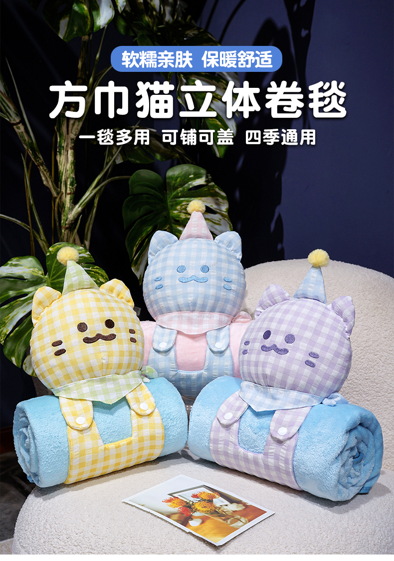 商品名称:仟亿莱 2025新款带帽方巾喵立体卷毯 卷卷黄格喵