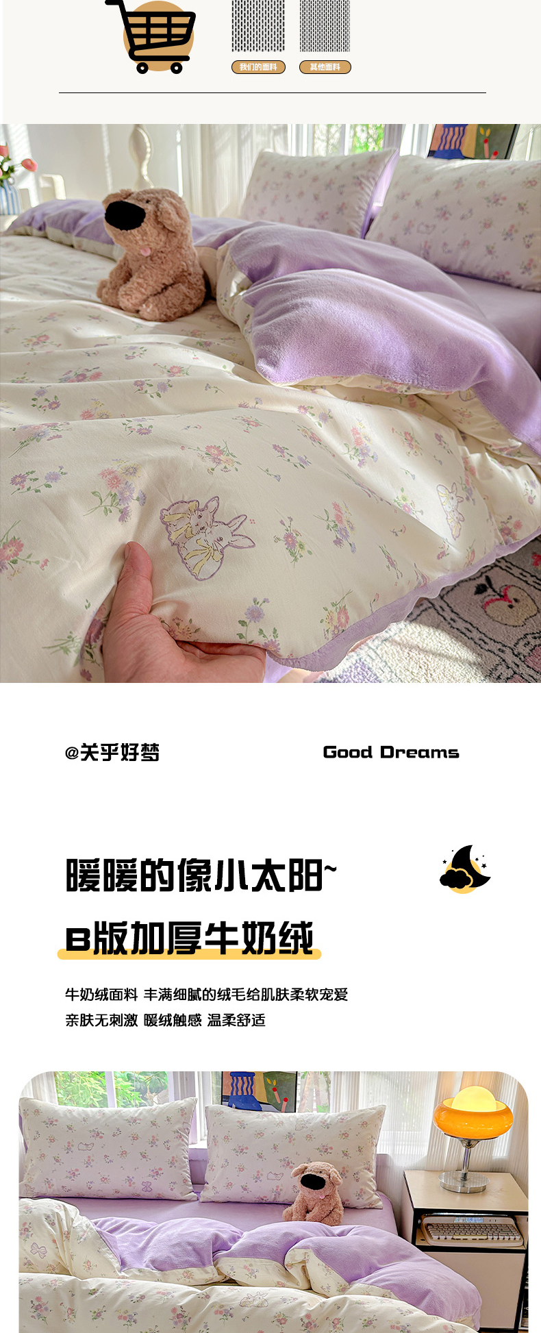 (总)梦洋家纺 2025新款软fufu加厚保暖可爱系牛奶绒宿舍床套件系列,草莓牛奶,草莓软心,蝴蝶点点心,蜡笔心,卖萌修狗,玫瑰粉黛,抹茶绿狗,茉莉小象,蔷薇语,巧克力熊,绒绒小狗-粉,绒绒小狗-蓝,小兔幻境,小兔舞,一口樱桃,枝枝兔