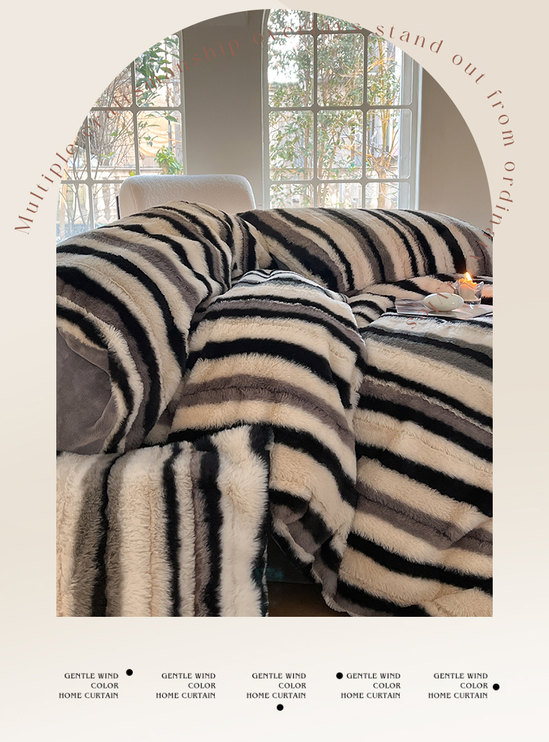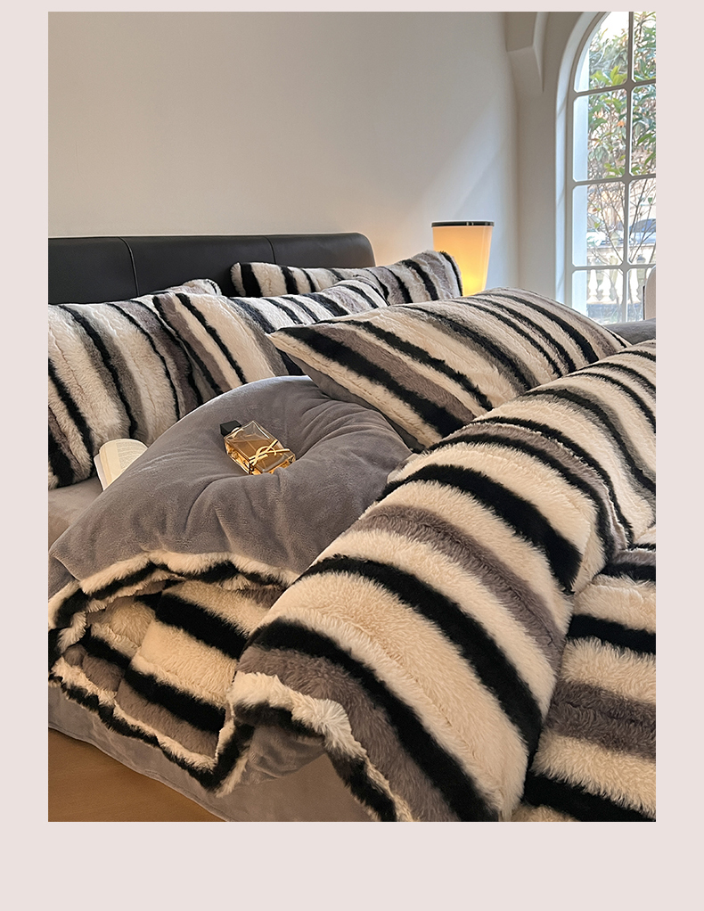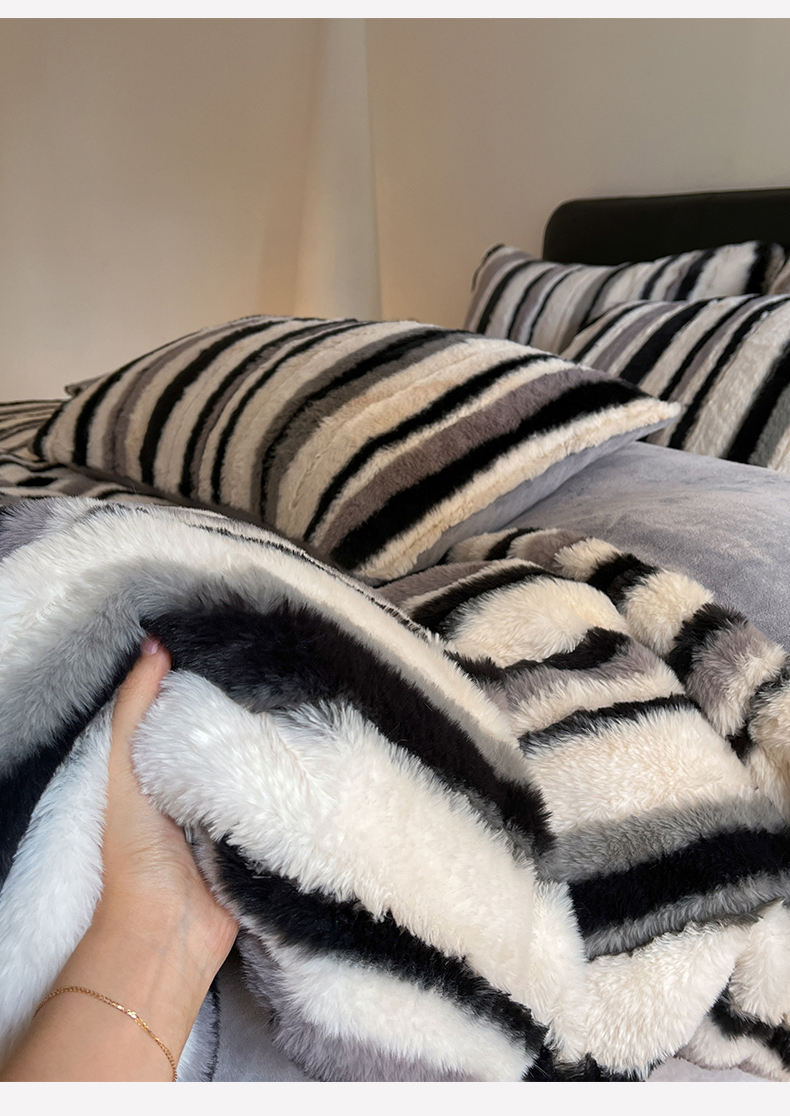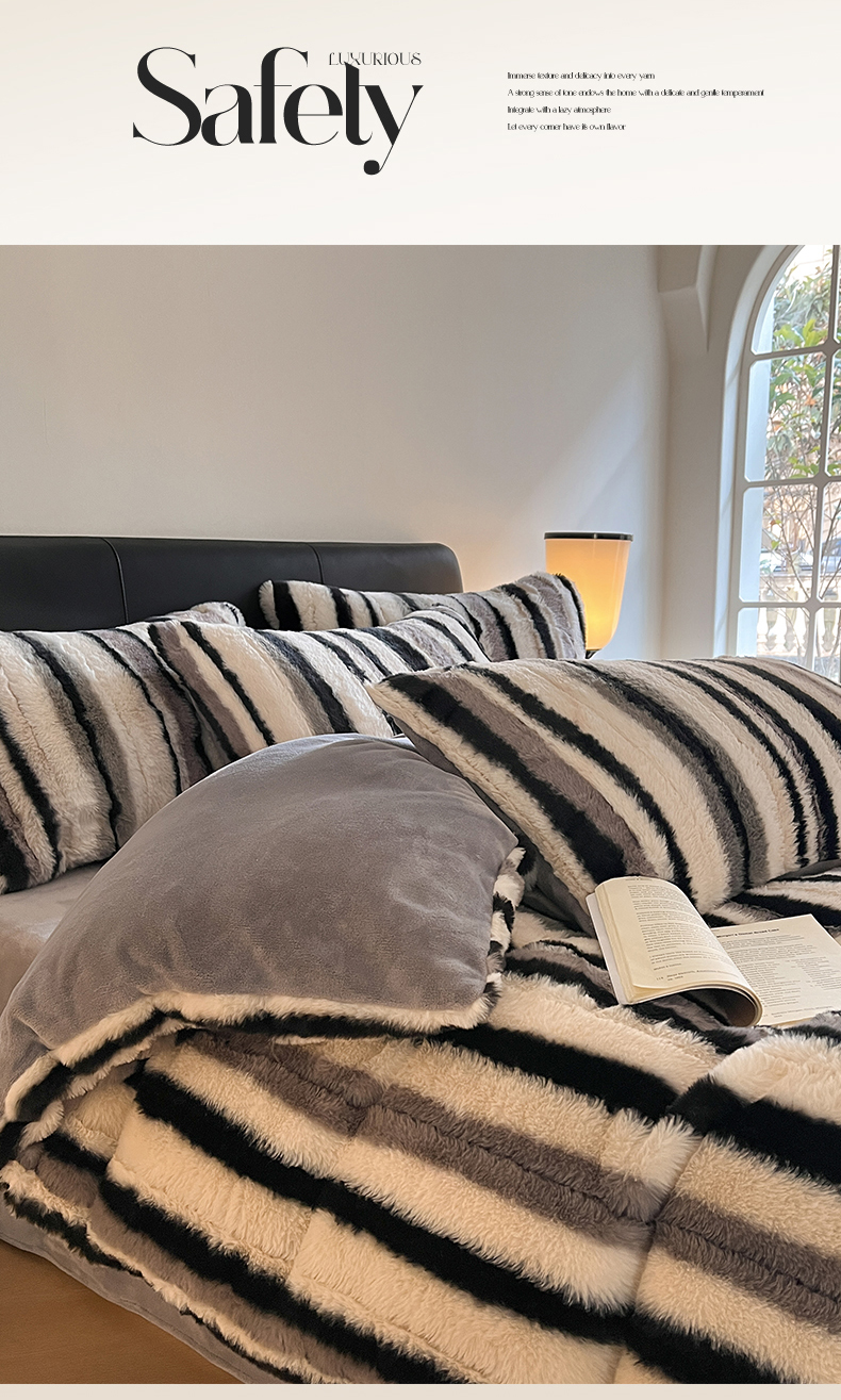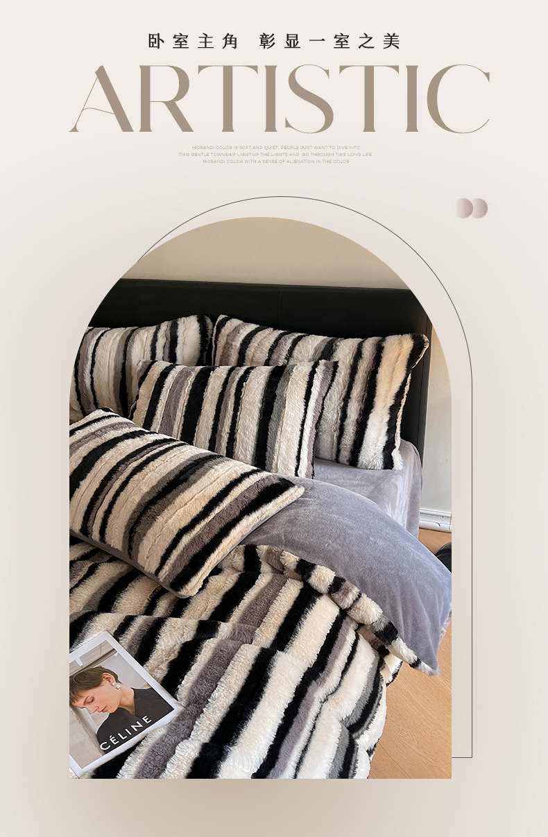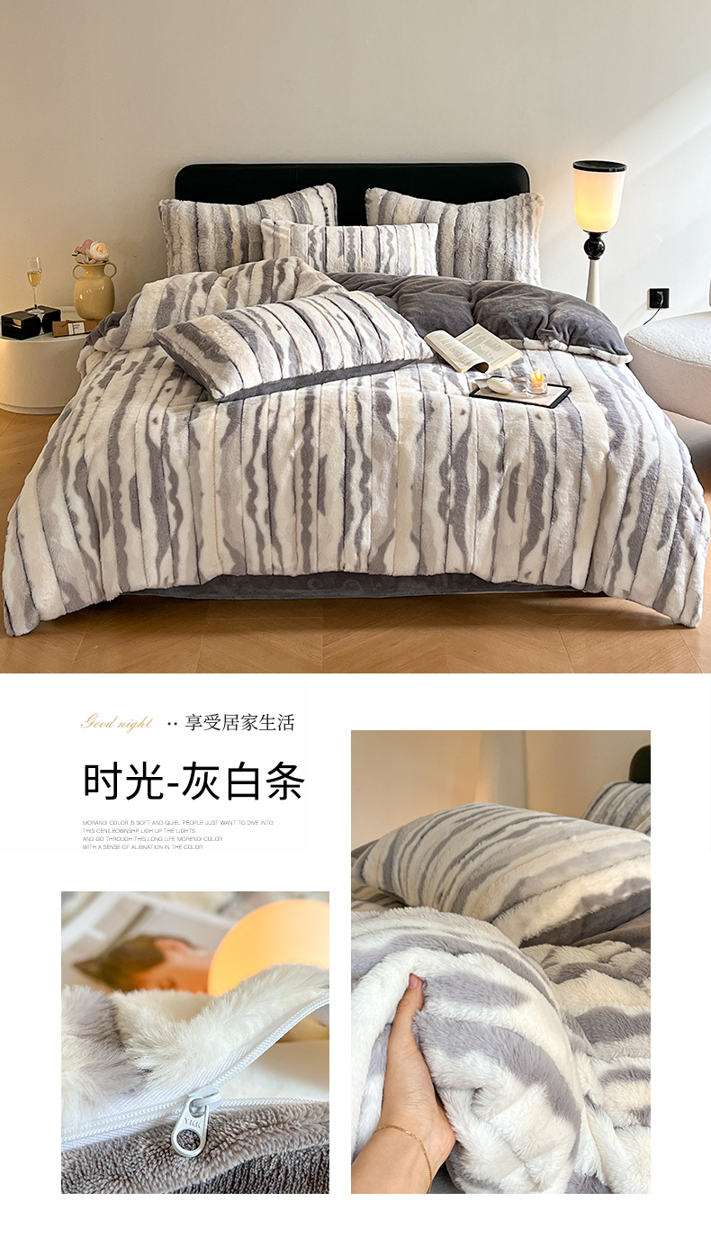 玖琳家纺 2025新款双面高端高克重兔绒毛牛奶绒轻奢款四件套- 时光系列 灰白条