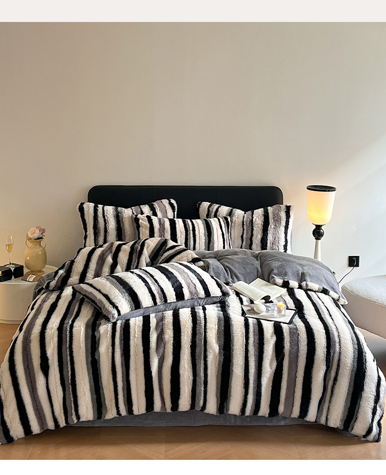 商品名称:玖琳家纺 2025新款双面高端高克重兔绒毛牛奶绒轻奢款四件套- 时光系列 灰白条