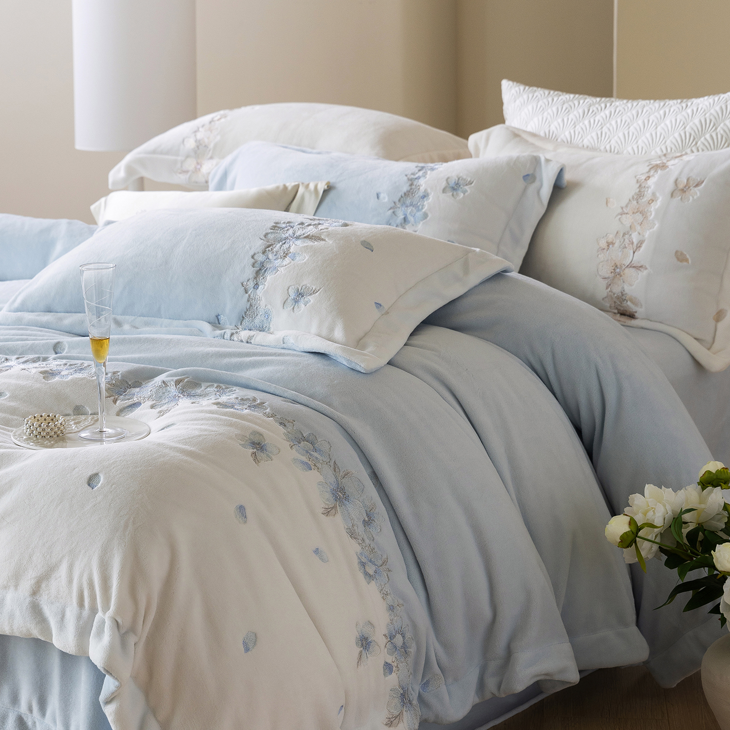 佳汐蓝家纺 2025新款双色拼接刺绣全消光牛奶绒四件套-花沐语 控价:券后不低于398 绒 花沐语-米白
