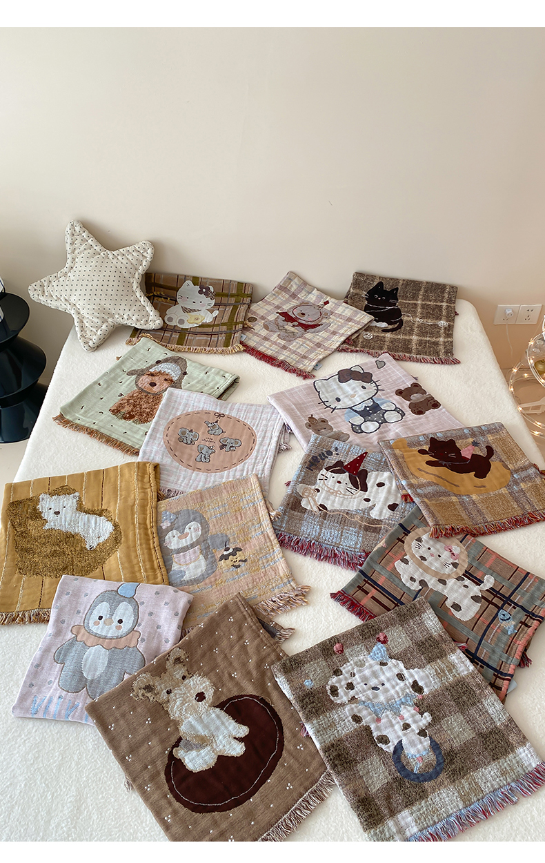 (总)麻依 2025新款全棉四层纱布软萌流苏枕巾,波点企鹅,蛋糕企鹅,蛋糕小咪,调皮小猫,乖乖狗,锣鼓小熊,帽子小象,沙发小狗,鲨鱼小狗,玩偶熊KT,线团小咪,香蕉小猫,鸭鸭小猫,杂技小狗,组合图