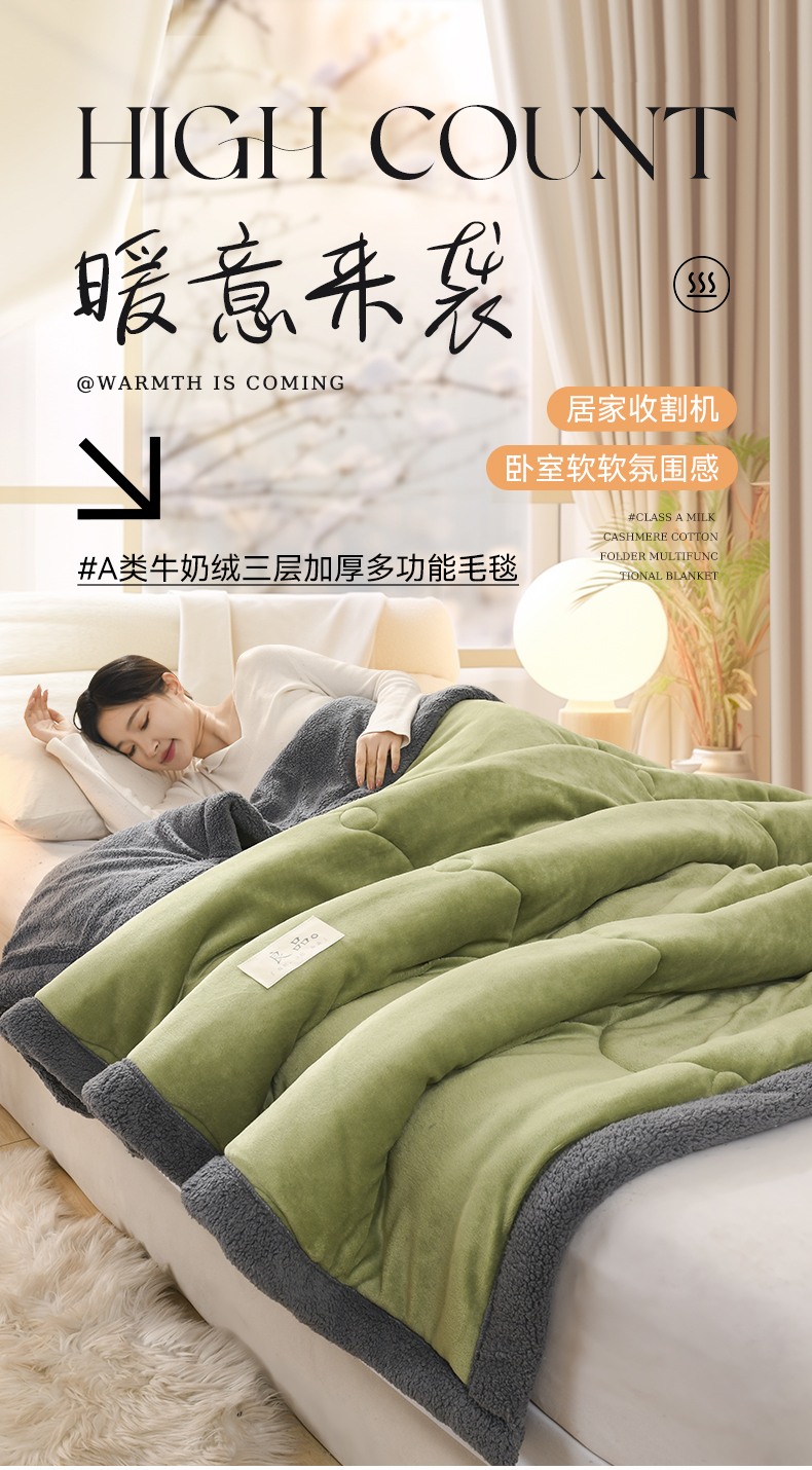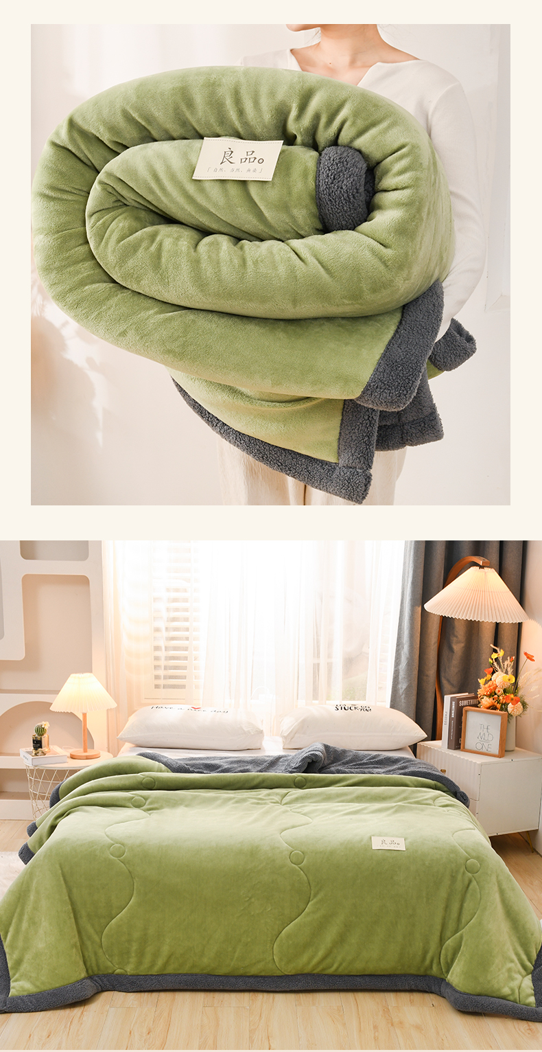 恋绒家纺 2025新款三层牛奶绒夹棉毛毯复合盖毯直播外贸毯子 抹茶绿