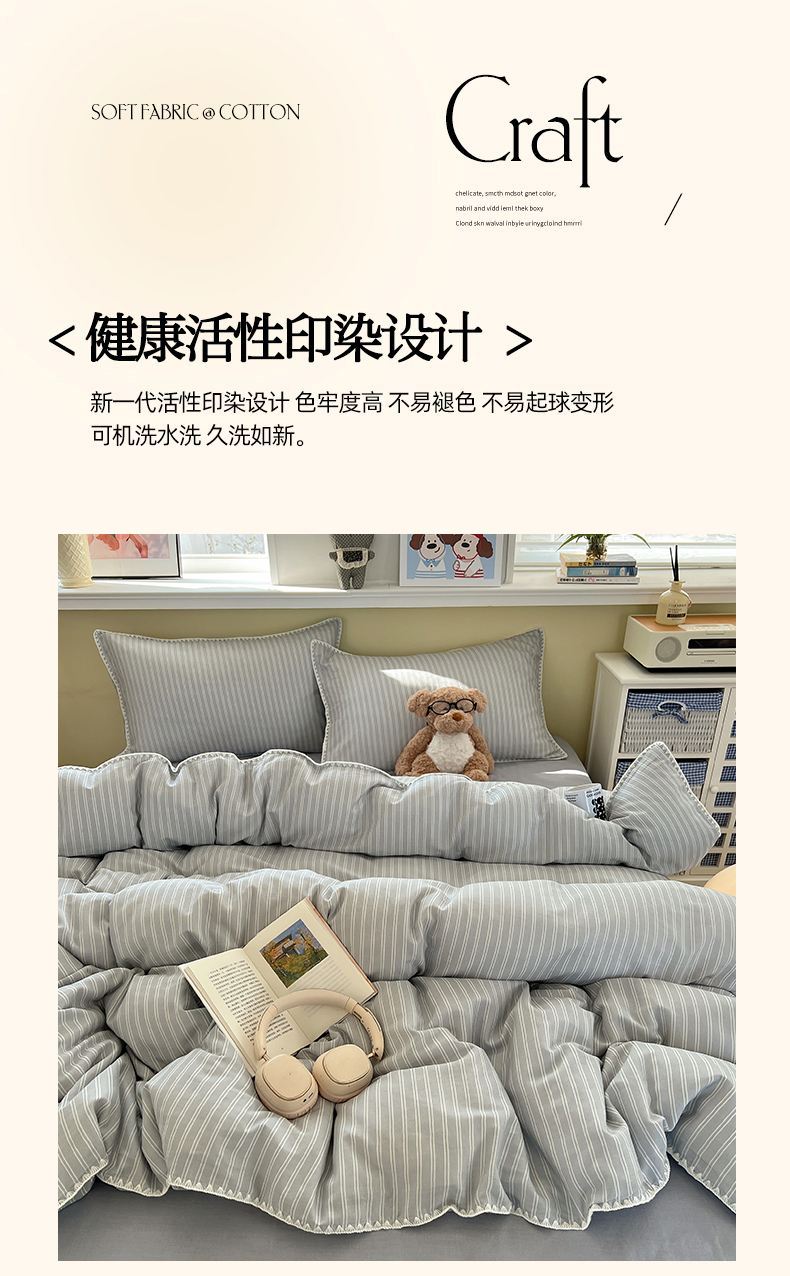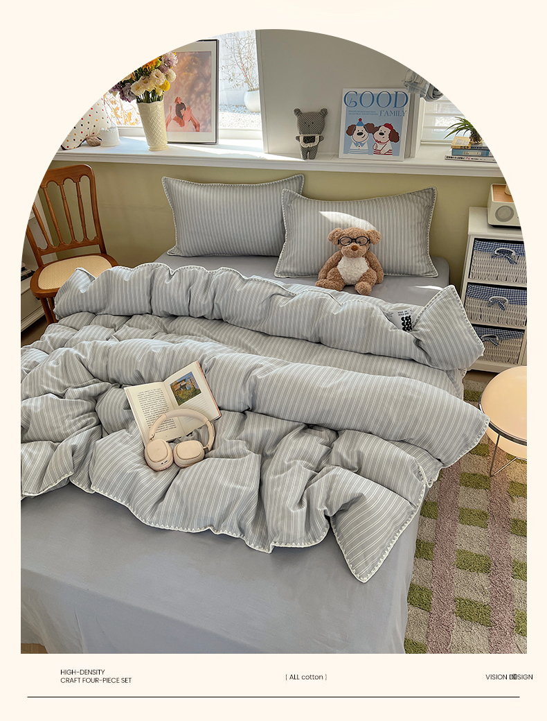典曼家纺 2026新款全棉纯棉有氧双层纱贝壳边四件套 贝壳边休闲条纹
