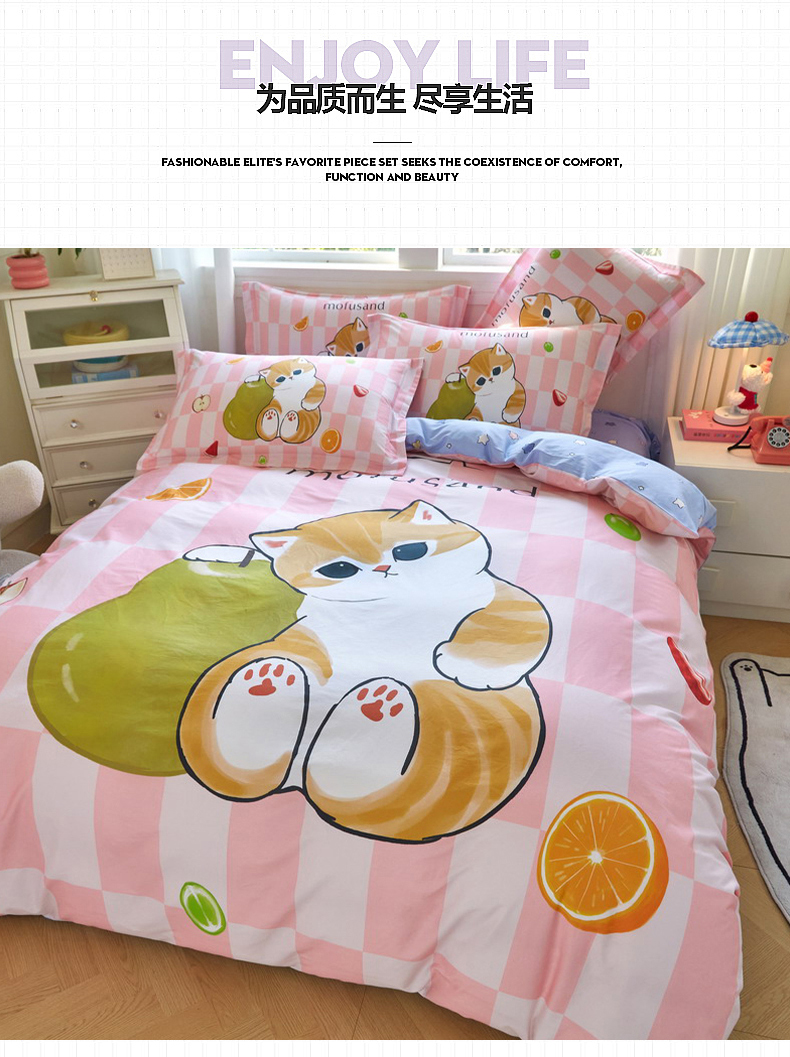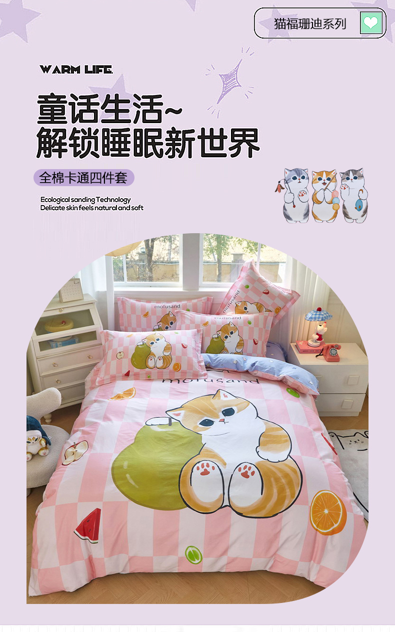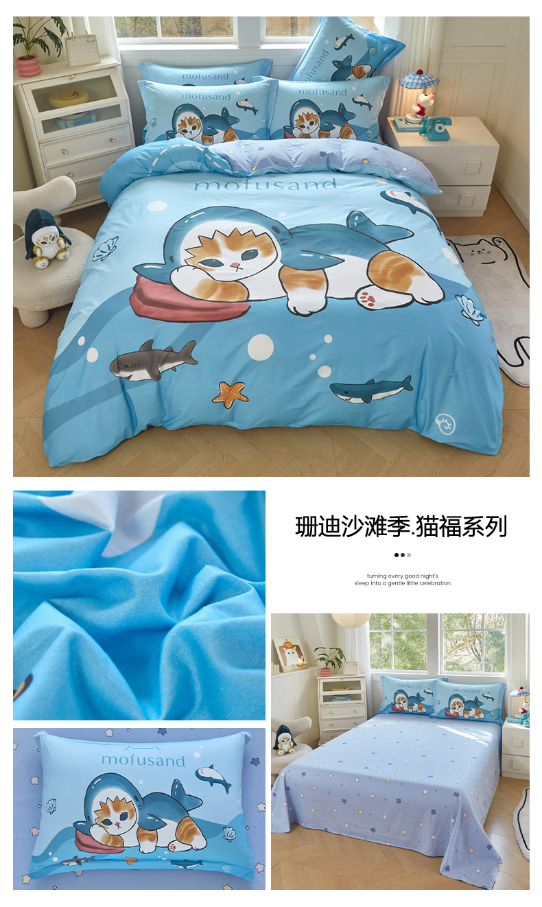 当前位置: 91家纺网 > 商品网购 > 床品套件 > 四件套 > 全棉普通四件套 > 蘭菲家纺 2026新款全棉大版鲨鱼猫套件-猫福系列四件套 水果珊迪-猫福.系列