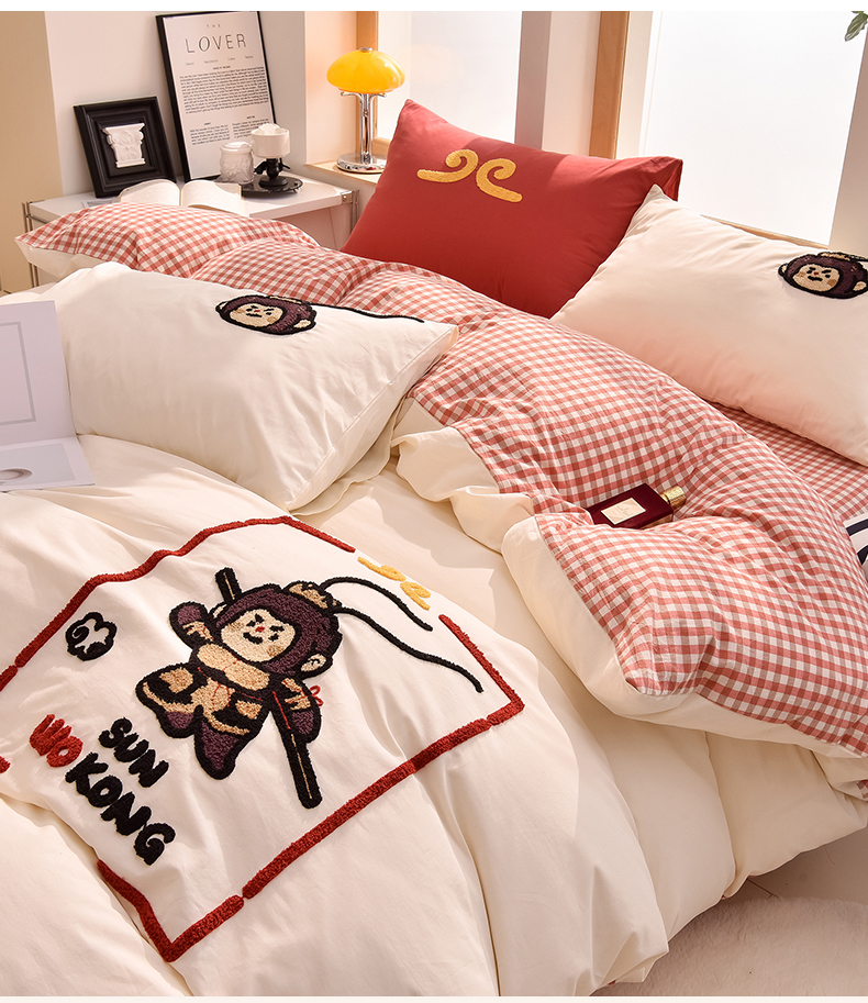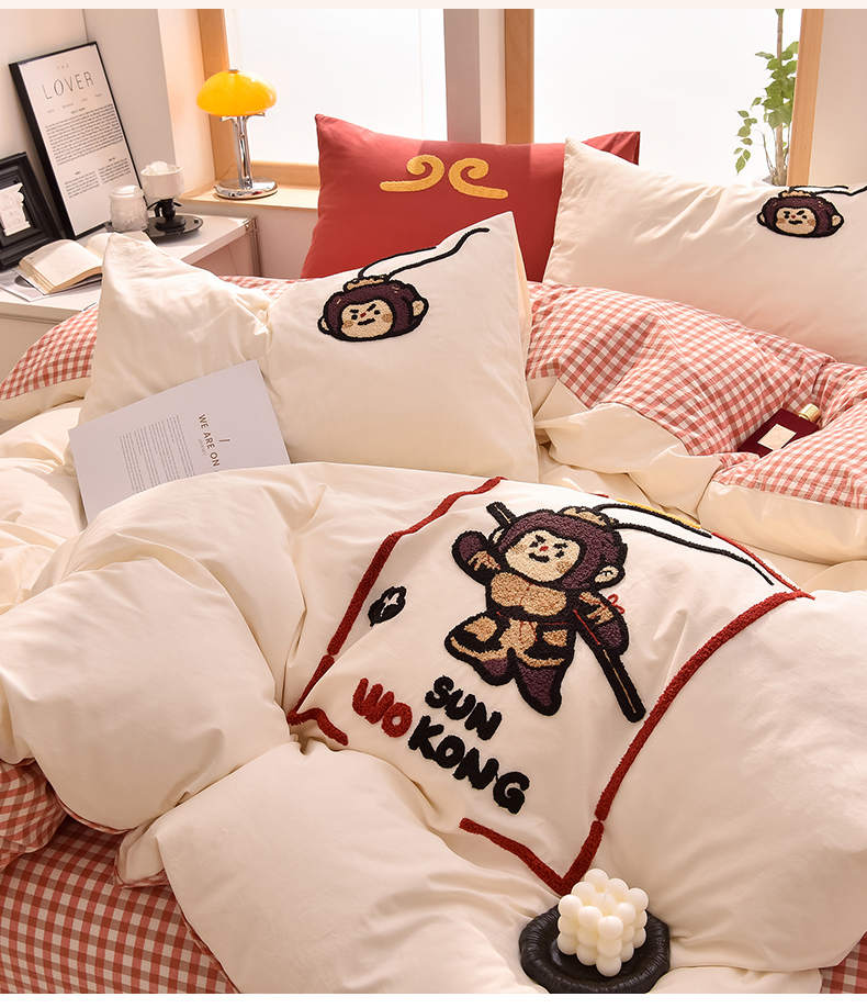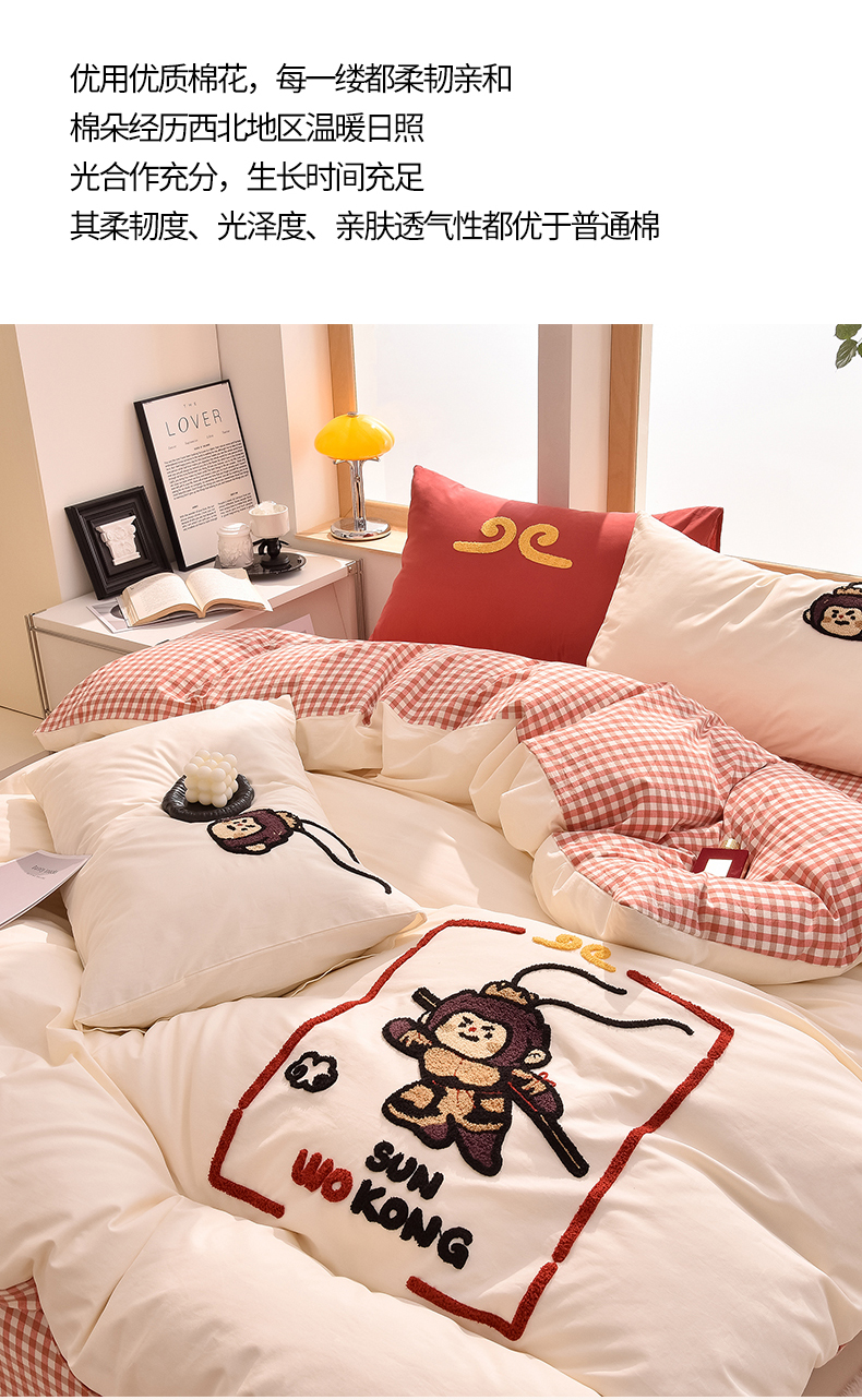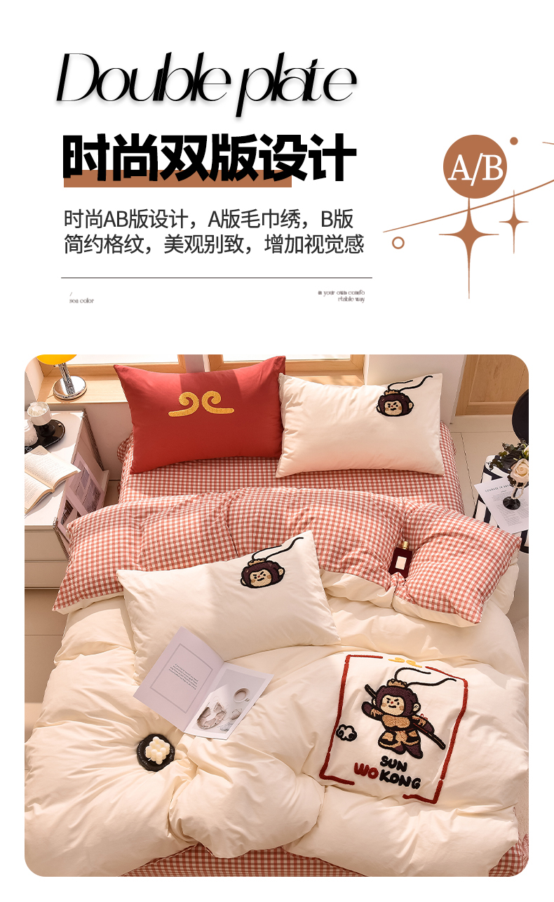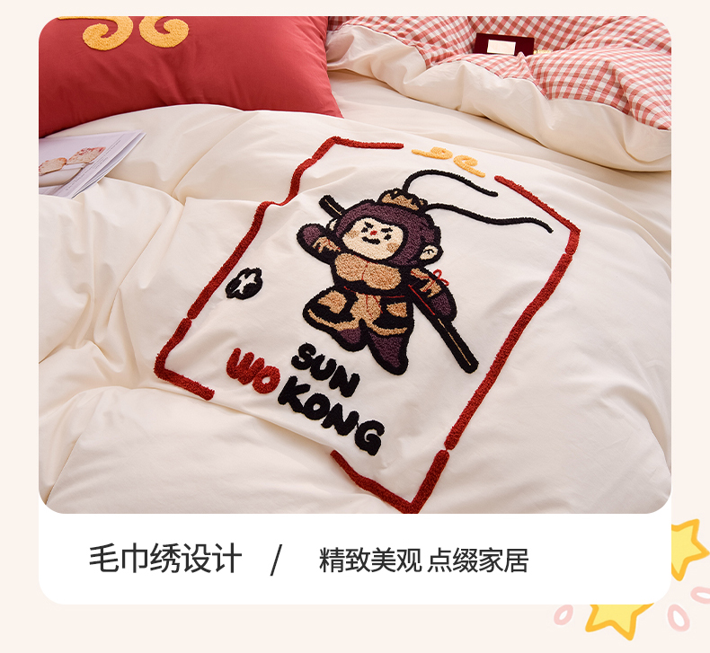 当前位置: 91家纺网 > 商品网购 > 床品套件 > 四件套 > 全棉普通四件套 > 炫拼家纺 2026新款多巴胺系列A类全棉40支水洗棉卡通毛巾绣四件套 多巴胺-美猴王