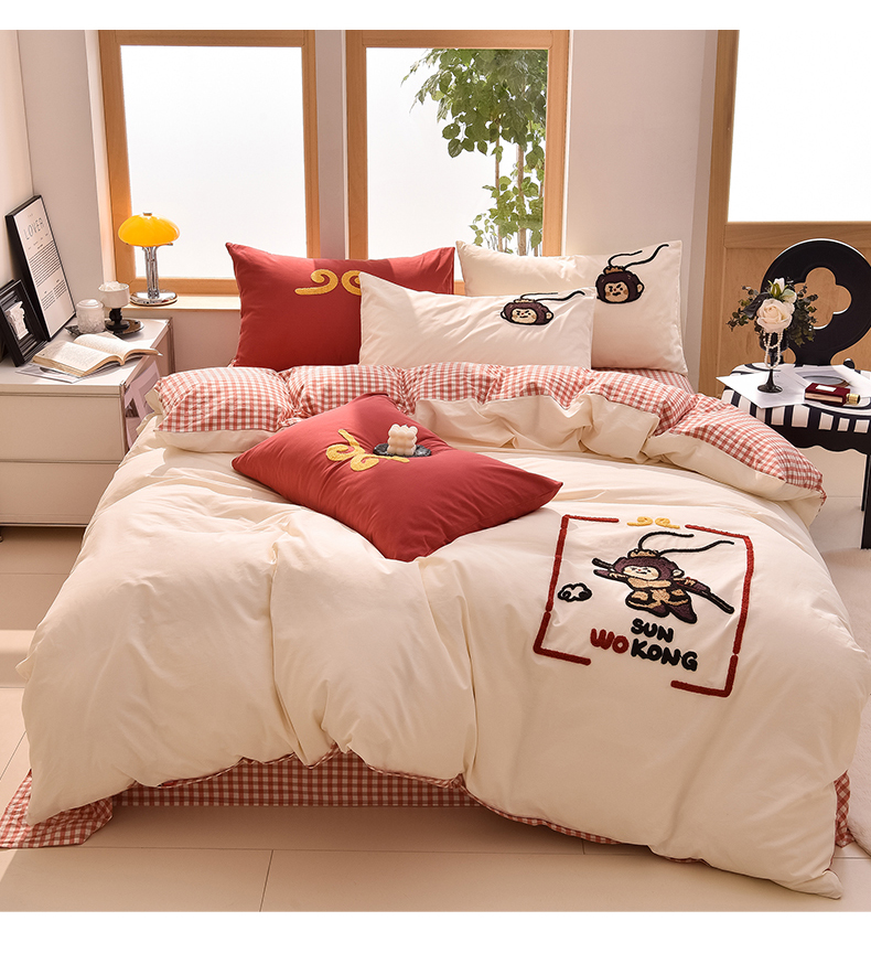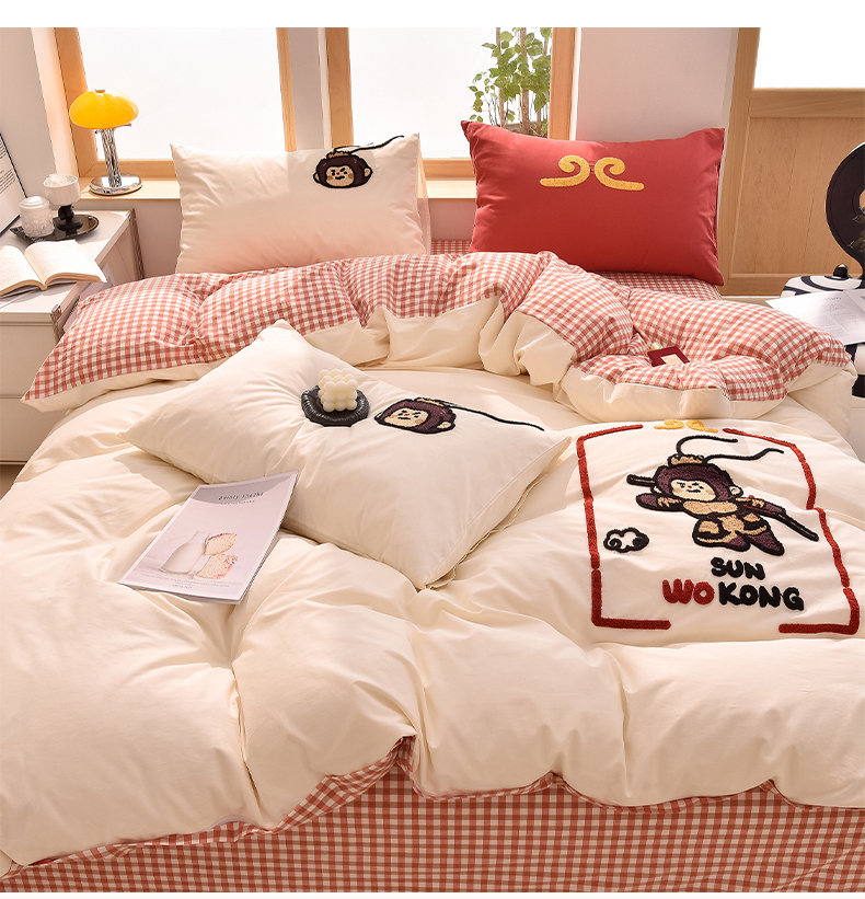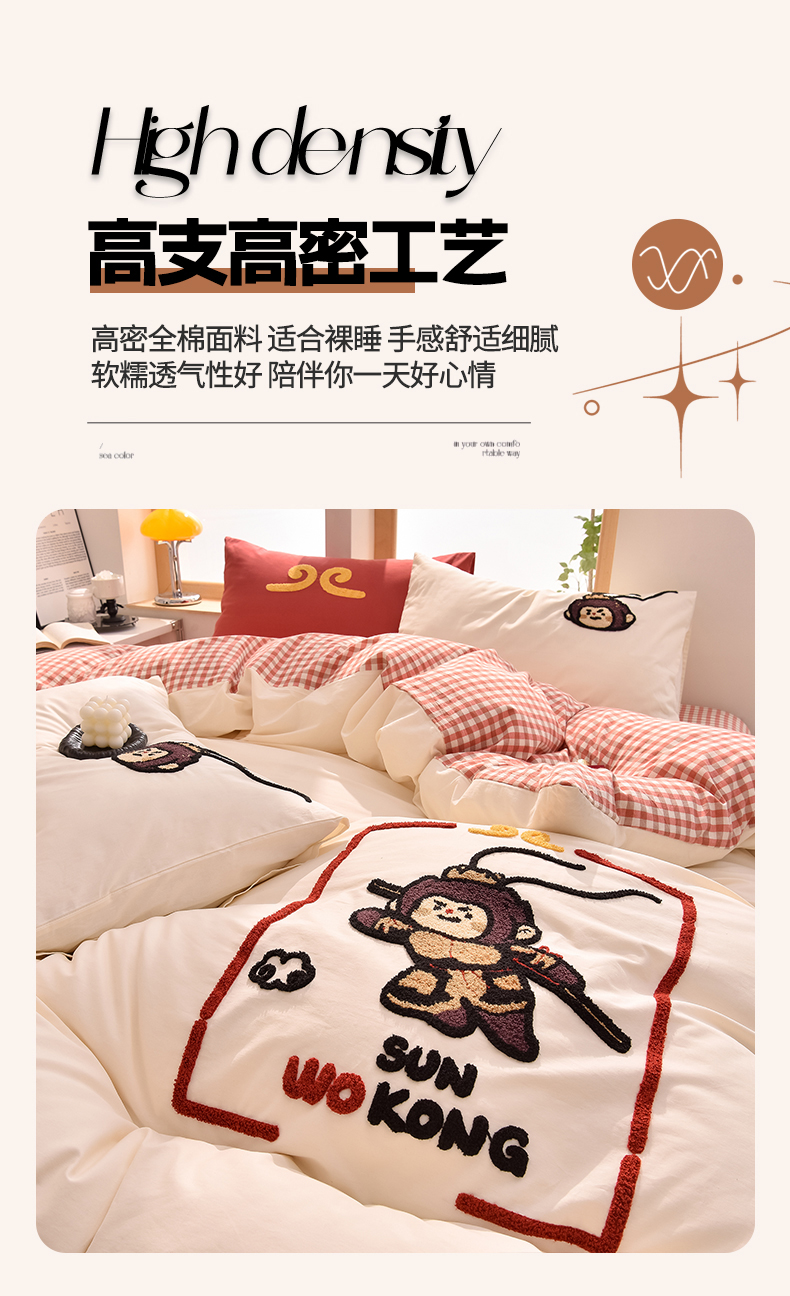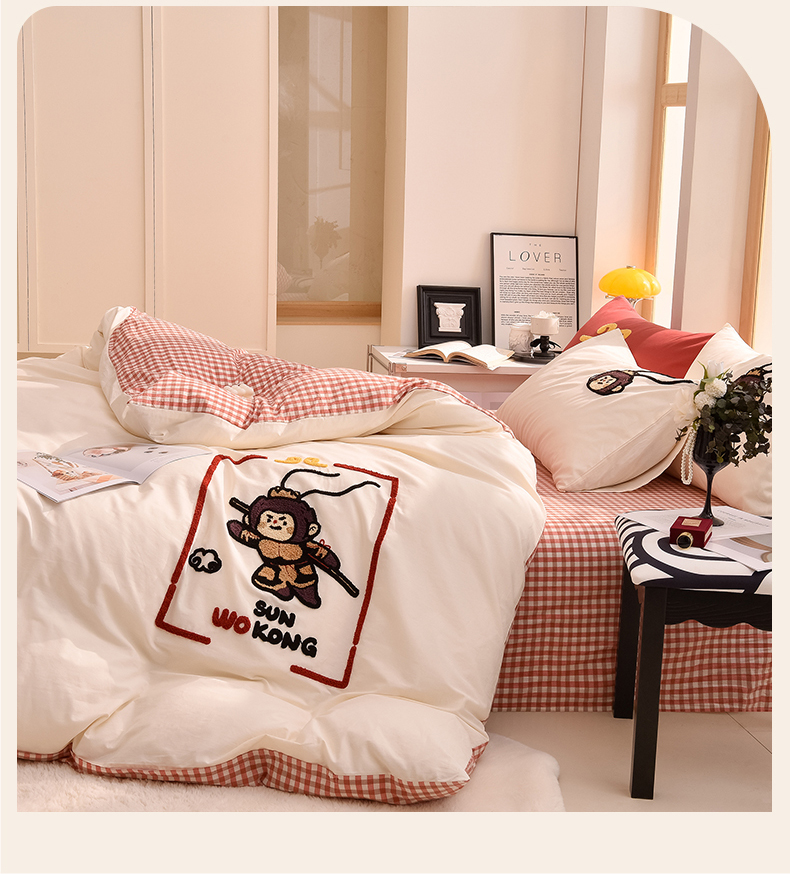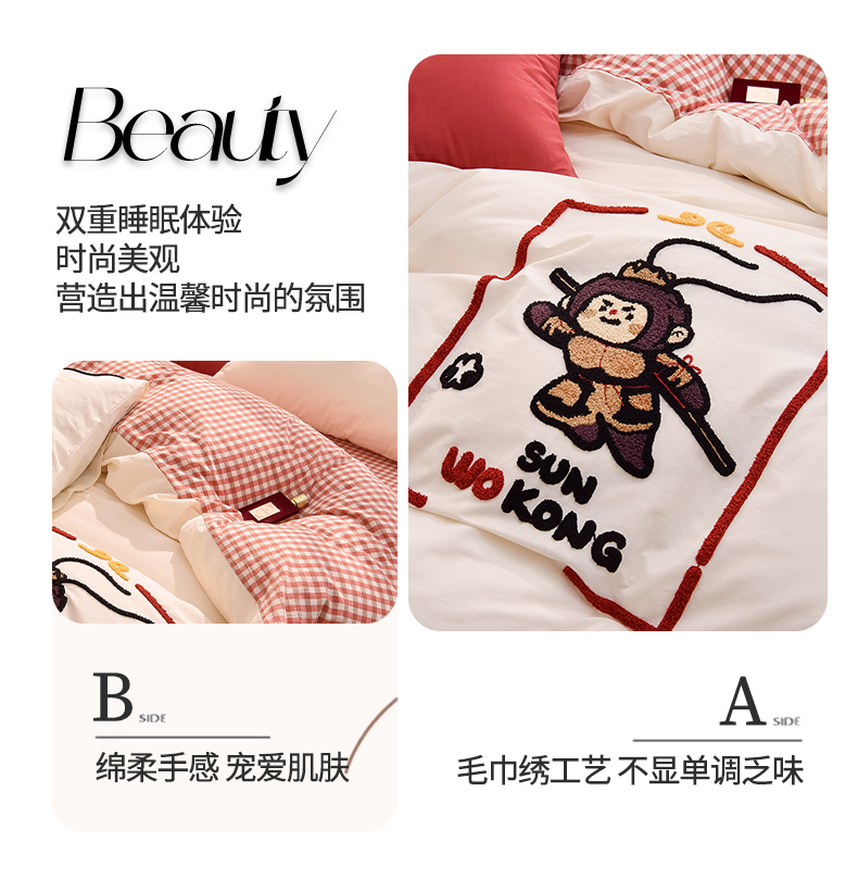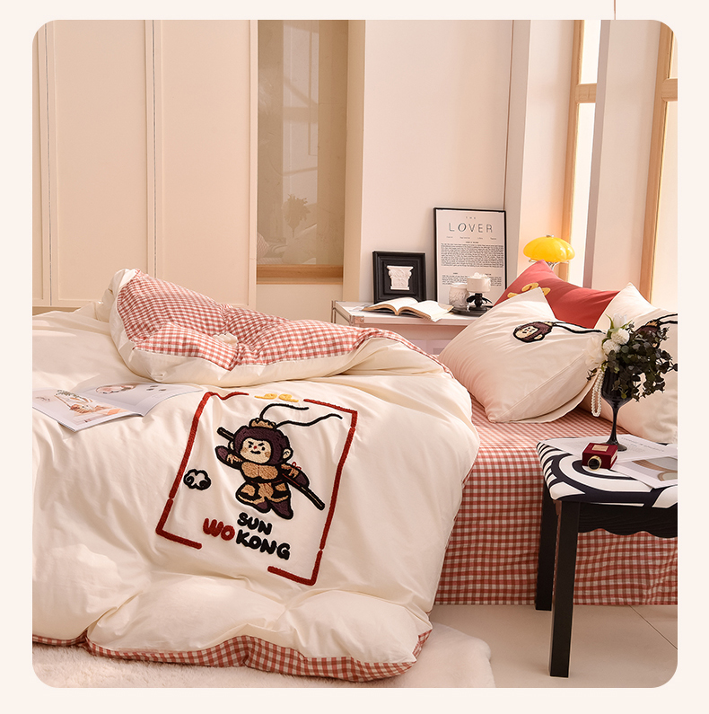 当前位置: 91家纺网 > 商品网购 > 床品套件 > 四件套 > 全棉普通四件套 > 炫拼家纺 2026新款多巴胺系列A类全棉40支水洗棉卡通毛巾绣四件套 多巴胺-美猴王