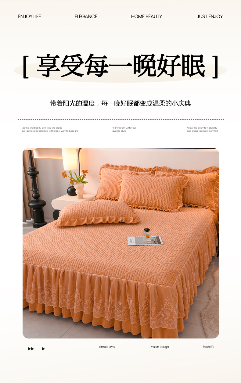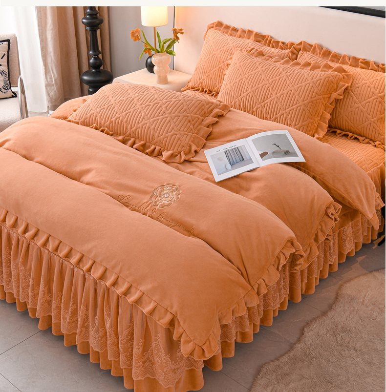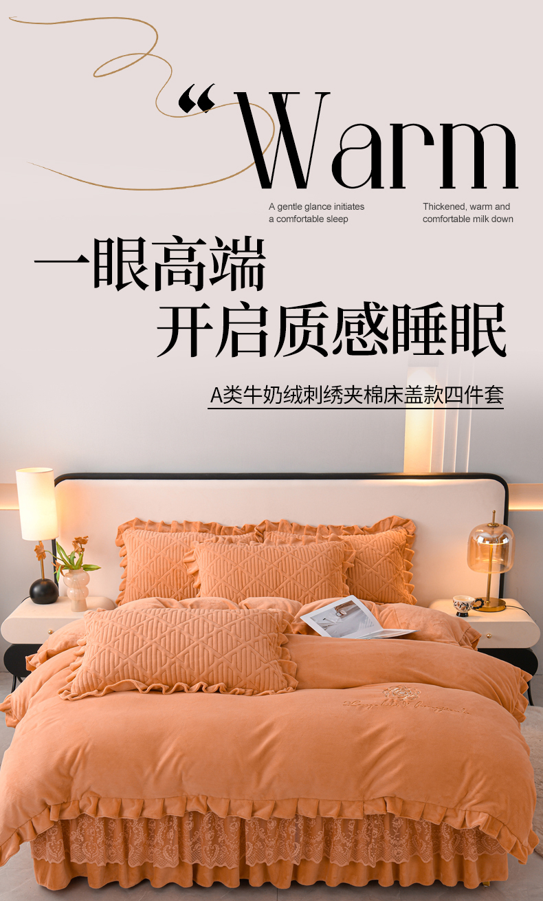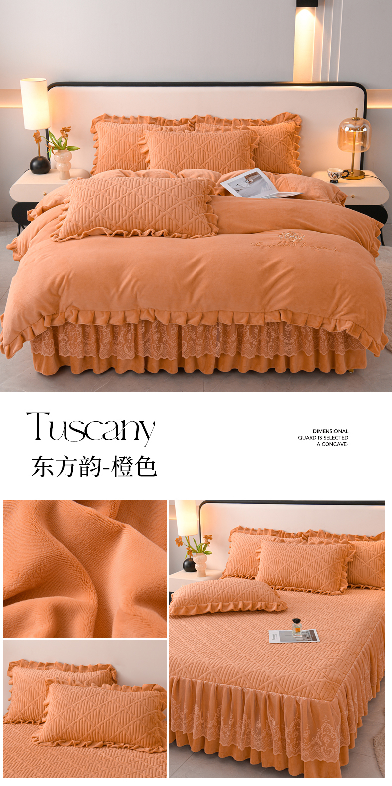 当前位置: 91家纺网 > 商品网购 > 床品套件 > 四件套 > 牛奶绒四件套 > 优家居工厂店 2026新品240克高克重牛奶绒韩版牛奶绒夹棉床裙四件套床裙三件套直播热款-东方韵 东方韵-橙色