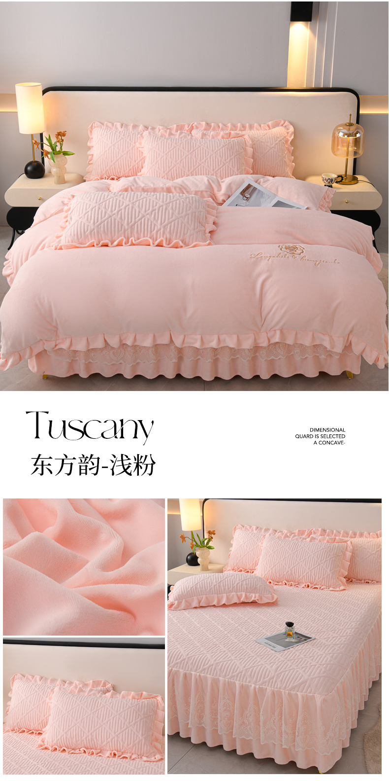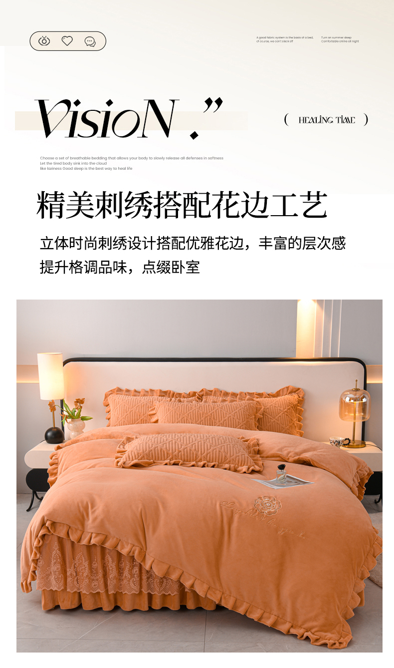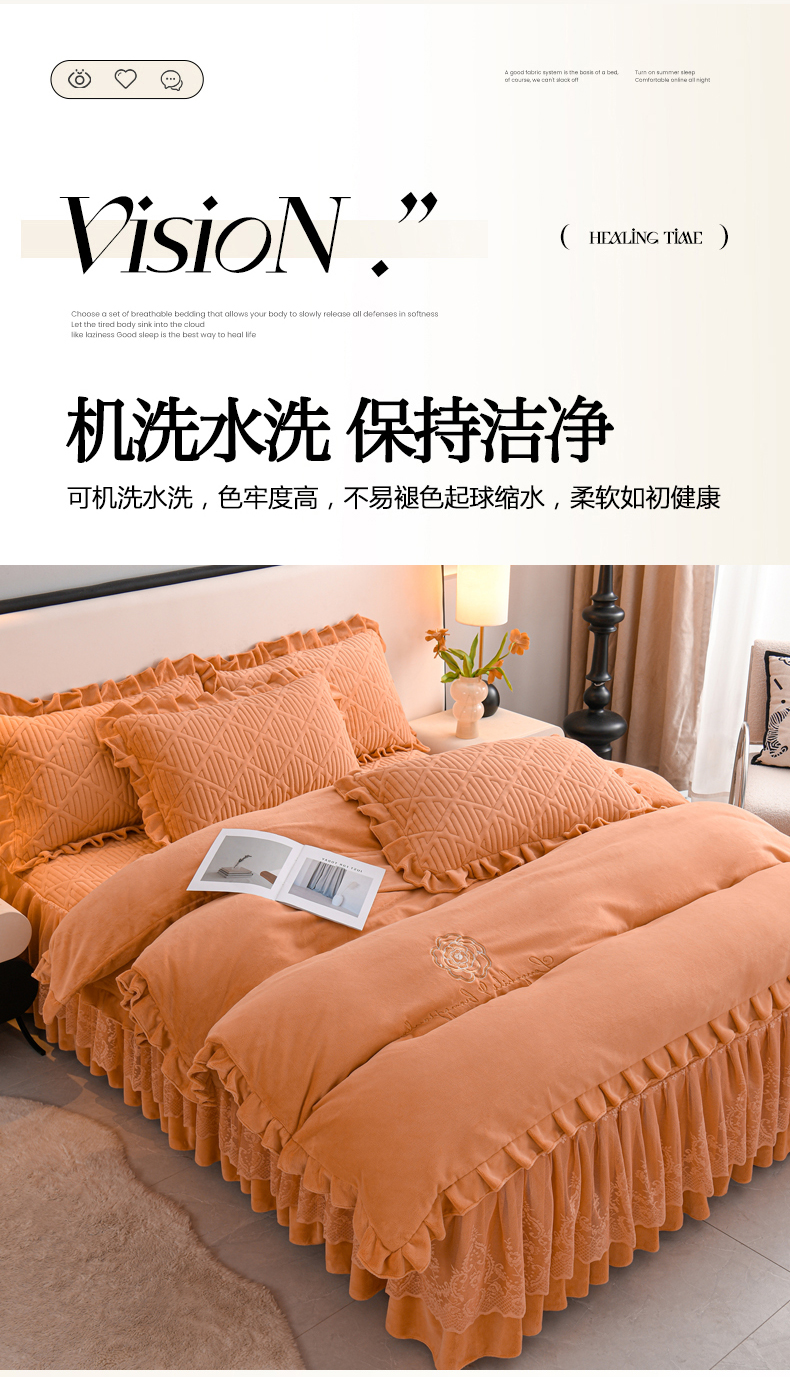 当前位置: 91家纺网 > 商品网购 > 床品套件 > 四件套 > 牛奶绒四件套 > 优家居工厂店 2026新品240克高克重牛奶绒韩版牛奶绒夹棉床裙四件套床裙三件套直播热款-东方韵 东方韵-橙色