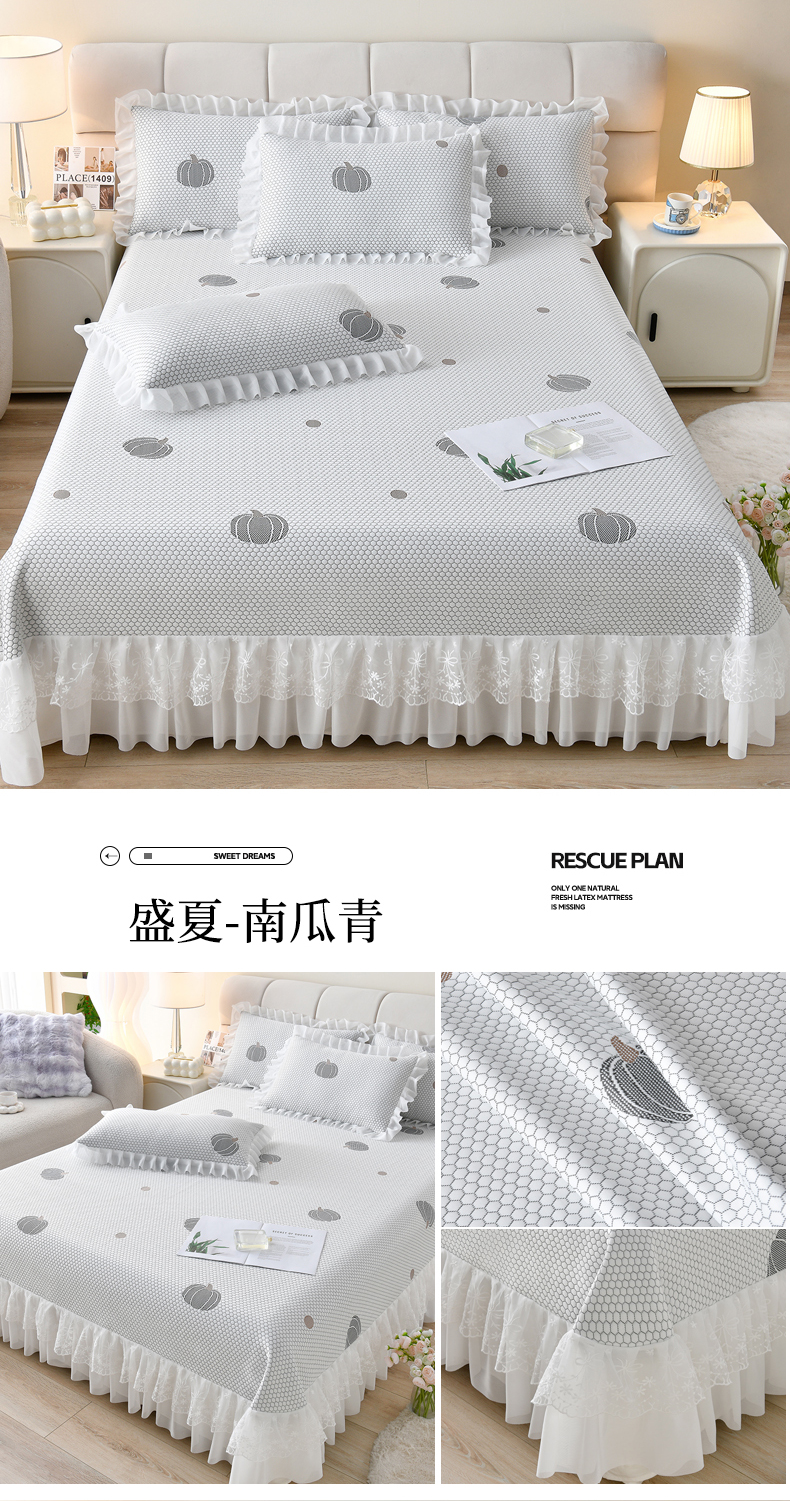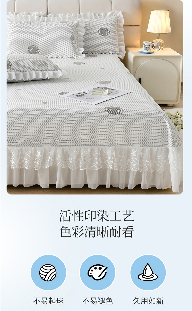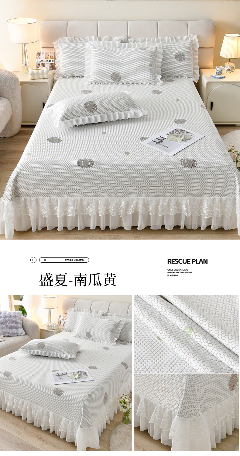 • 91家纺网 家纺一手货源 找家纺 优家居工厂店 A类2026新款凉感豆豆提花凉席床裙款床盖三件套高档蕾丝花边可机洗水洗 盛夏-南瓜黄