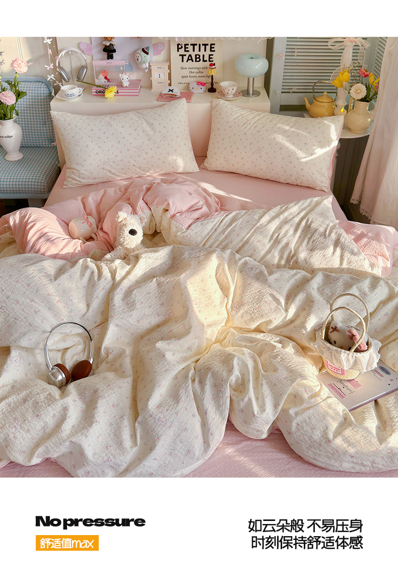 当前位置: 91家纺网 > 商品网购 > 床品套件 > 四件套 > 其它四件套 > 优选 2026新款110g小清新高克重高品质直播热卖款A类泡芙棉双层纱四件套 甜昔
