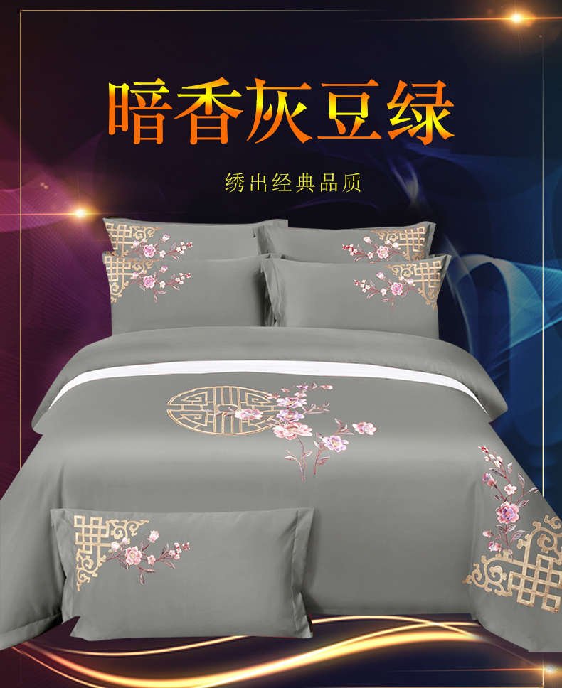商品名称:慕她家纺 2026年全棉纯棉婚庆四件套大红色刺绣结床上用品 暗香 灰豆绿