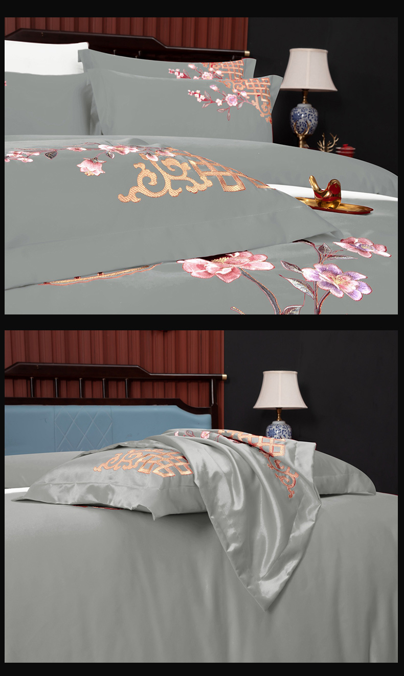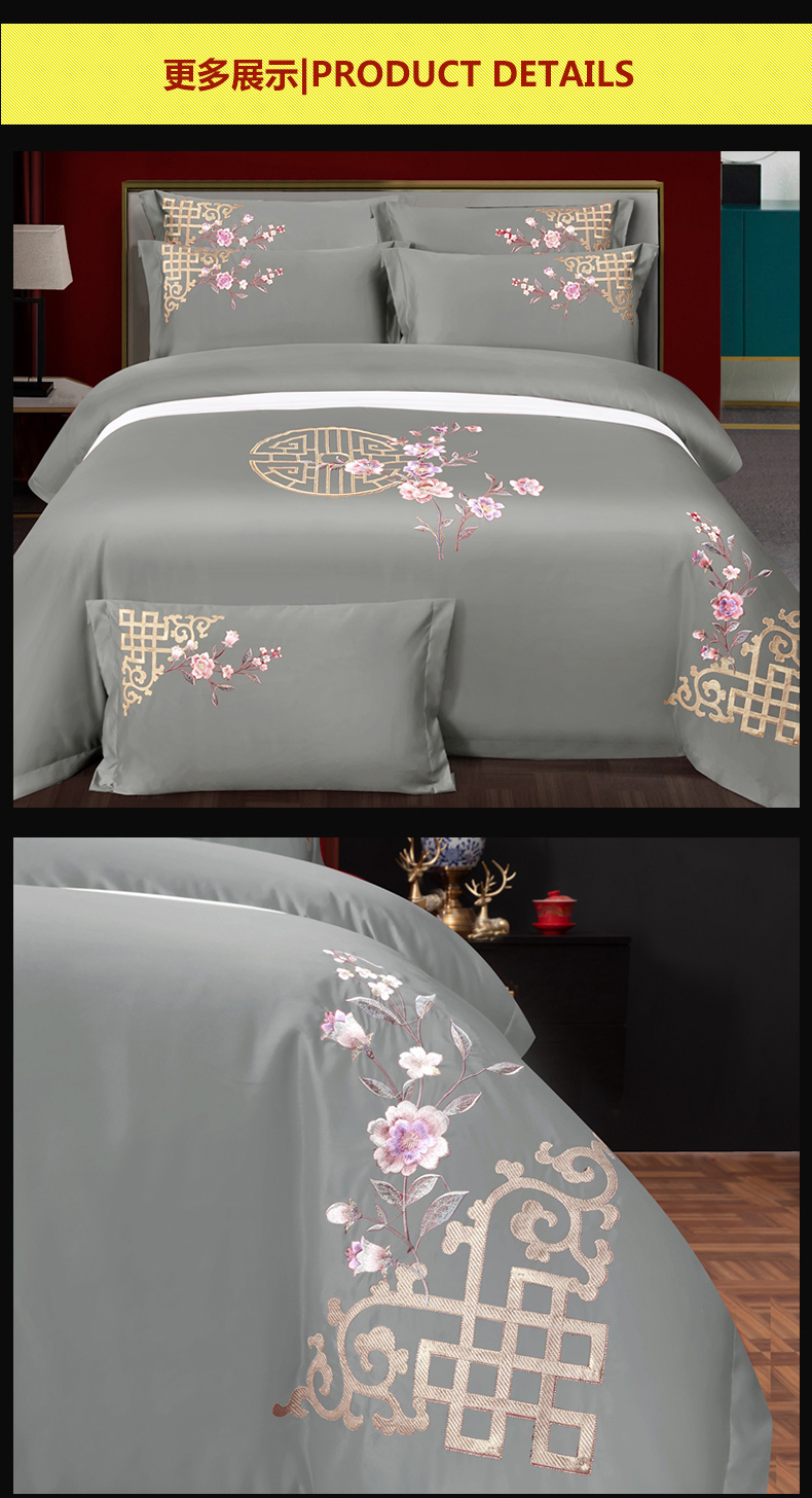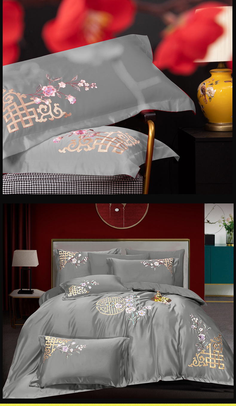 慕她家纺 2026年全棉纯棉婚庆四件套大红色刺绣结床上用品 暗香 灰豆绿