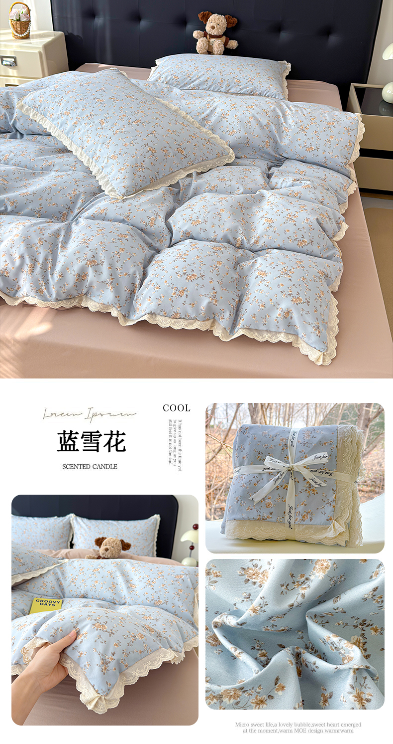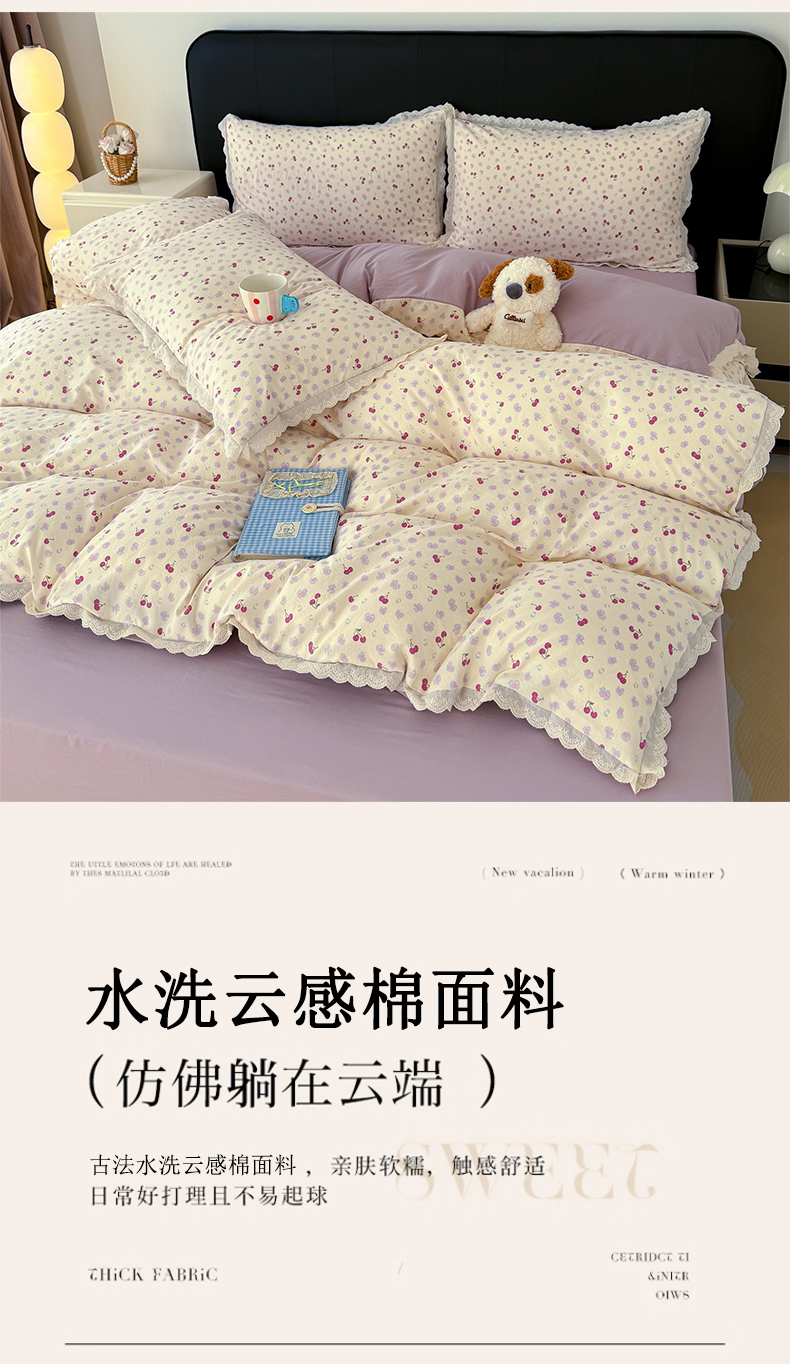 商品名称:铺尚美家纺 2026新款田园韩版花边款小碎花古法水洗仿棉A类云感棉四件套 萌宠
