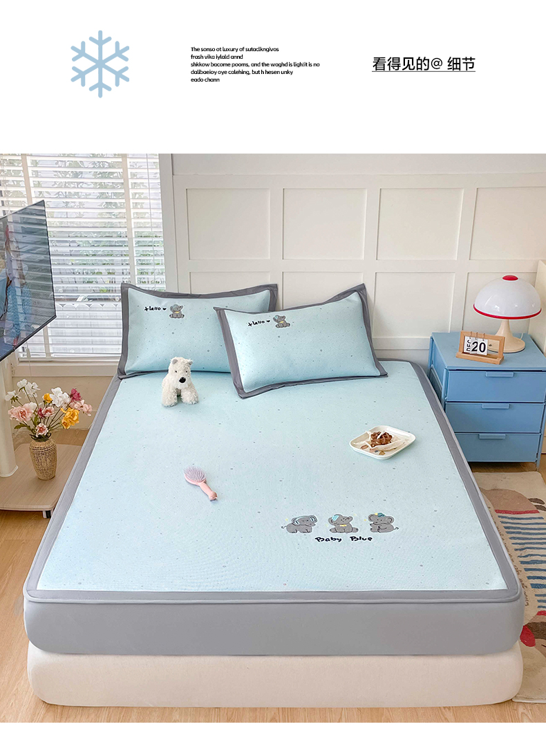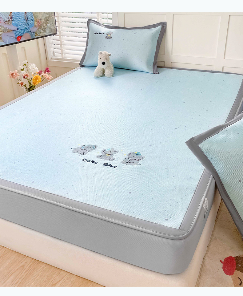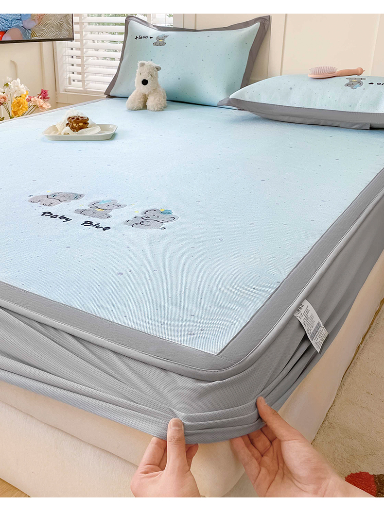 商品名称:雅居纺家纺 2026新款A类加厚三明治底绣花冰藤席床笠款凉席席子 小象家族