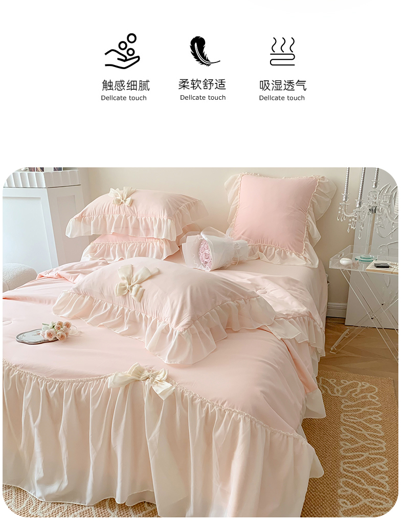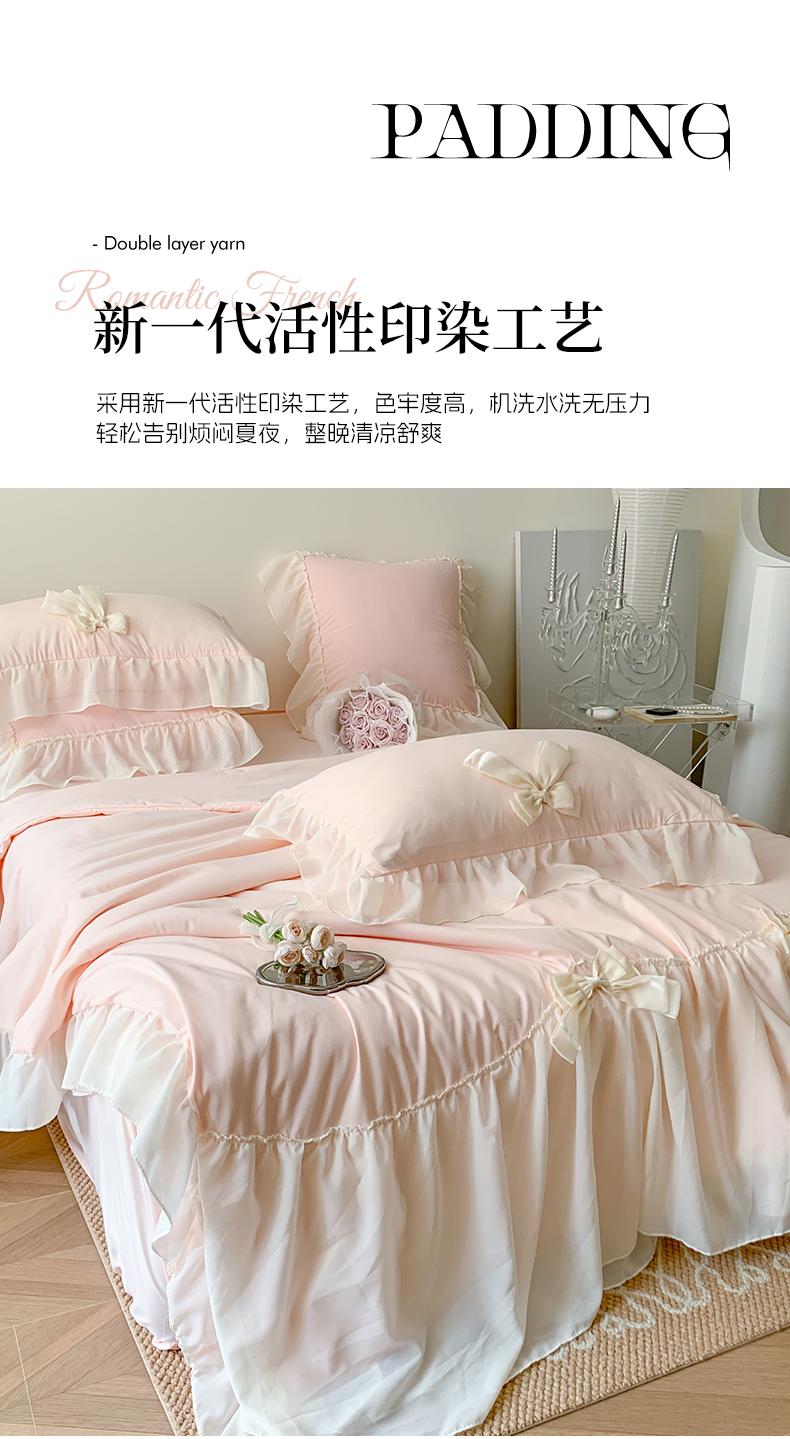 (总)吾欢心 2026新款小香风可可系列双层花边床盖款夏被四件套被子被芯,可可奶茶绿,可可奶昔粉,可可柠檬黄,可可温柔紫,可可樱桃粉