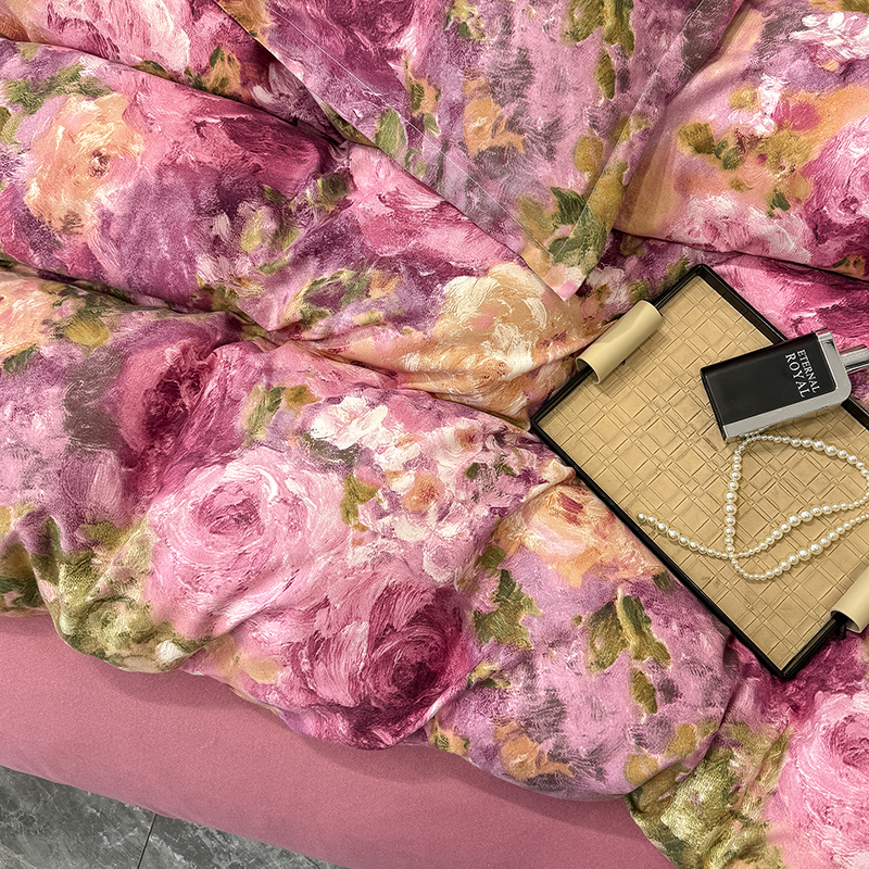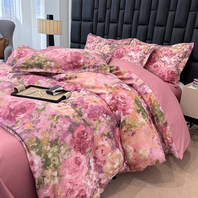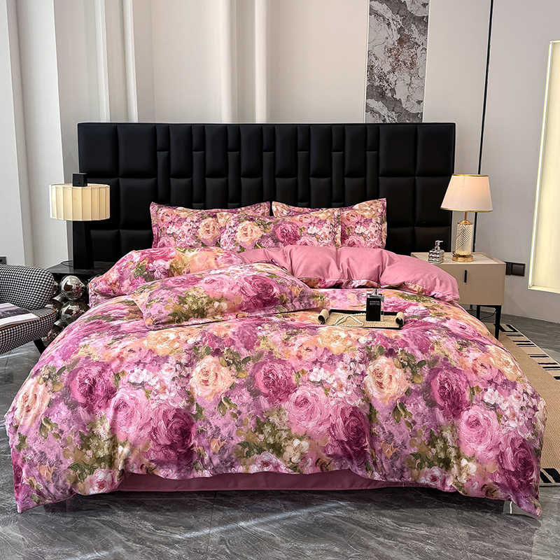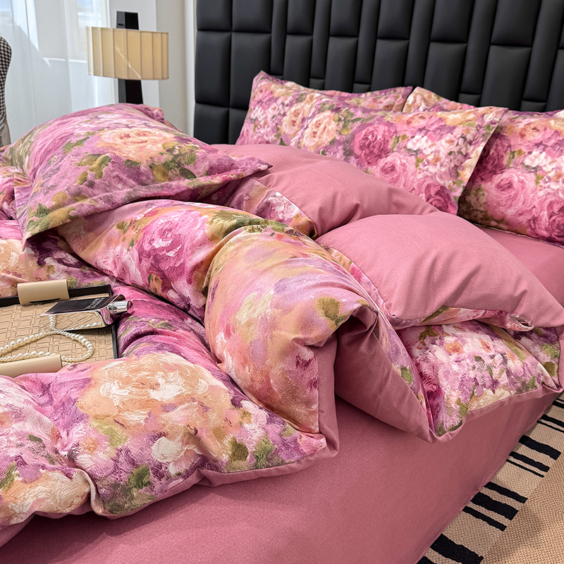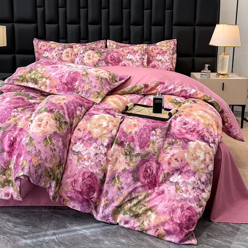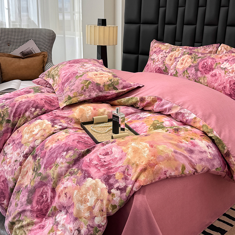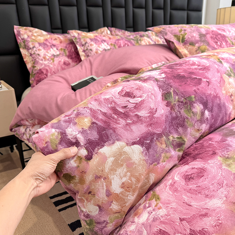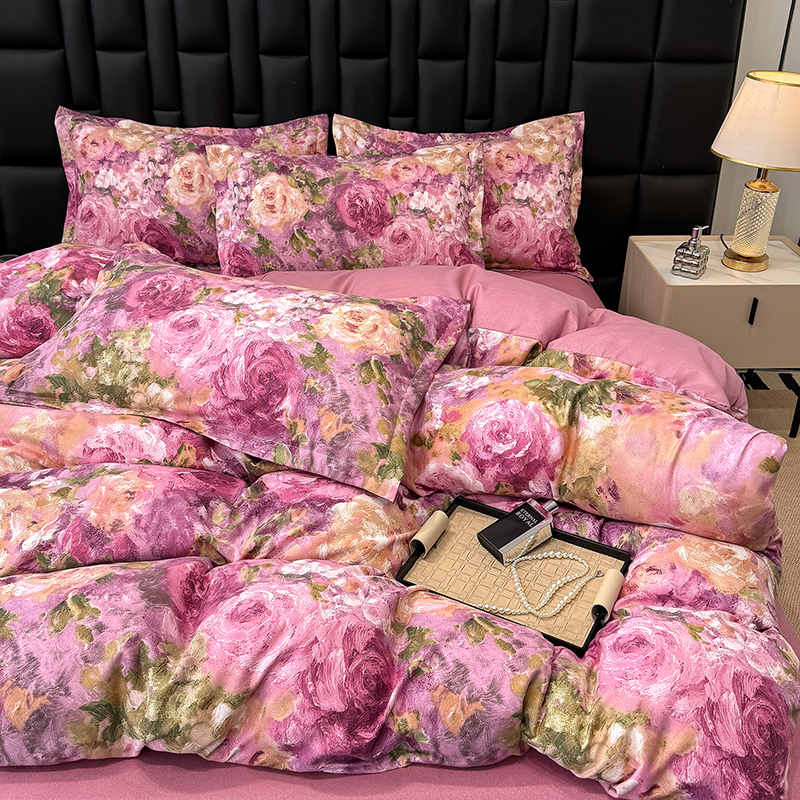 桔禾家纺 2026新款田园花卉小清新直播加厚植物羊绒四件套高克重磨毛跨境四件套 大量现货 紫气东来
