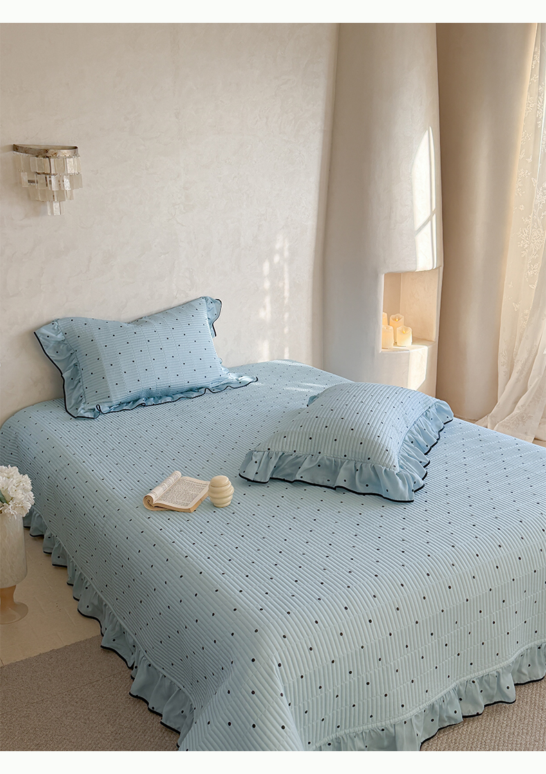 • 91家纺网 家纺一手货源 找家纺 琳可家居 2026新款波点天丝系列花边款100%莱赛尔纤维天丝床盖可机洗A类床盖三件 海洋蓝